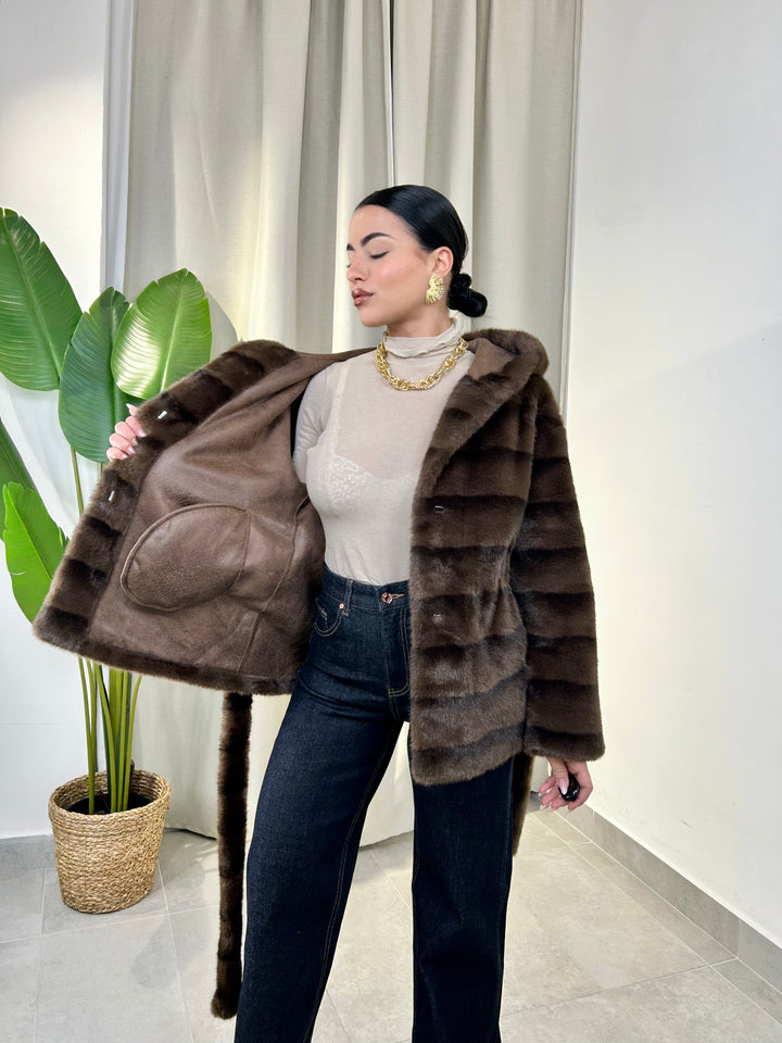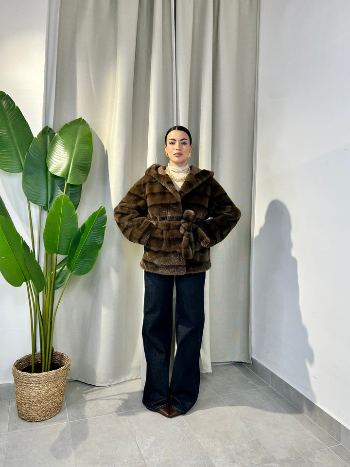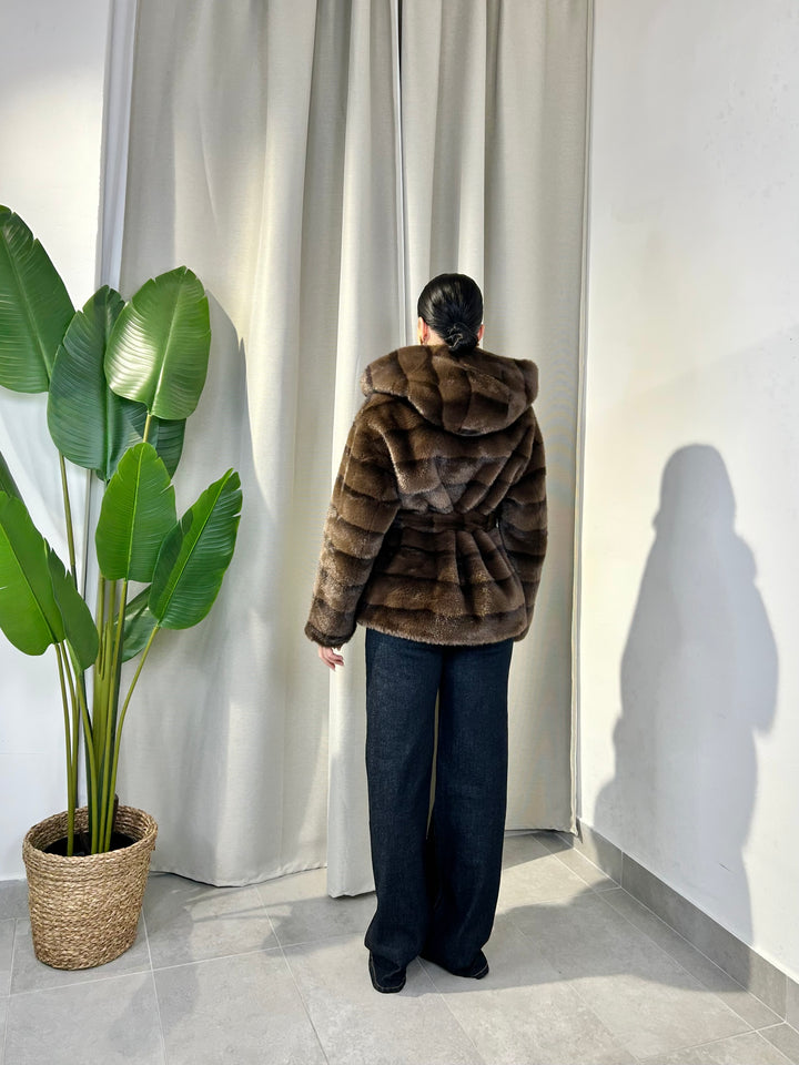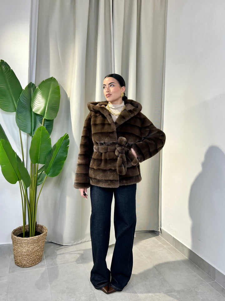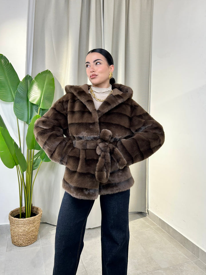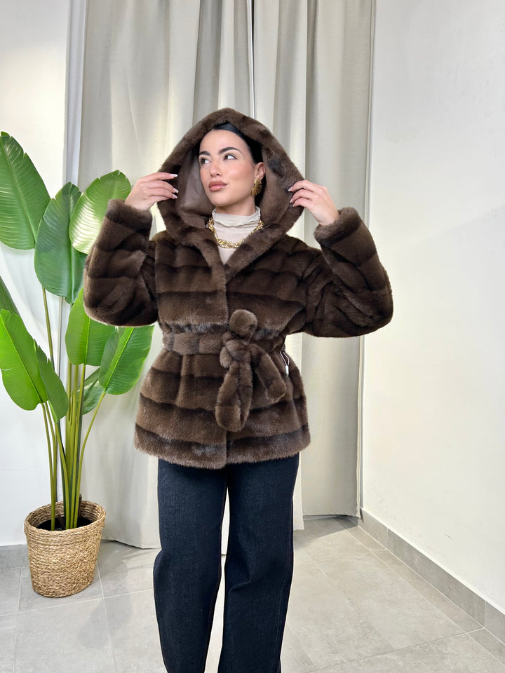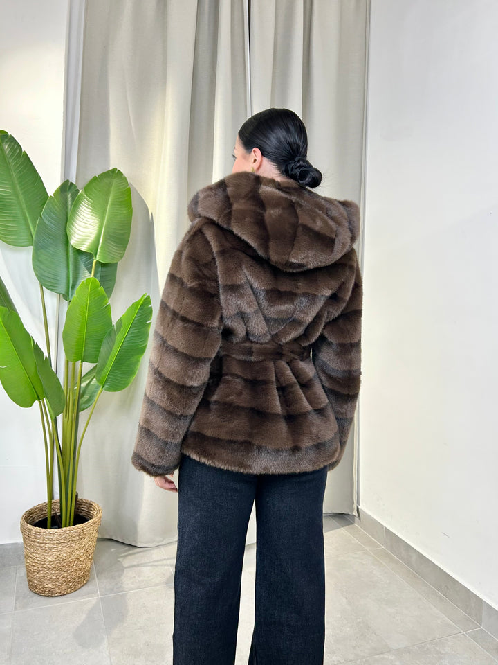 -Ecopelliccia Mod.Visone con fusciacca in vita e cappuccio; Interno foderato in ecopelle;