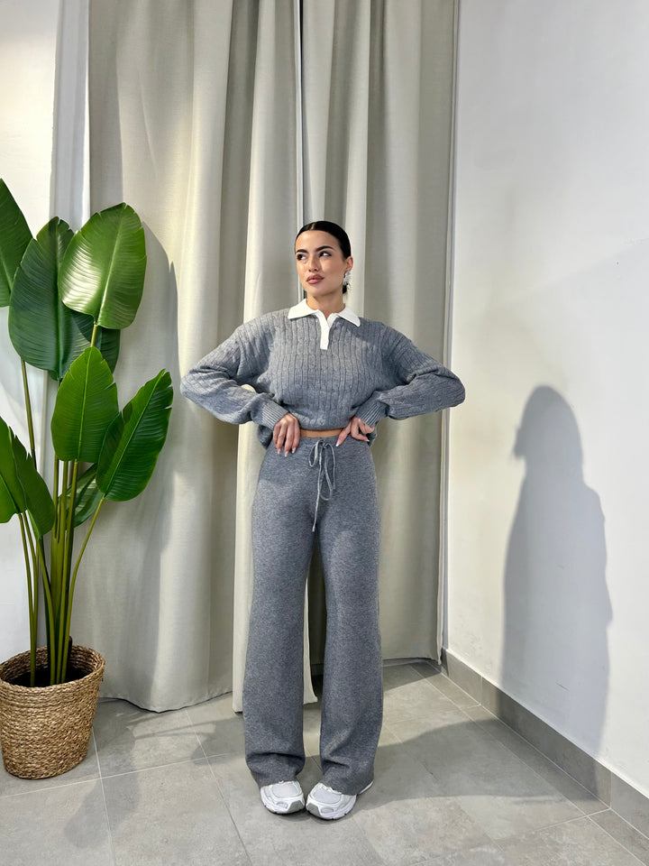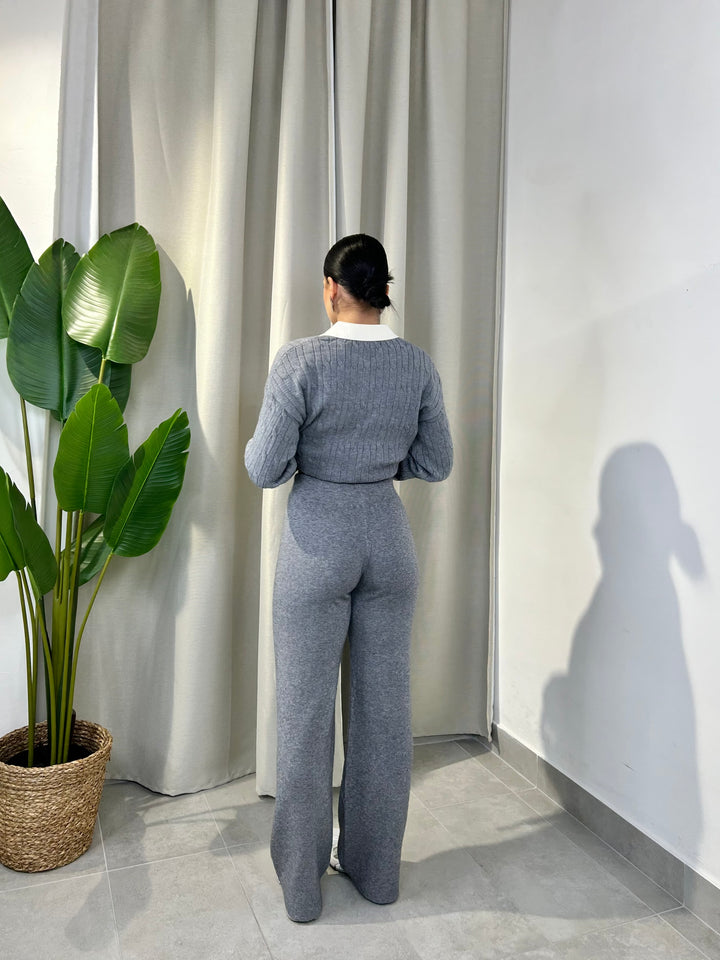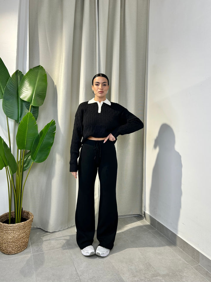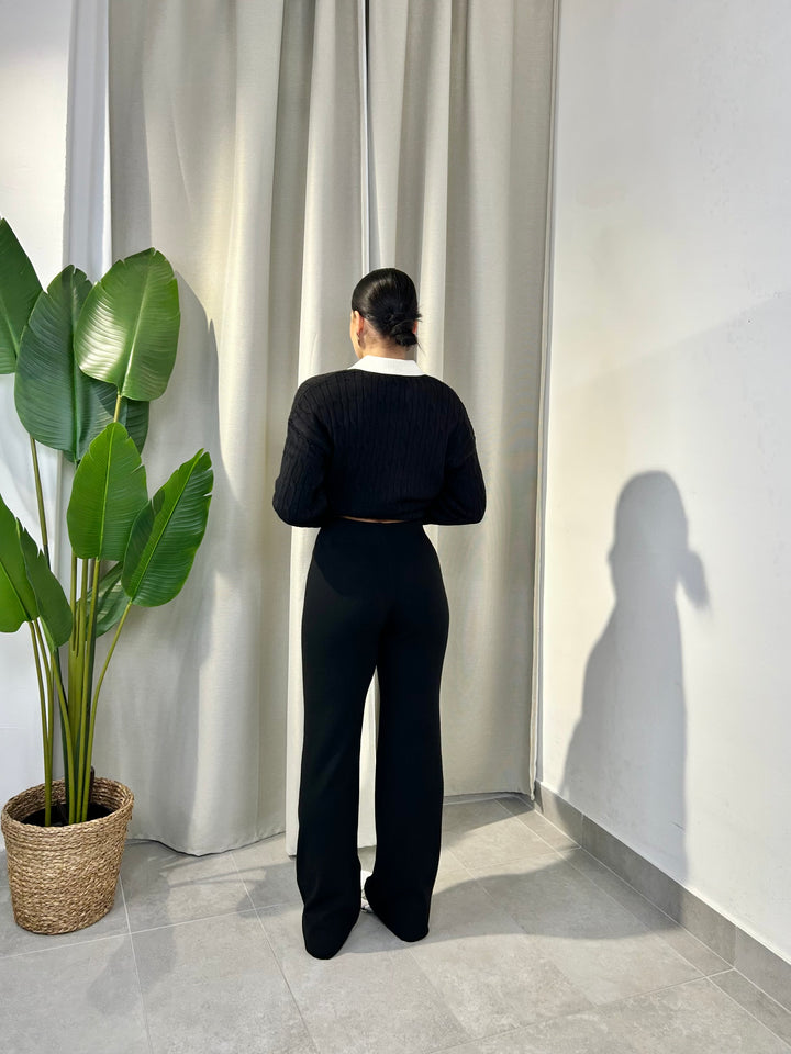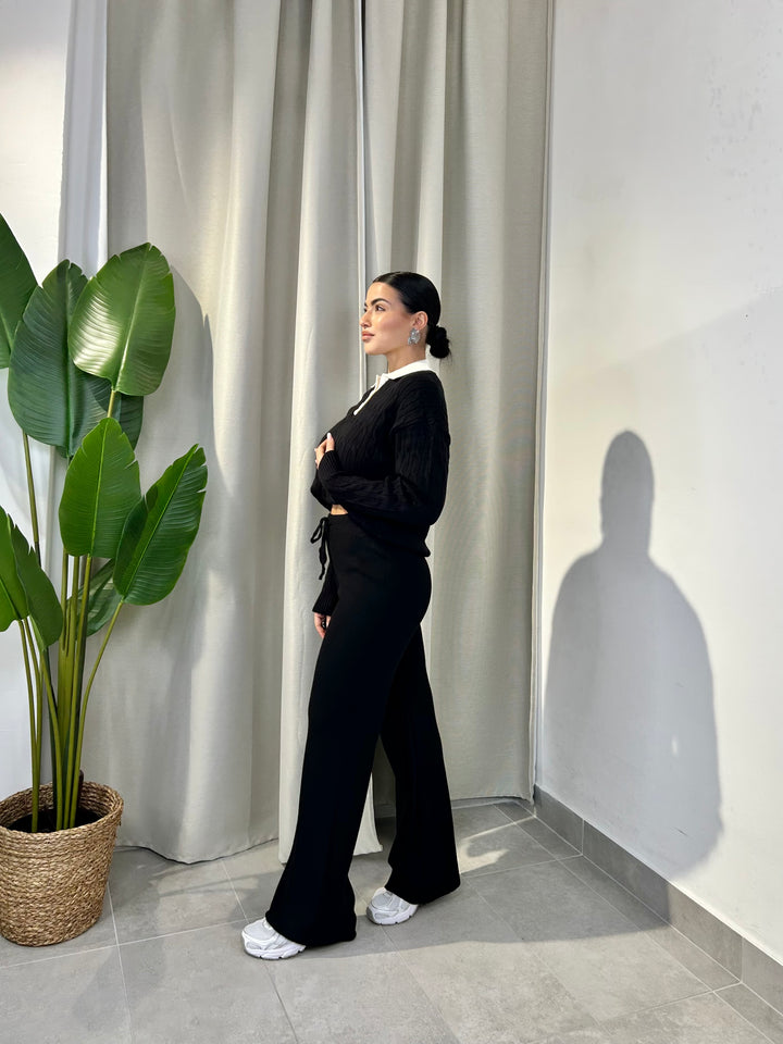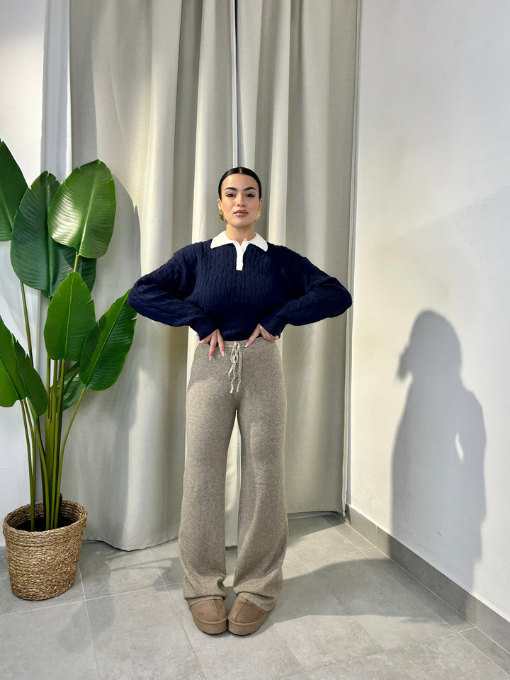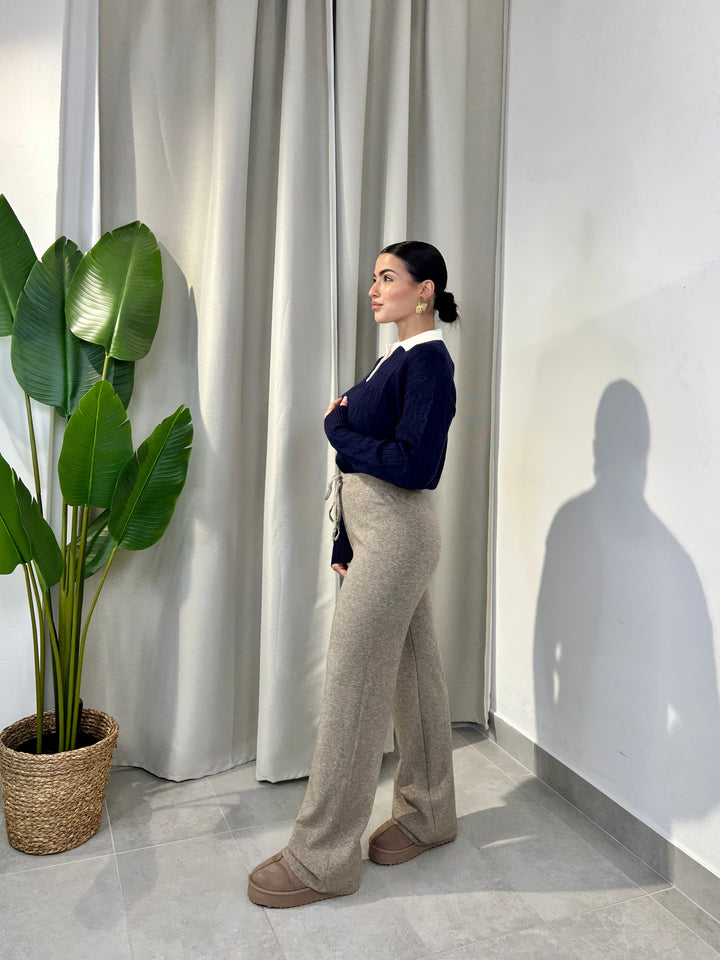 -Pantalone palazzo in lana rasata con elastico in vita regolabile;