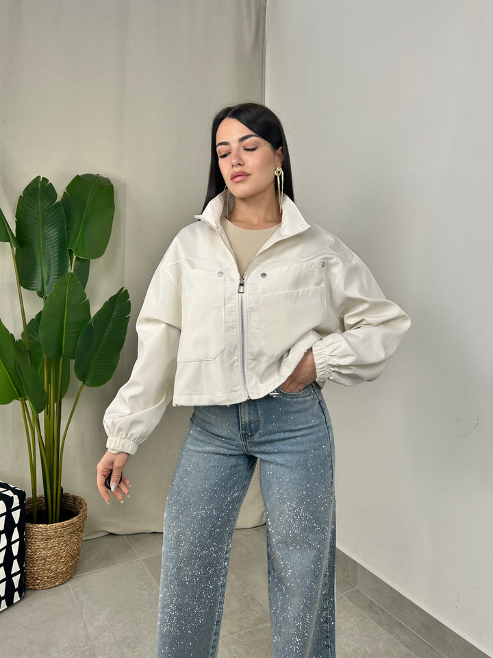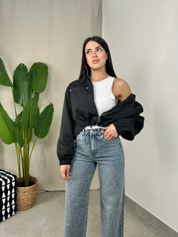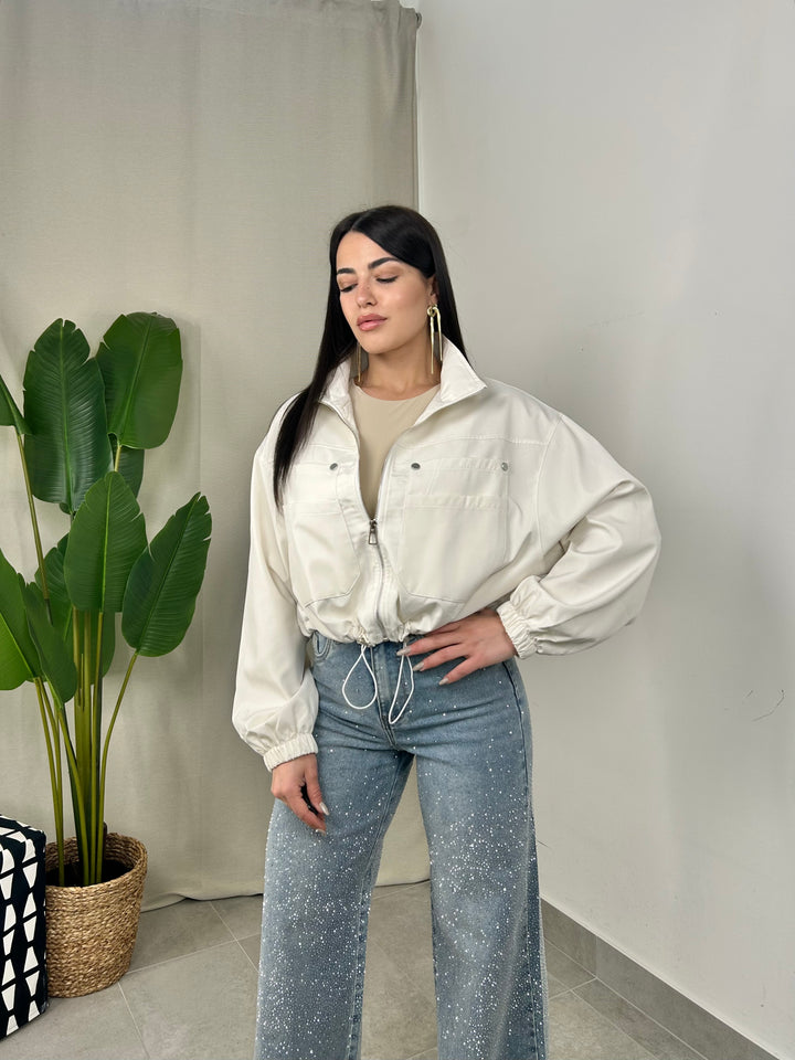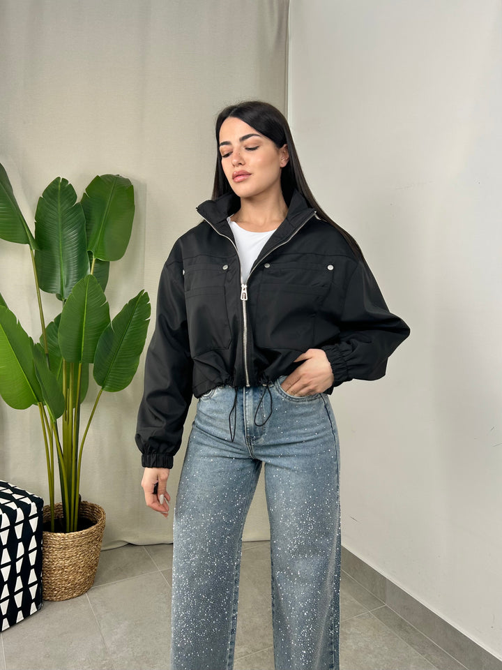-Giubbotto mezzo collo in tessuto tecnico con doppio taschino e coulisse regolabile in vita;