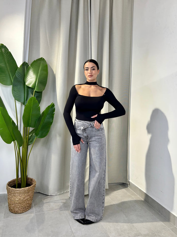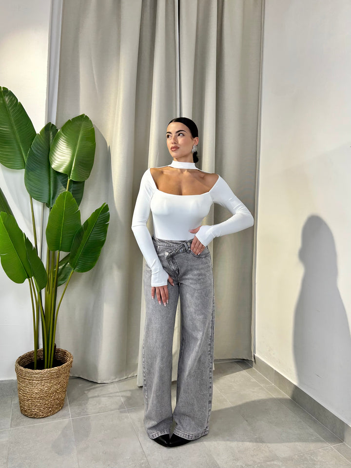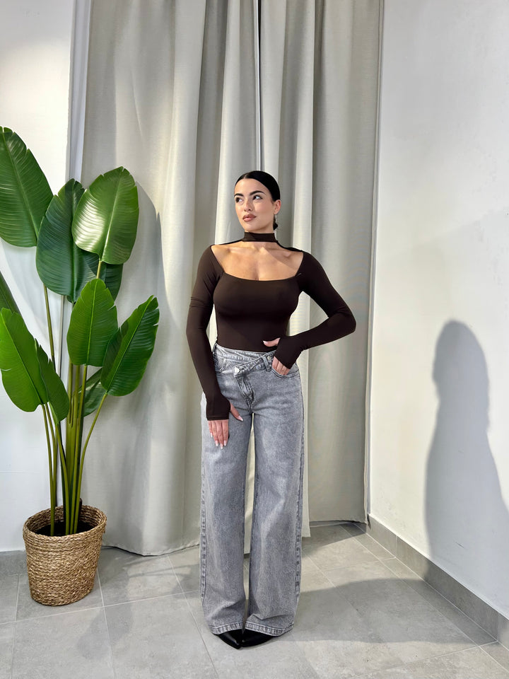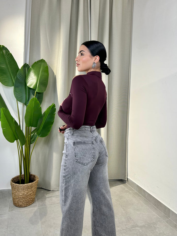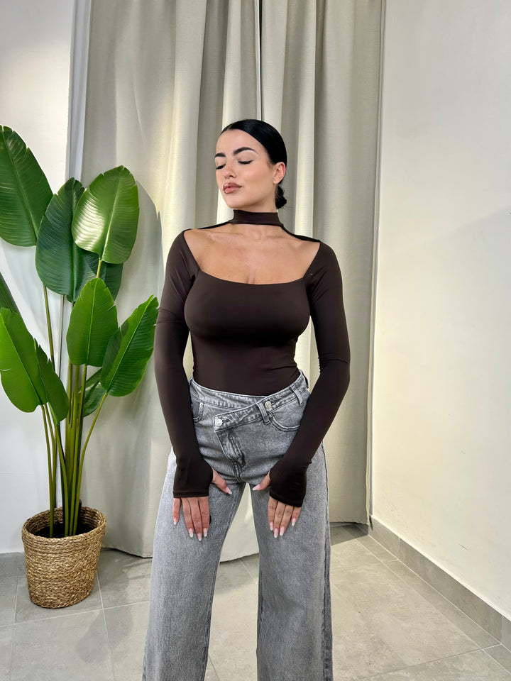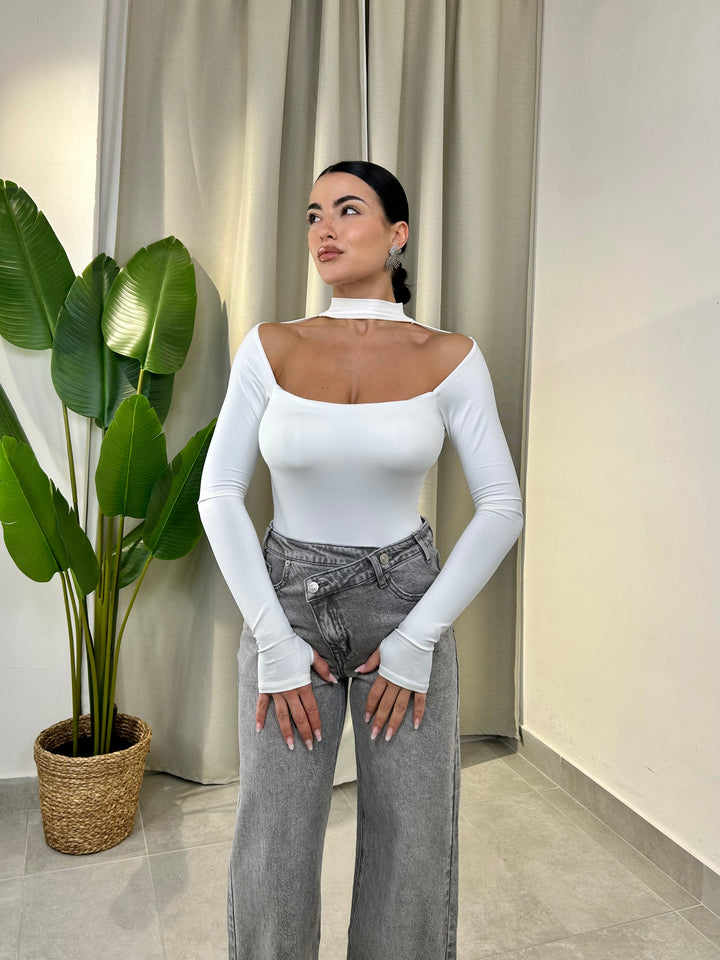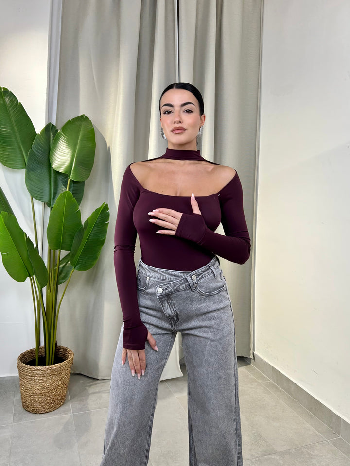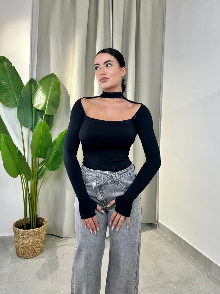 -Body in lycra mezzo collo con apertura sul petto e coppe preformate;Manica a guanto;