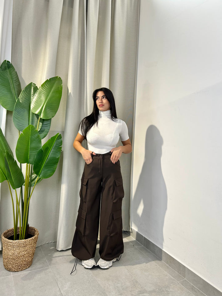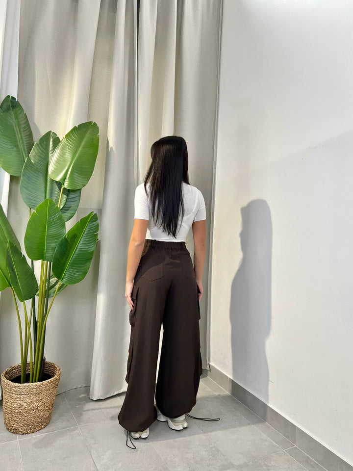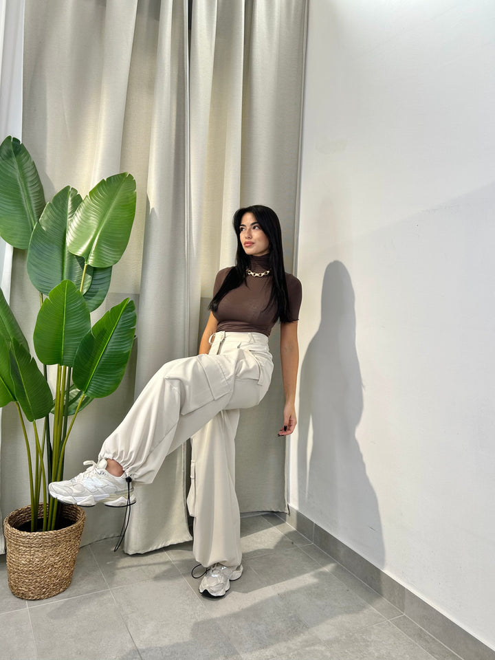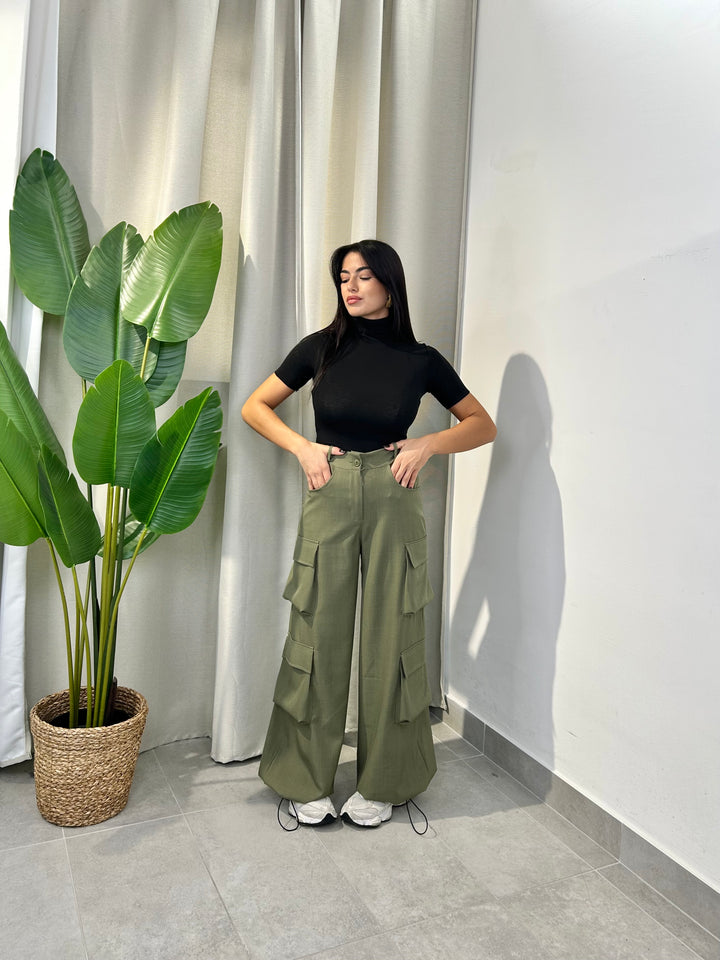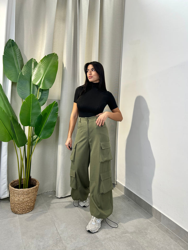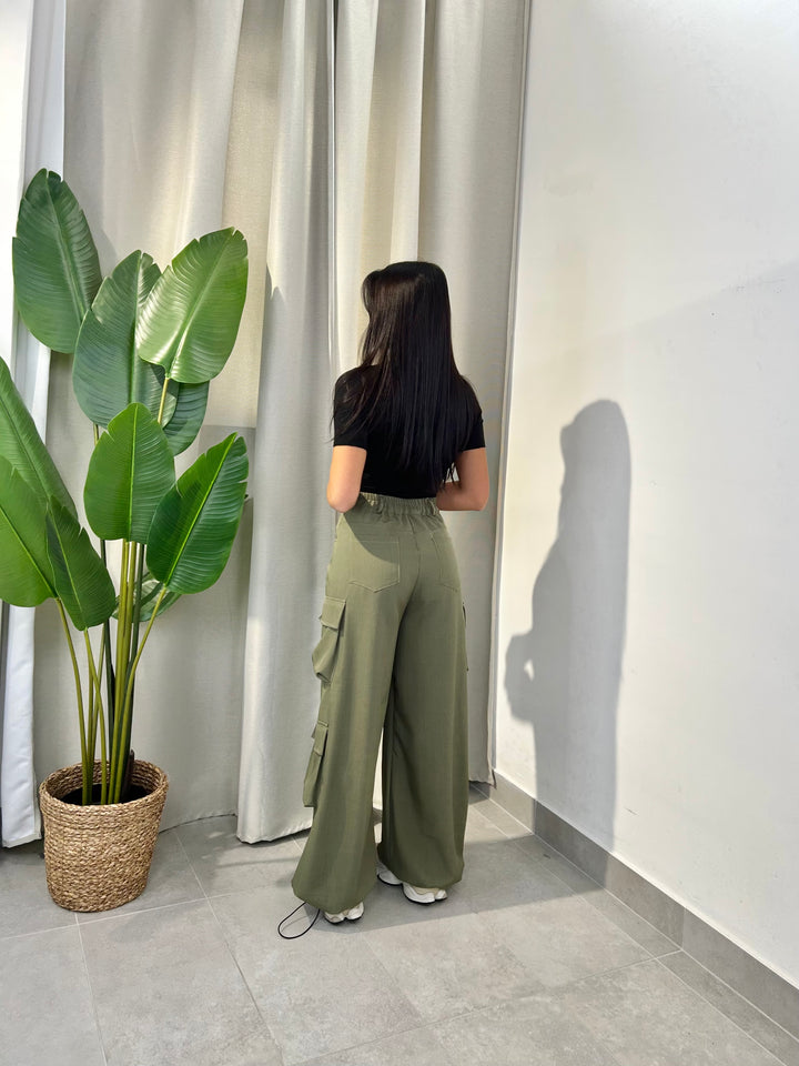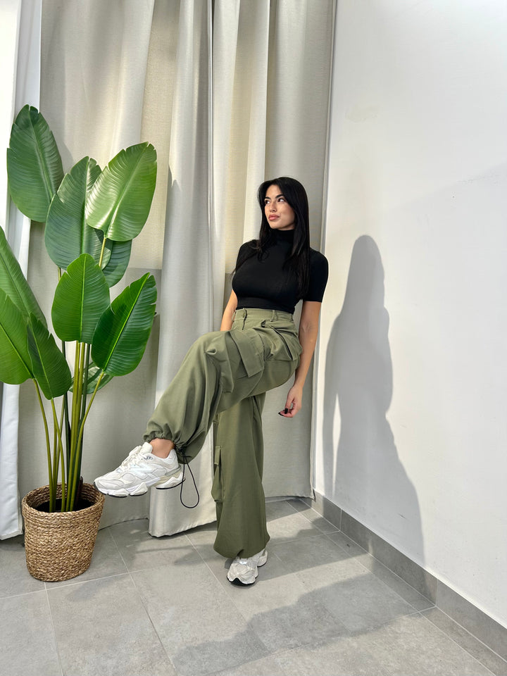 -Pantalone cargo in tessuto scivoloso con coulisse regolabile sul fondo;Bottone in vita ed elastico sul retro;