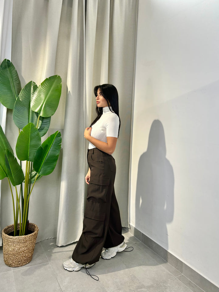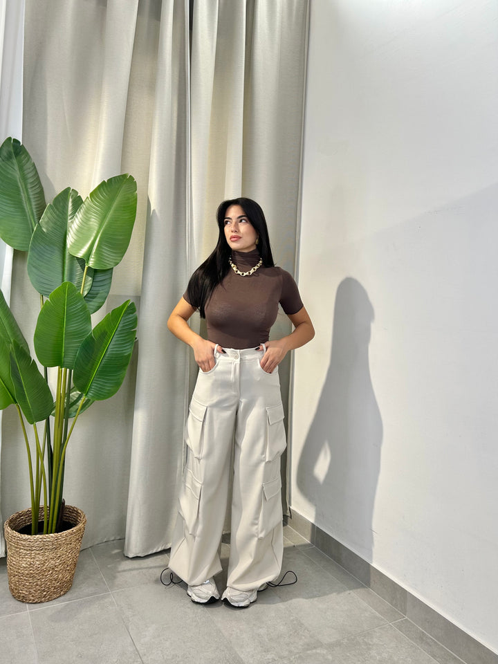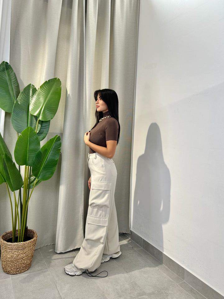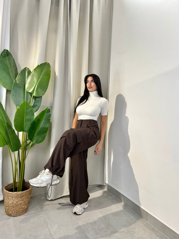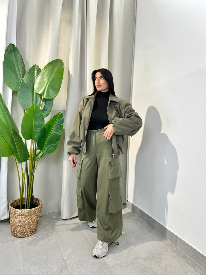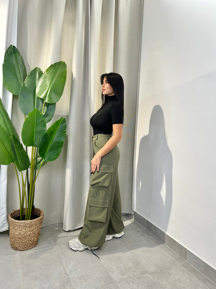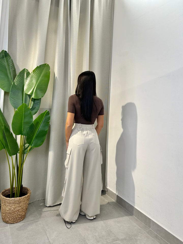 -Pantalone cargo in tessuto scivoloso con coulisse regolabile sul fondo;Bottone in vita ed elastico sul retro;