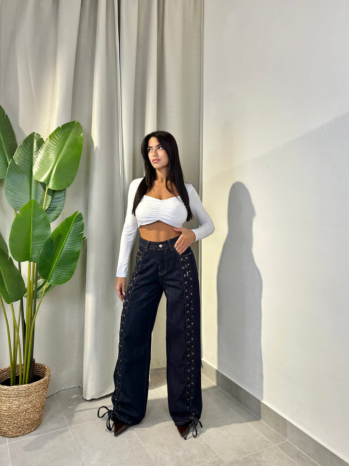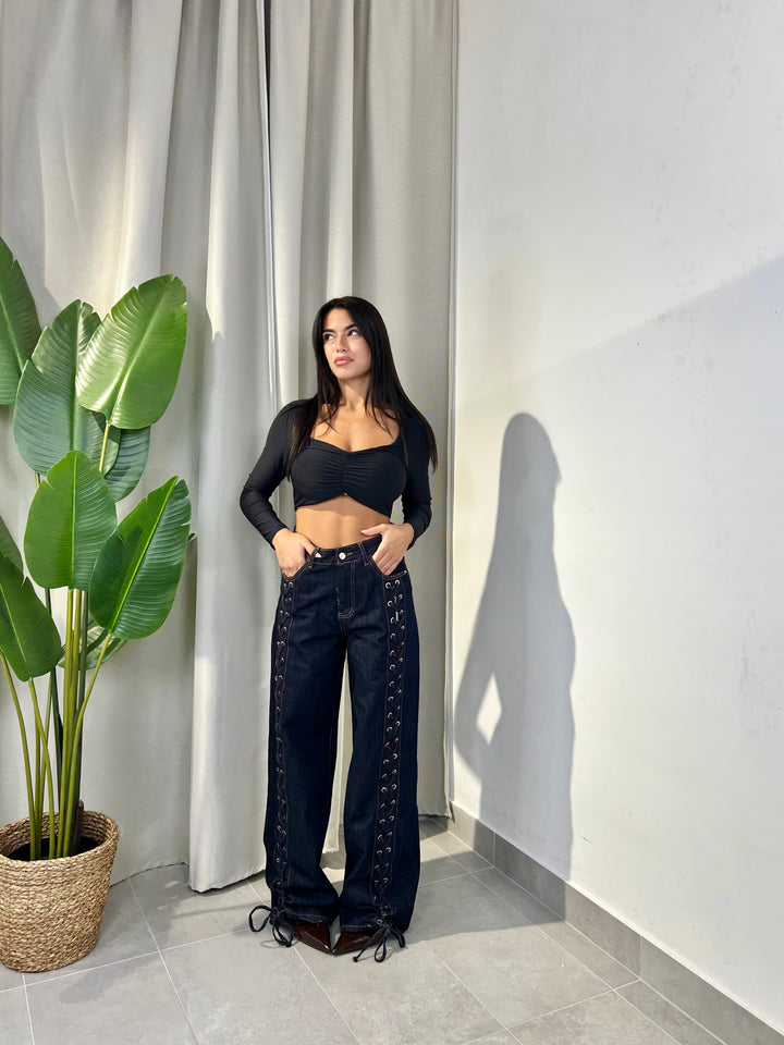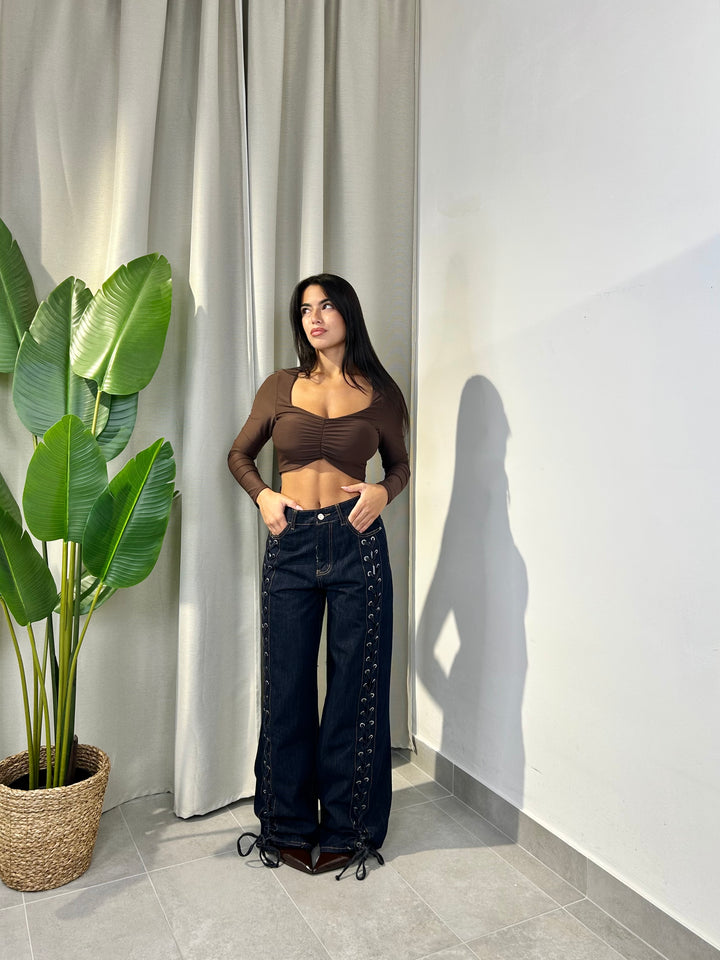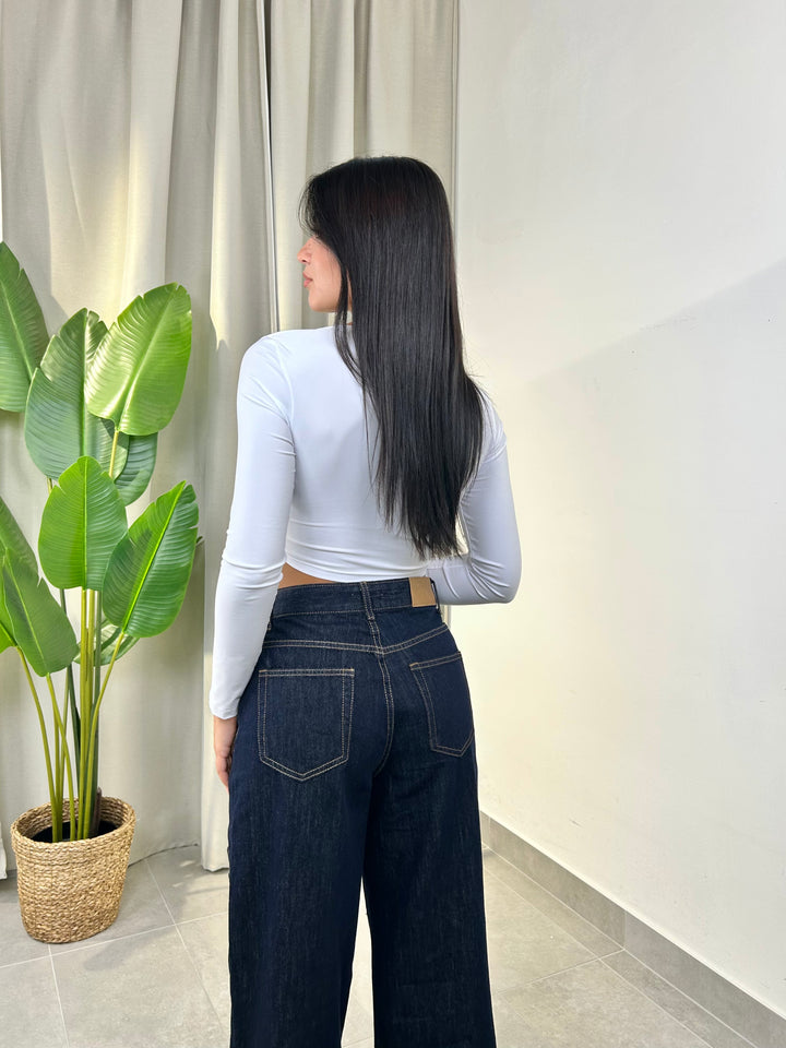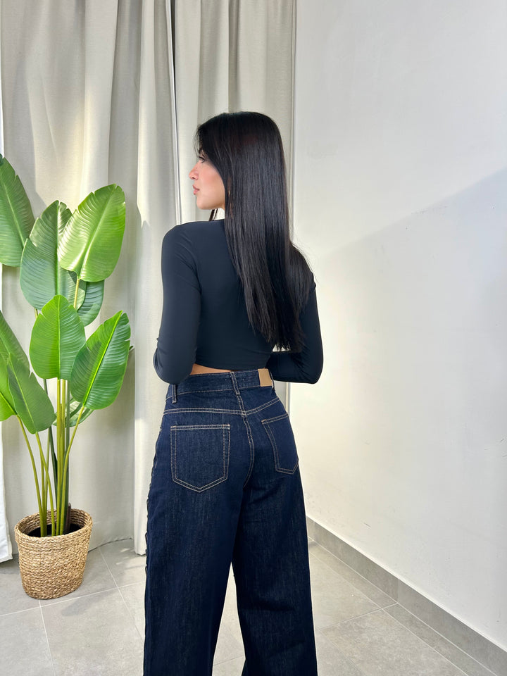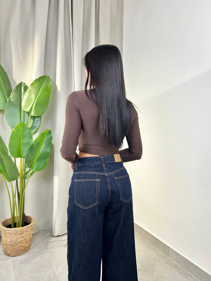 -Maglia crop in lycra con drappeggio centrale e coppe preformate;