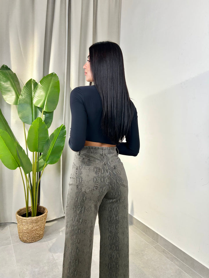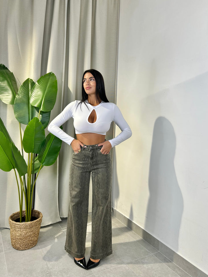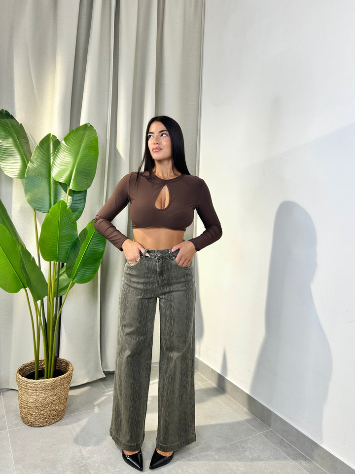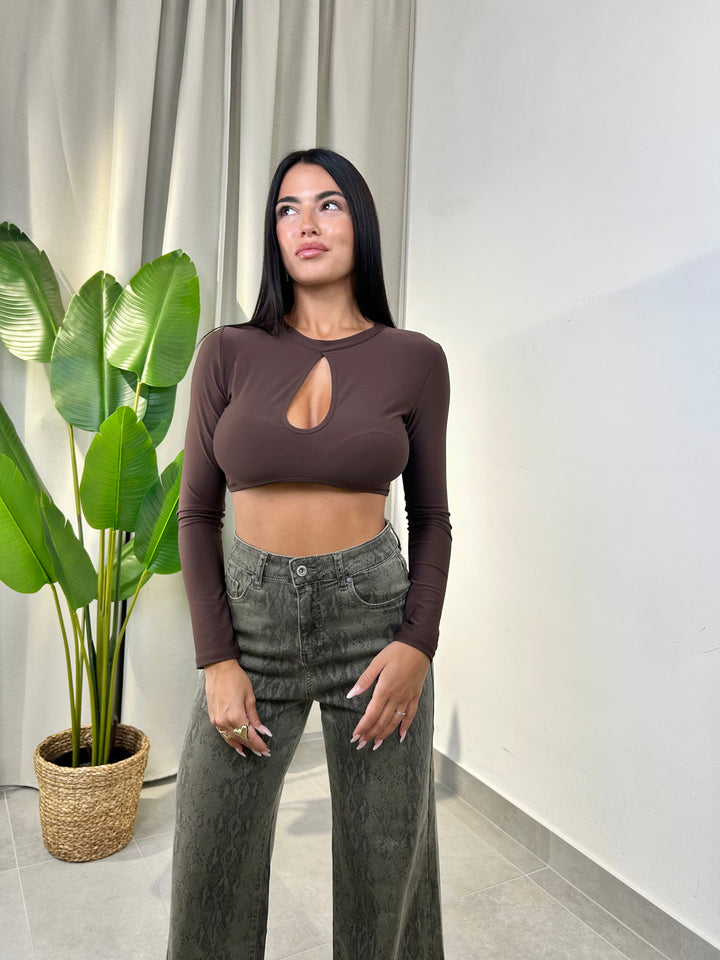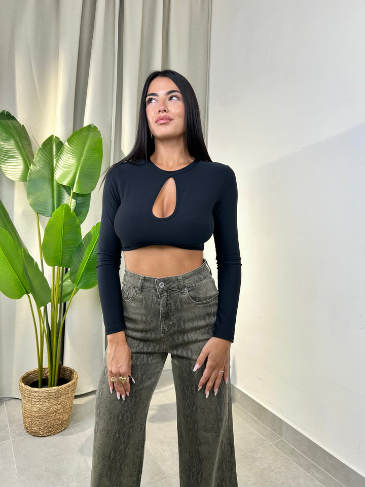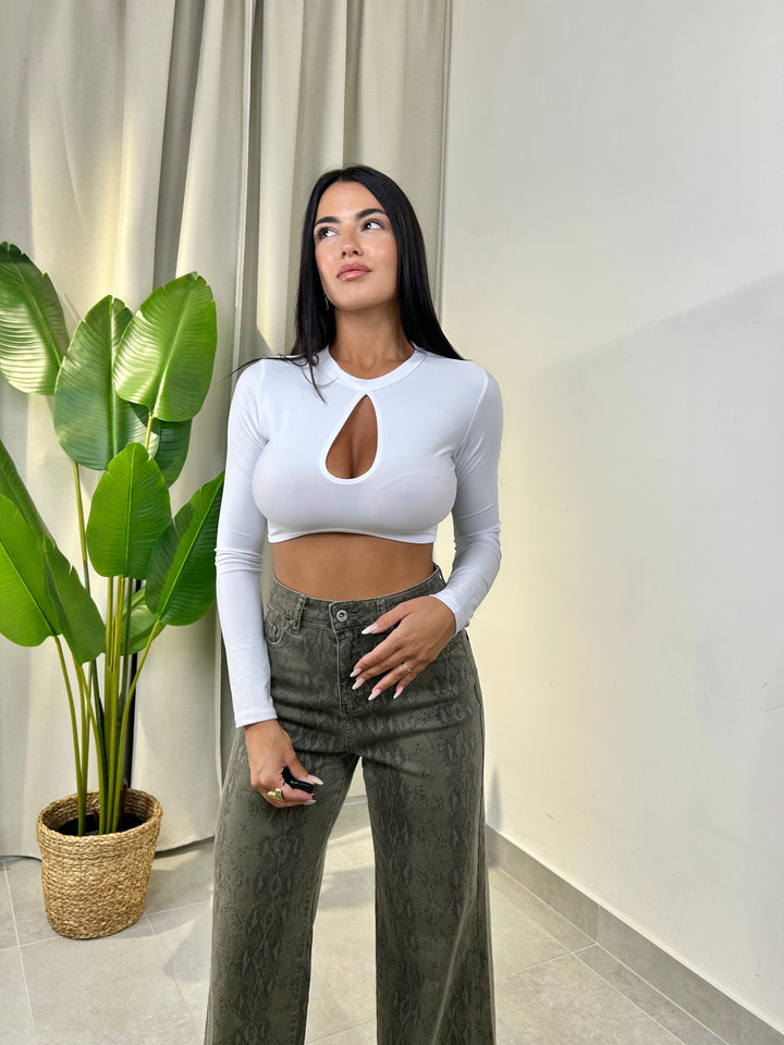 -Maglia crop in lycra con apertura a goccia sul petto;