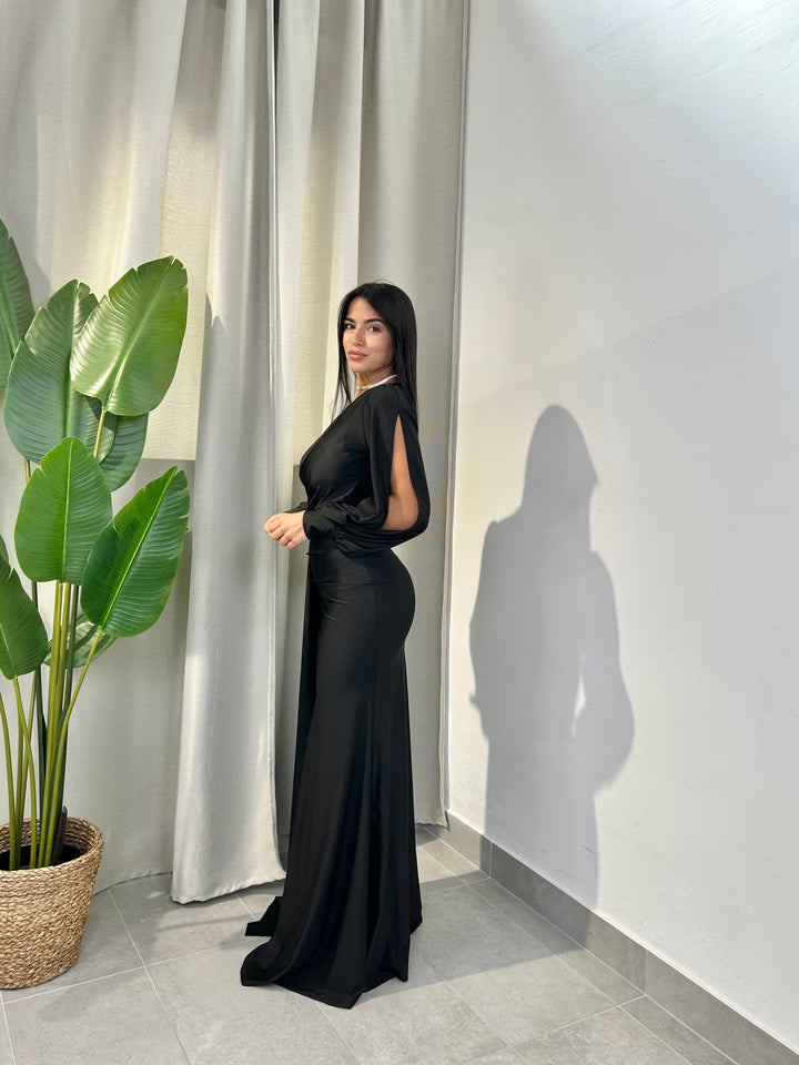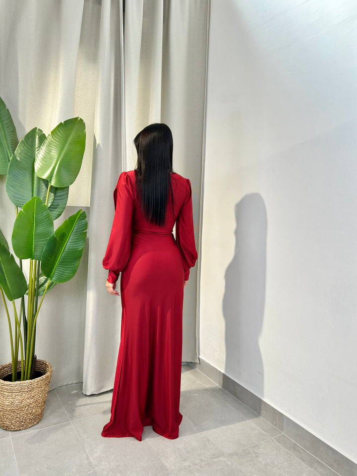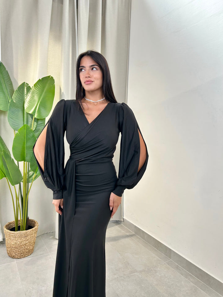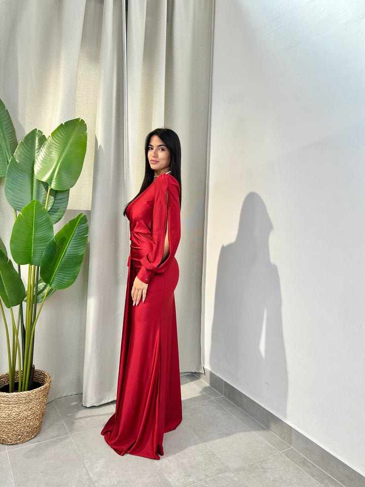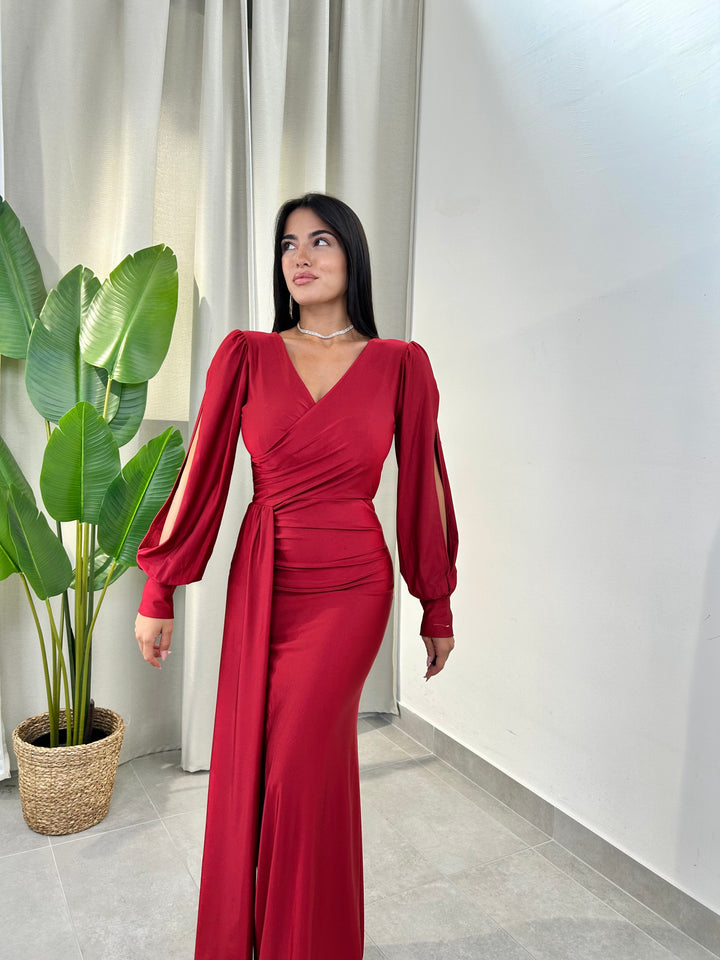-Abito in lycra satinata con spacco laterale e fusciacca;