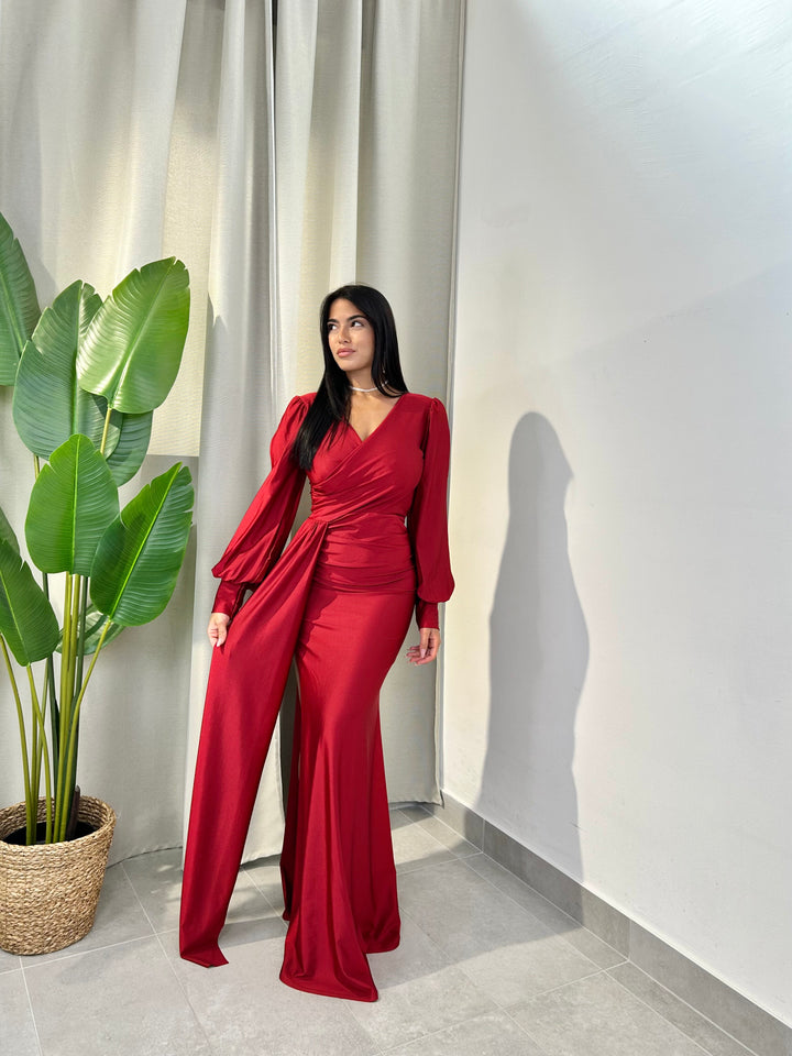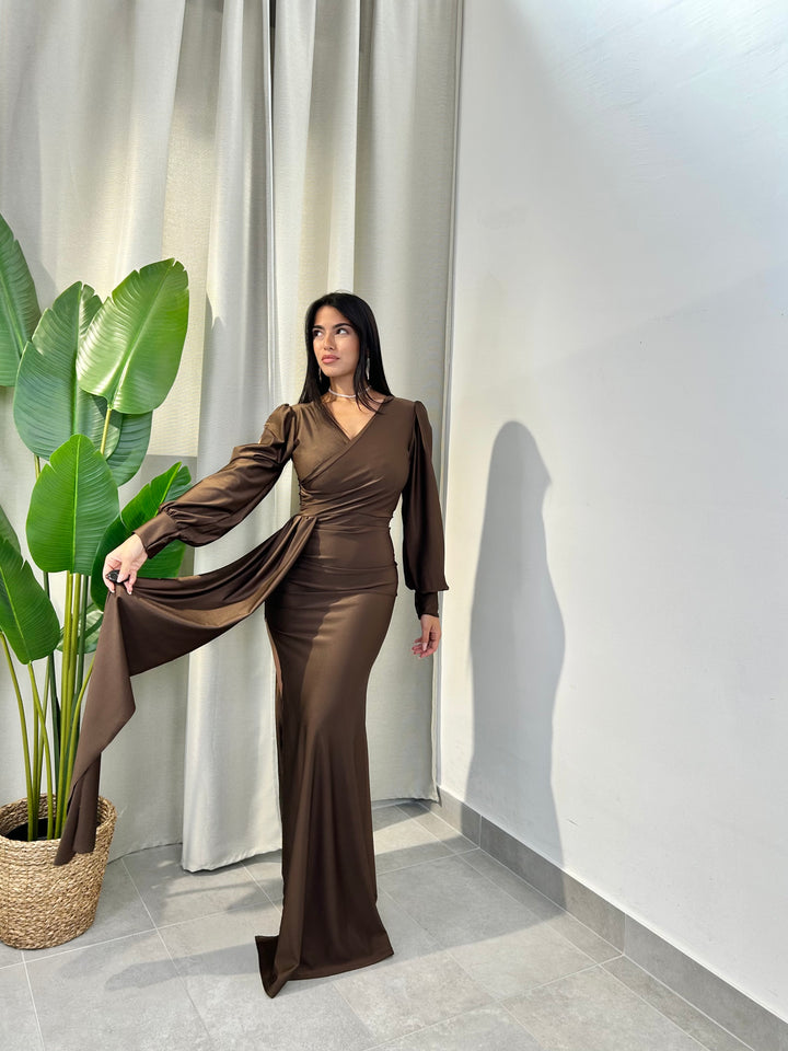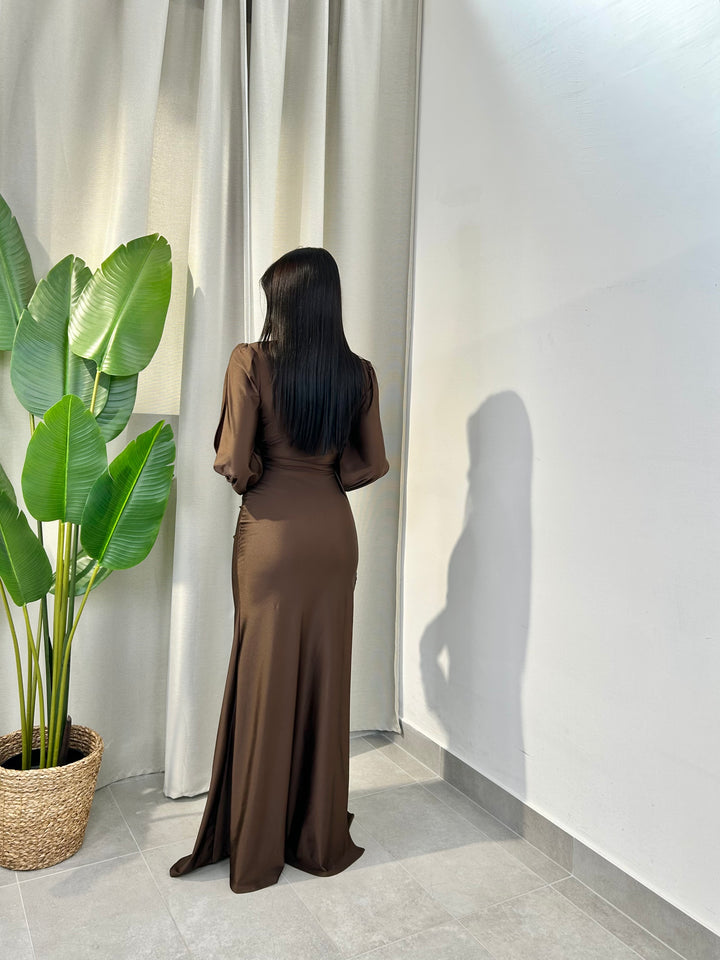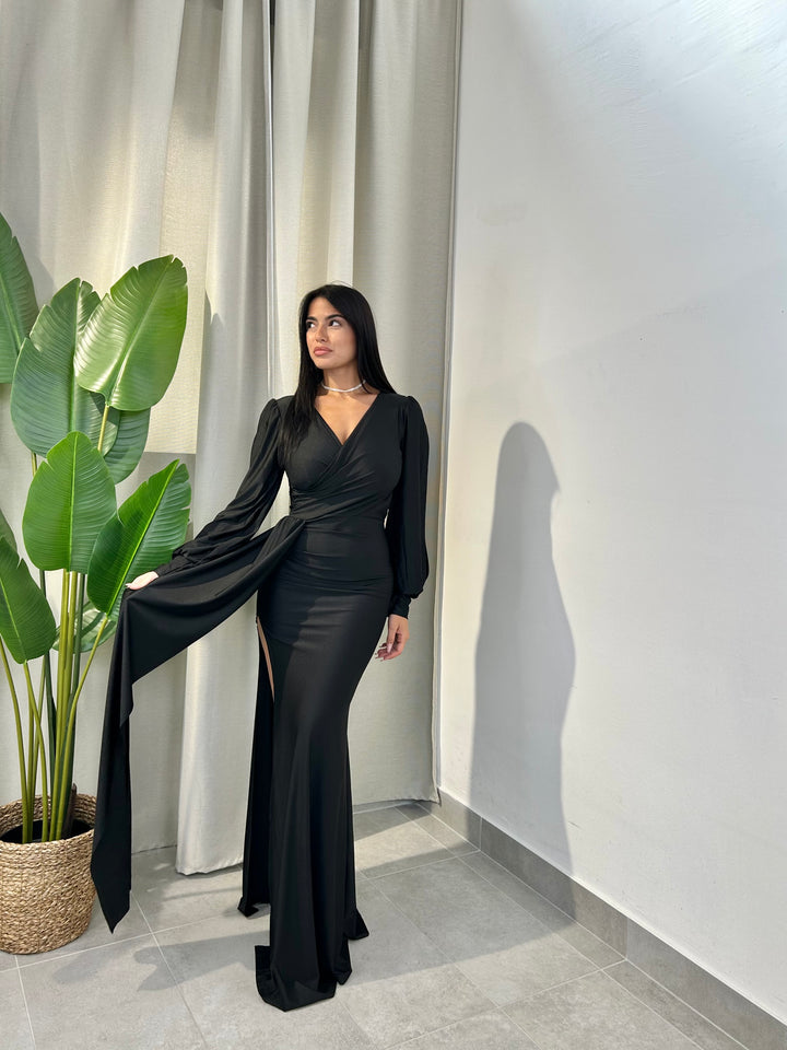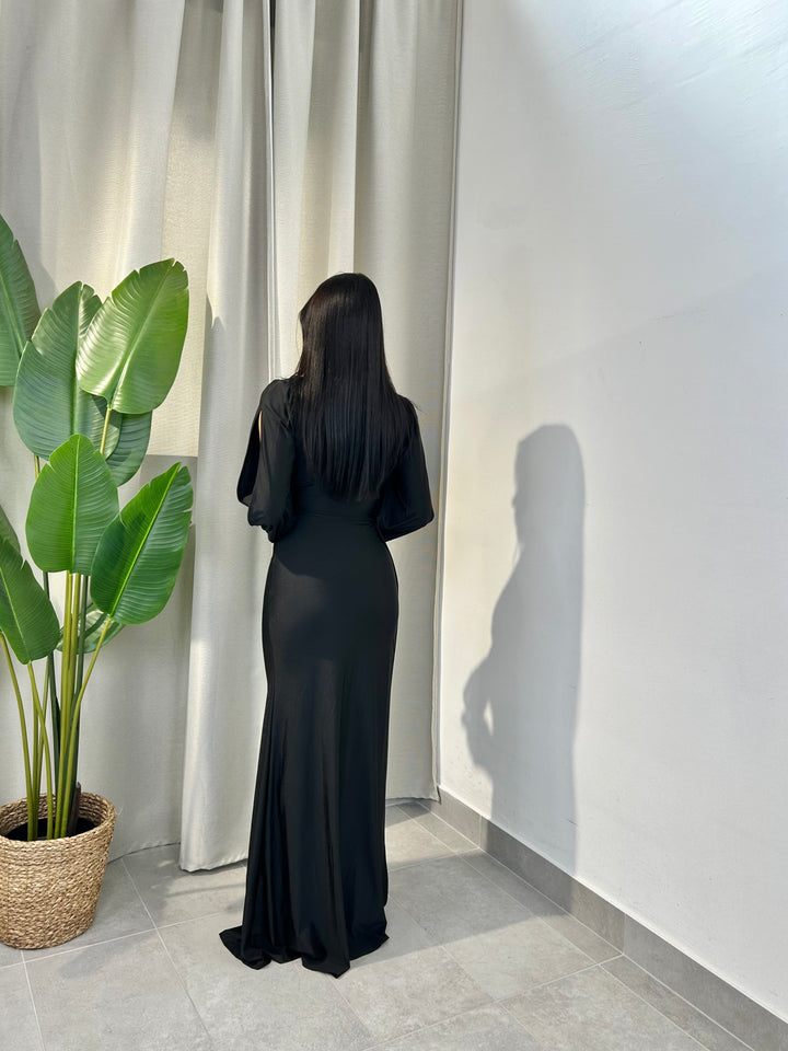 -Abito in lycra satinata con spacco laterale e fusciacca;