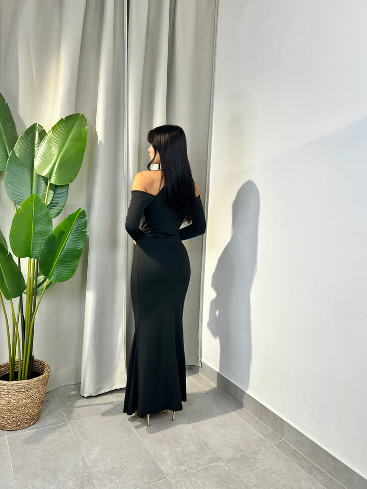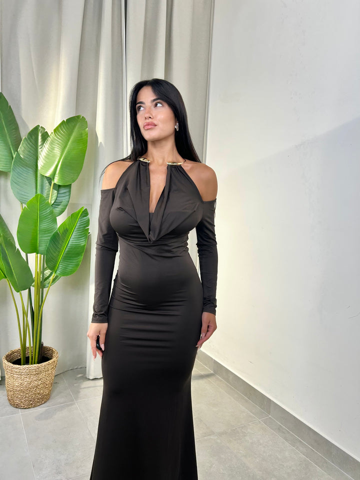 -Abito in lycra con scollo sciallato e collana oro a goccia cucita;