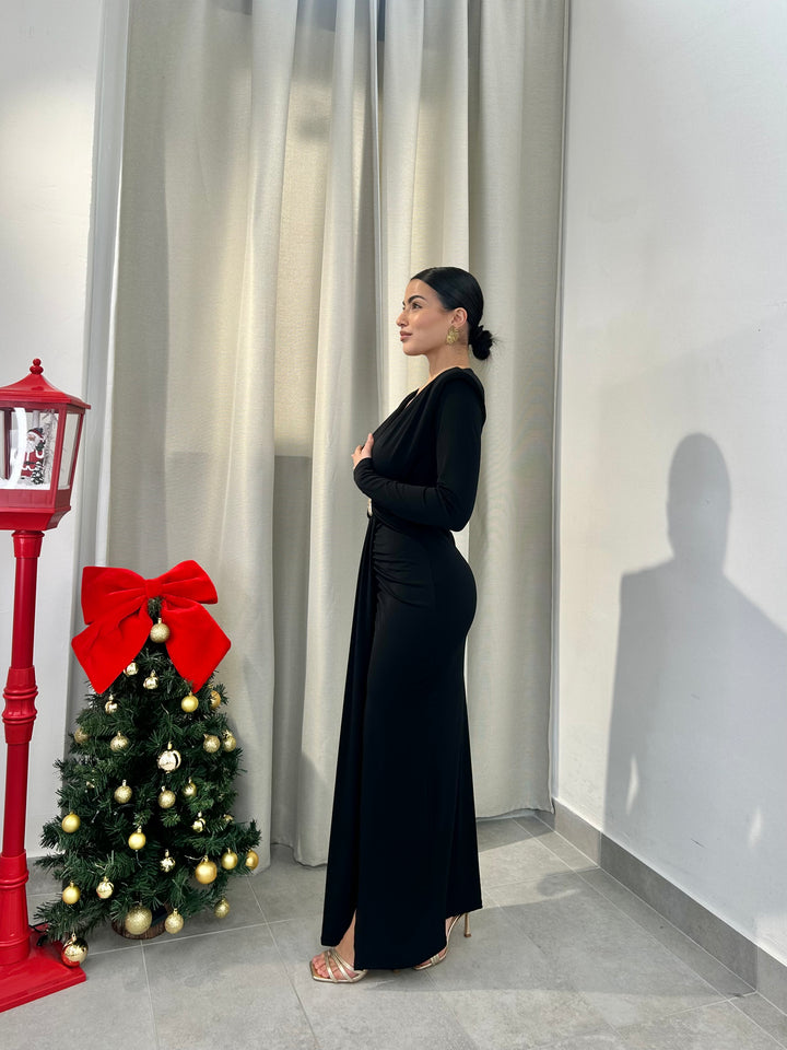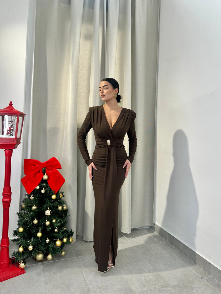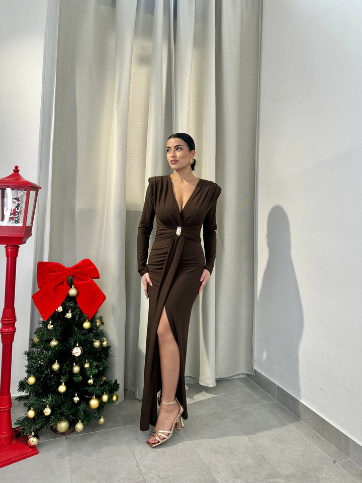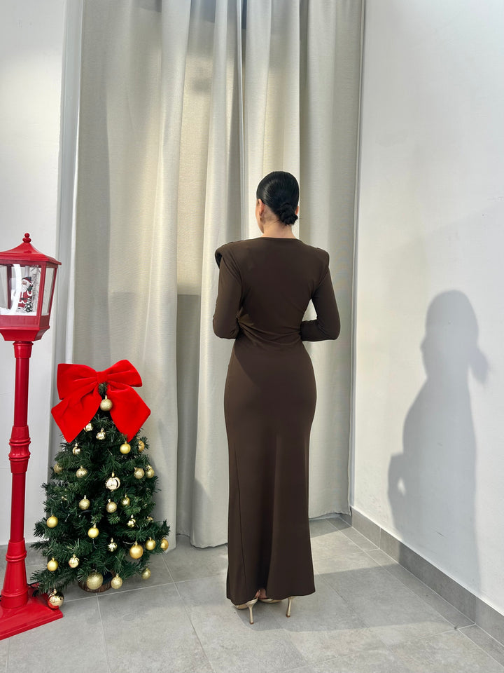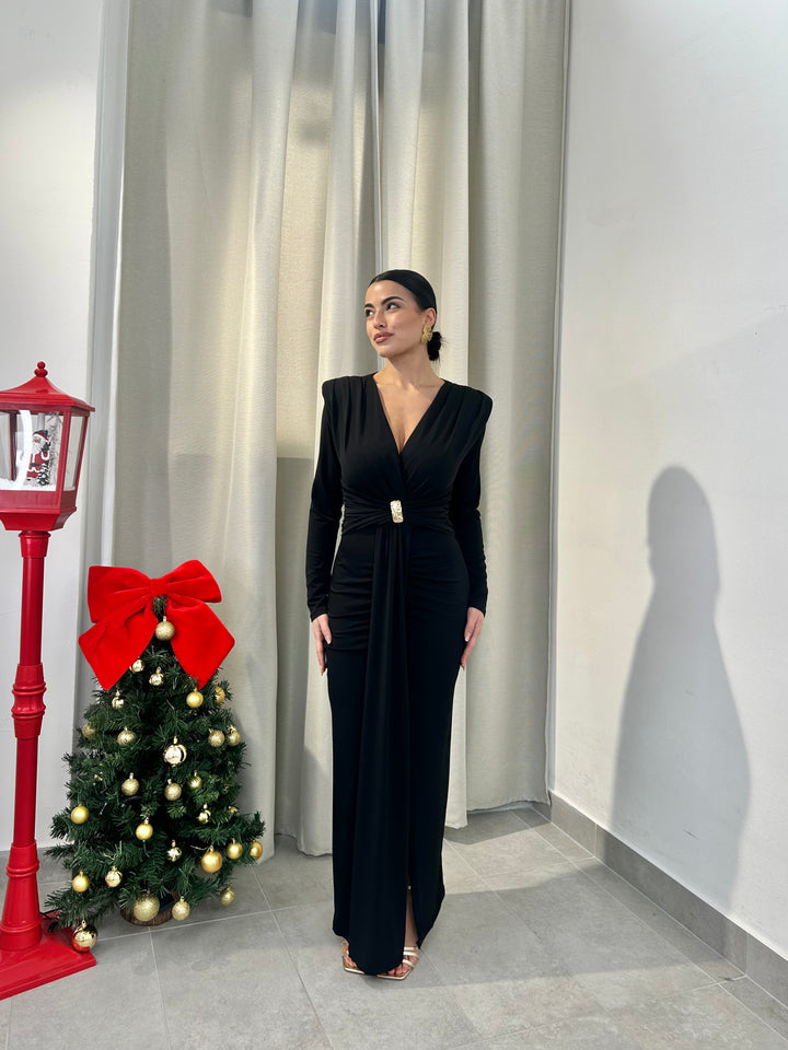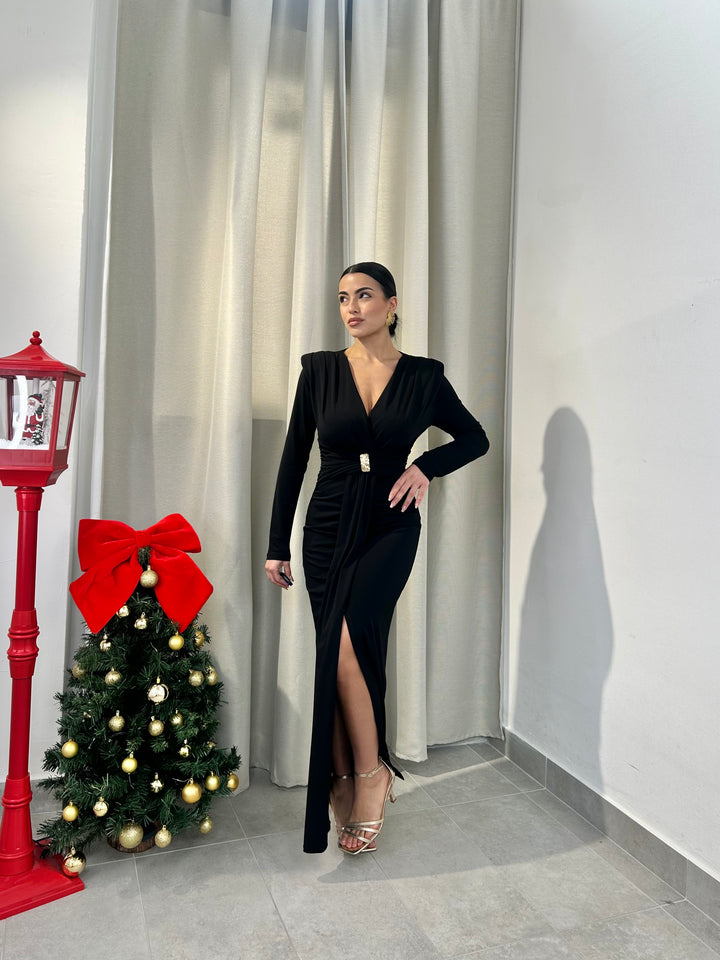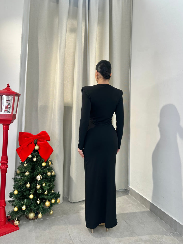 -Abito in lycra con spalline imbottite; Scollo a V e applicazione oro centrale e spacco;