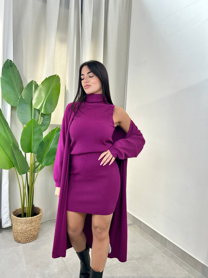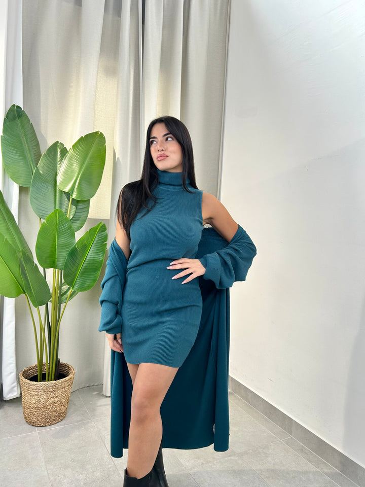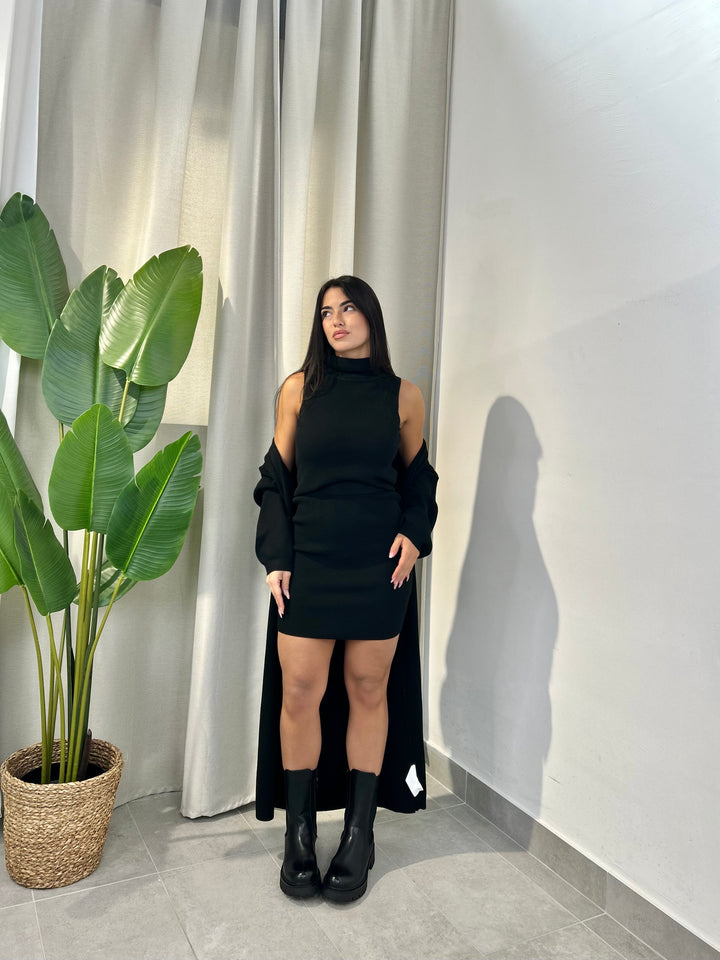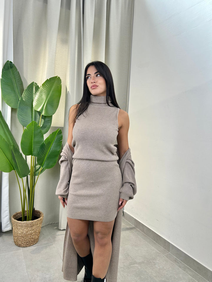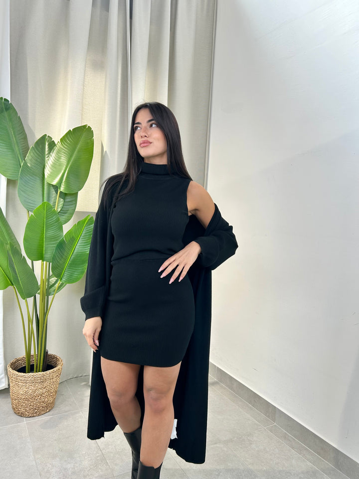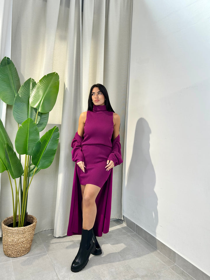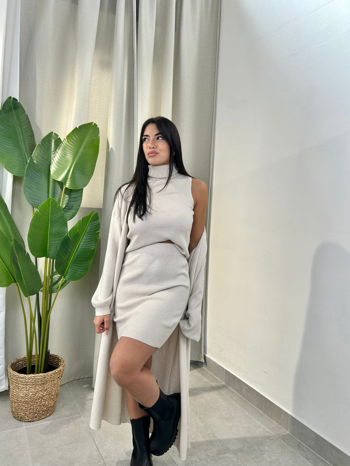 -Coordinato in lana rasata composto da Cardigan lungo,Dolcevita smanicato e Gonna;