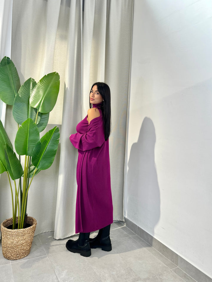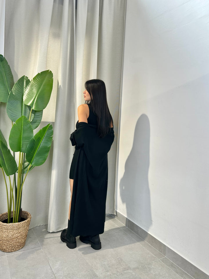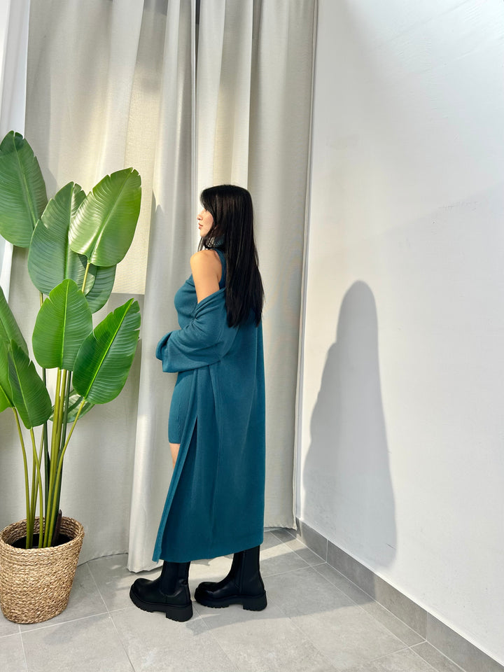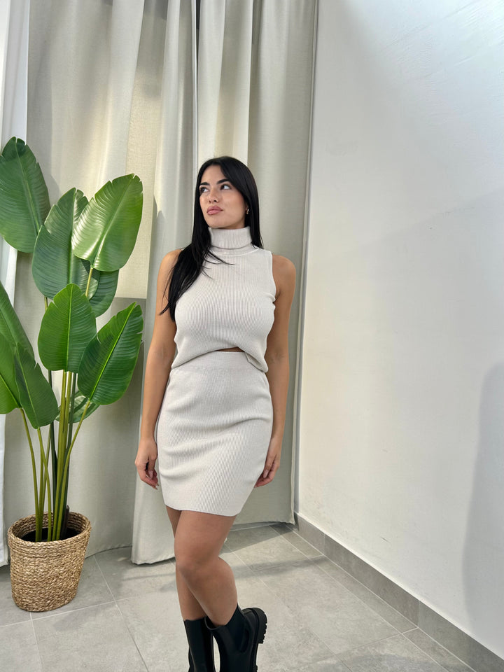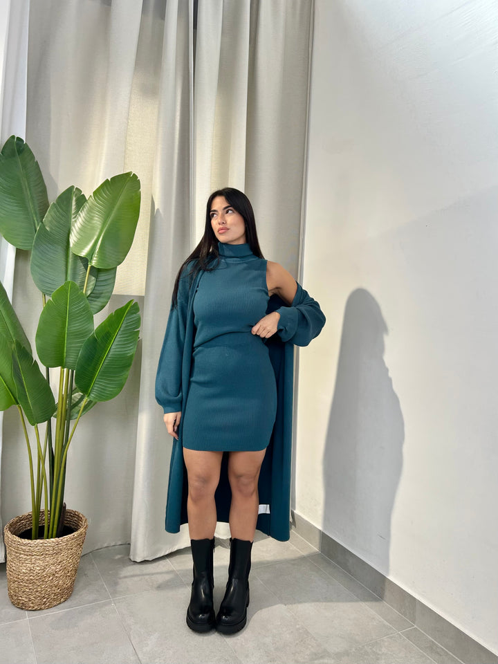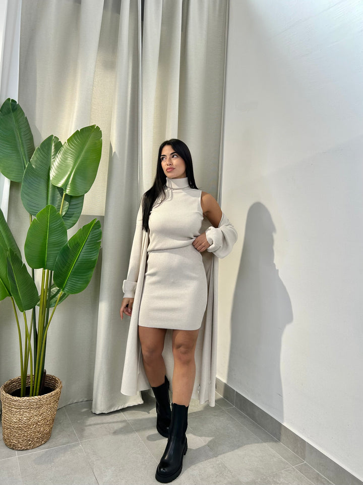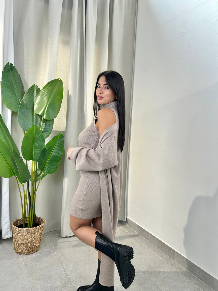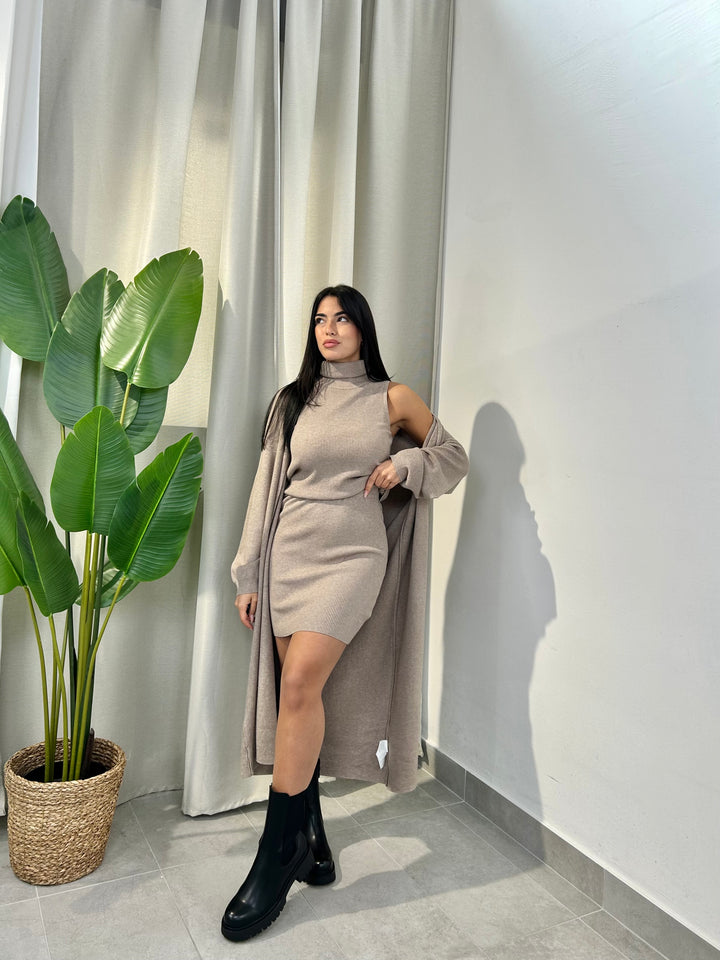 -Coordinato in lana rasata composto da Cardigan lungo,Dolcevita smanicato e Gonna;