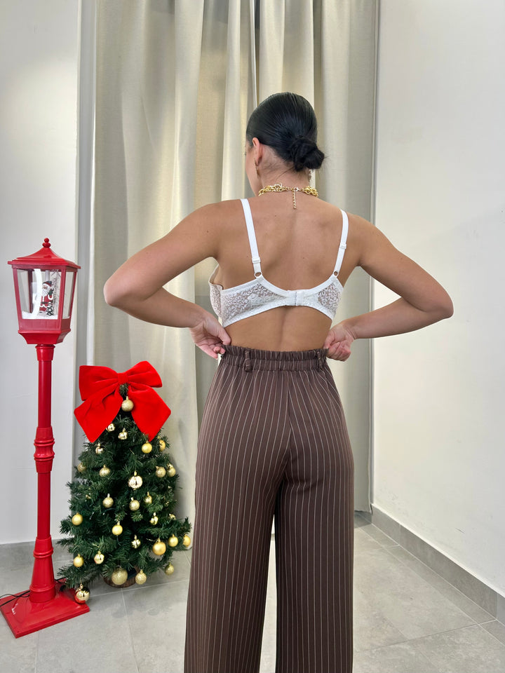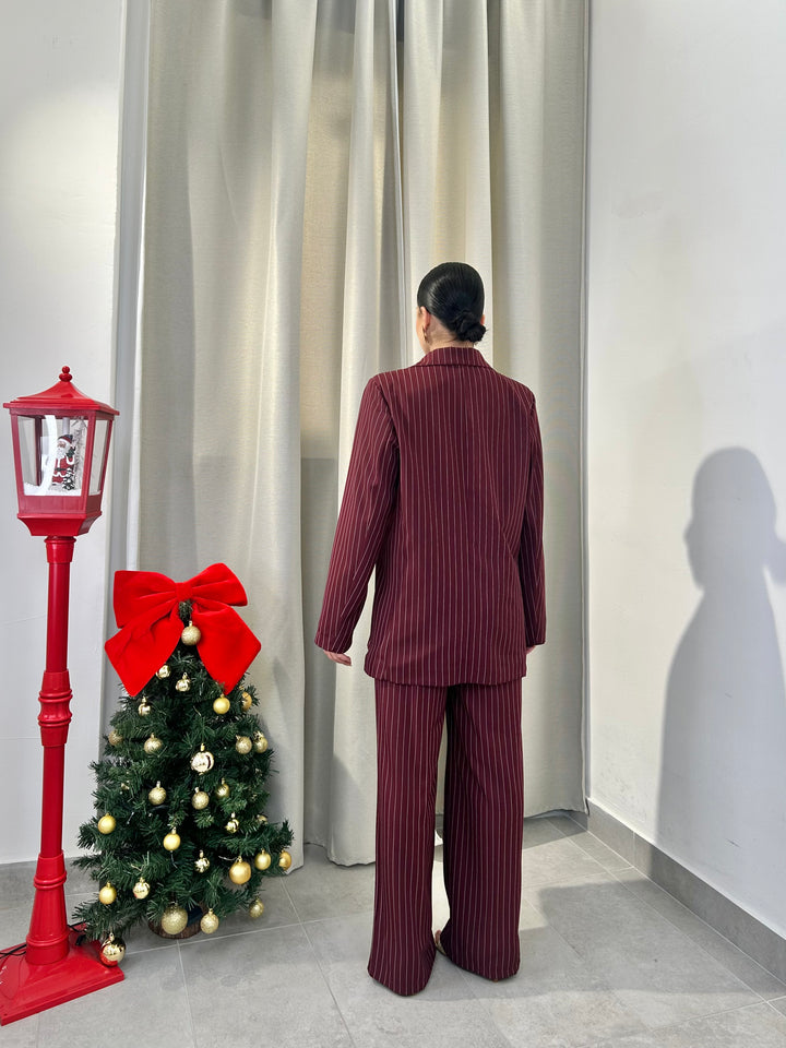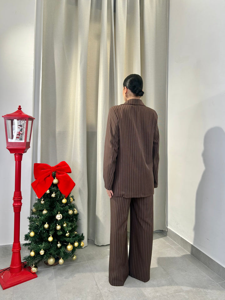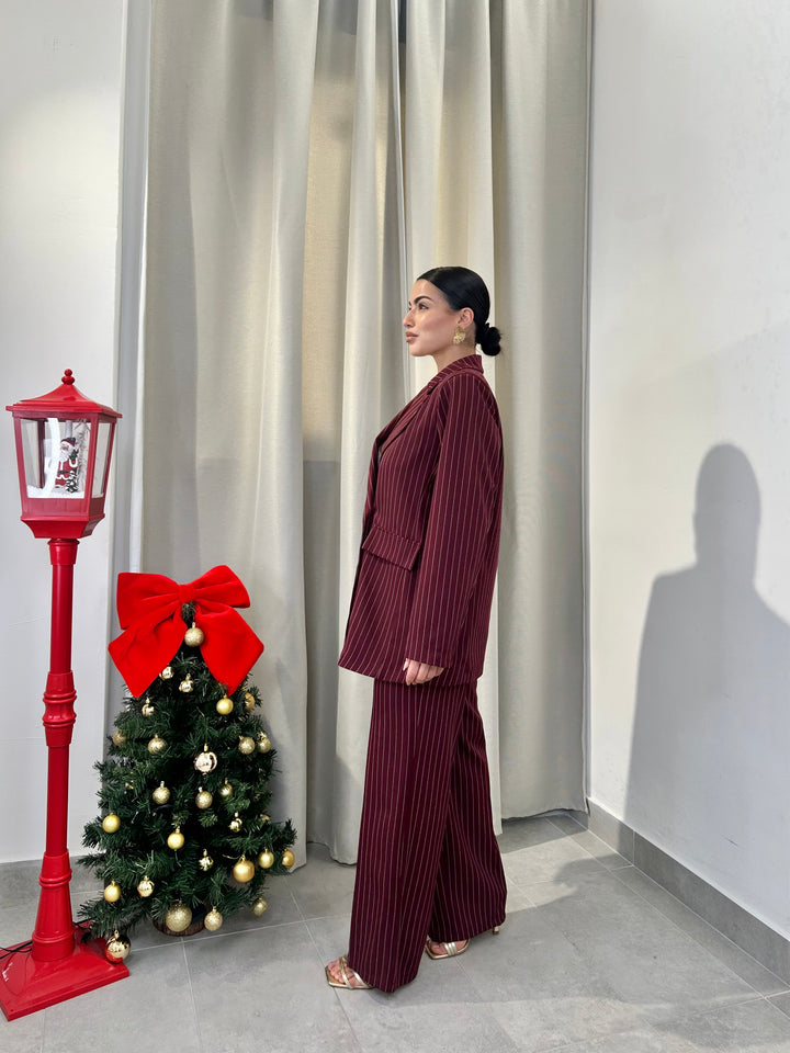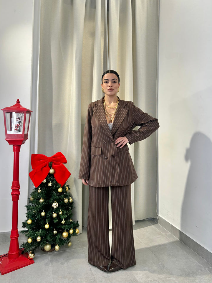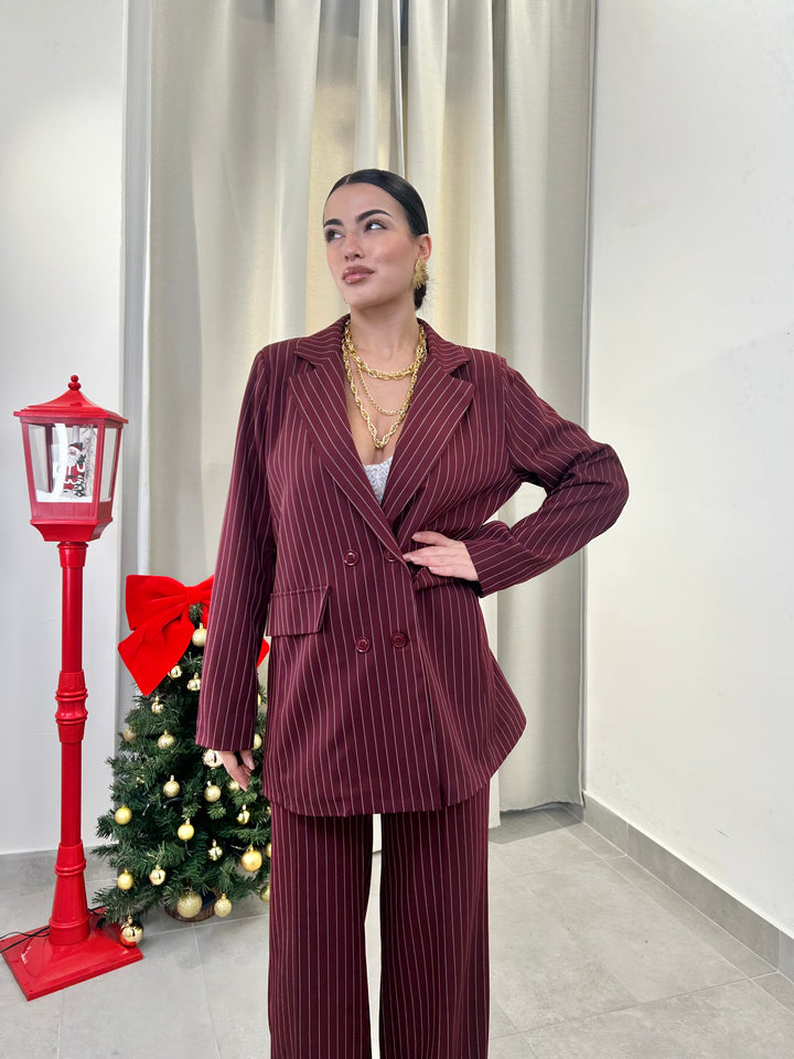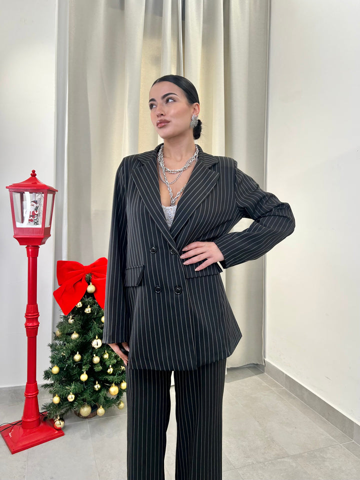 -Tailleur gessato composto da Giacca con chiusura laterale oversize+Pantalone palazzo con bottone in vita ed elastico sul retro;