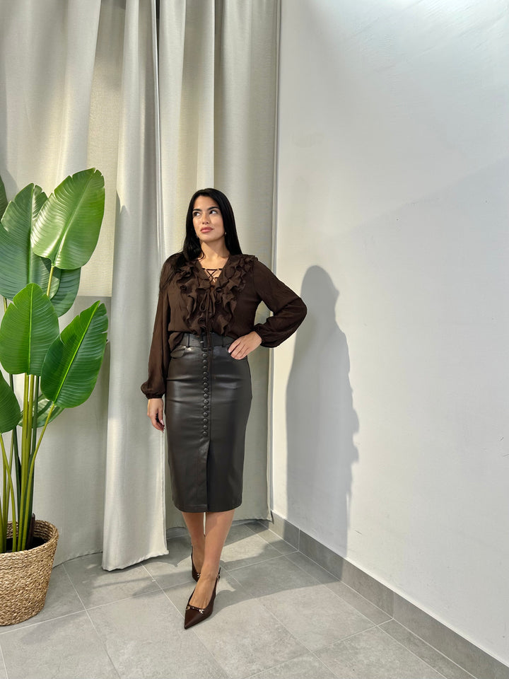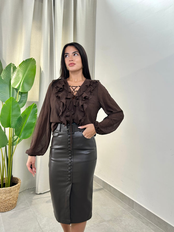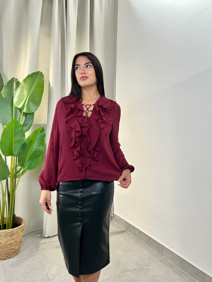 -Camicia in organza effetto stropicciato con rouches centrale e lacci regolabili;