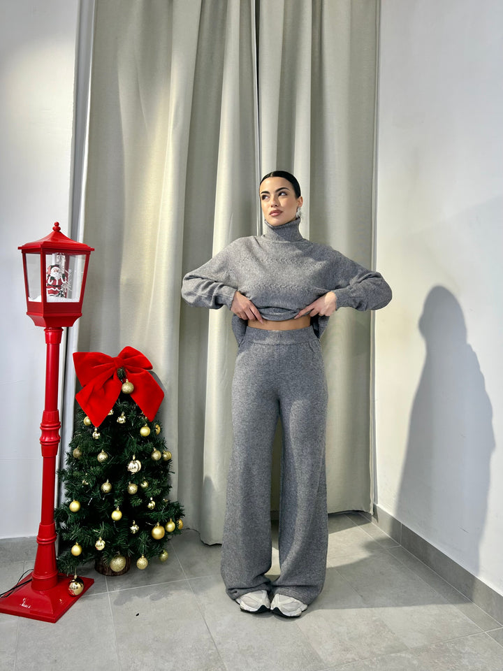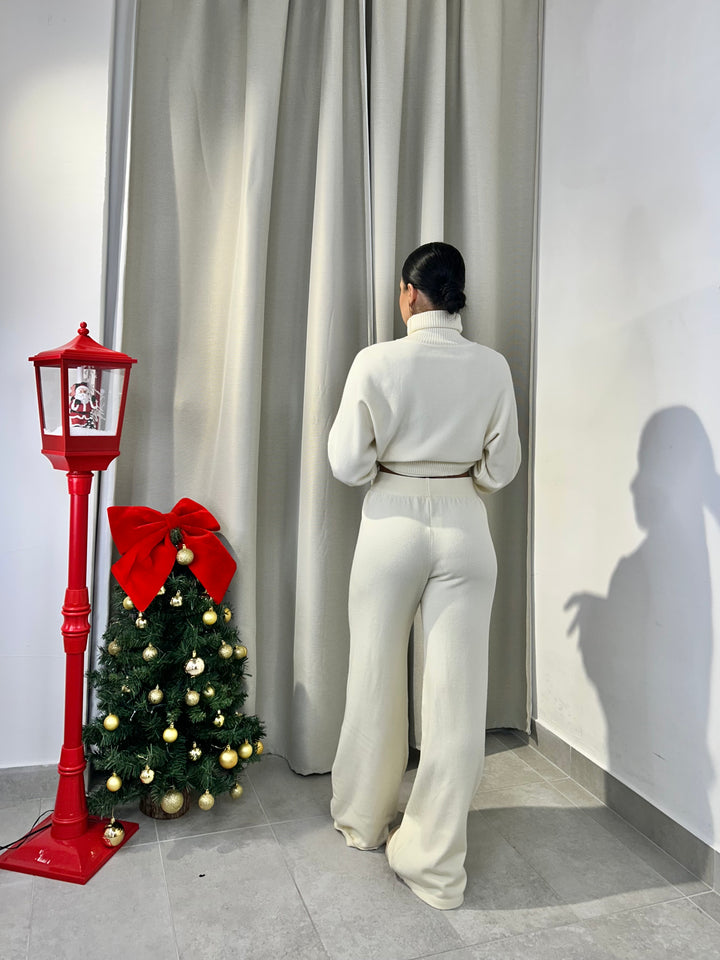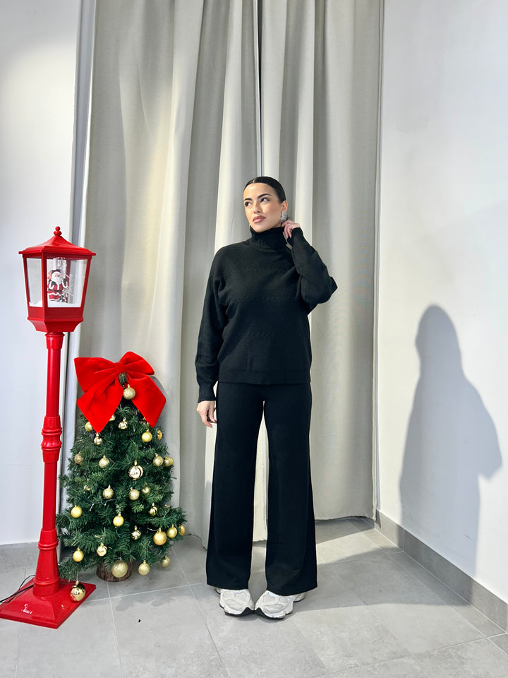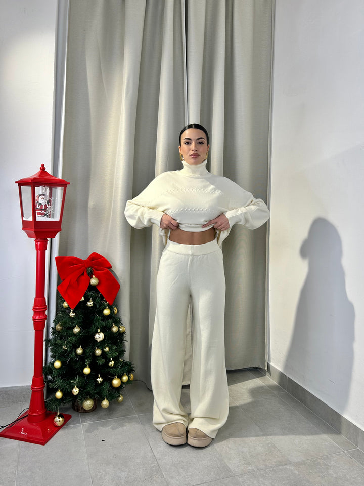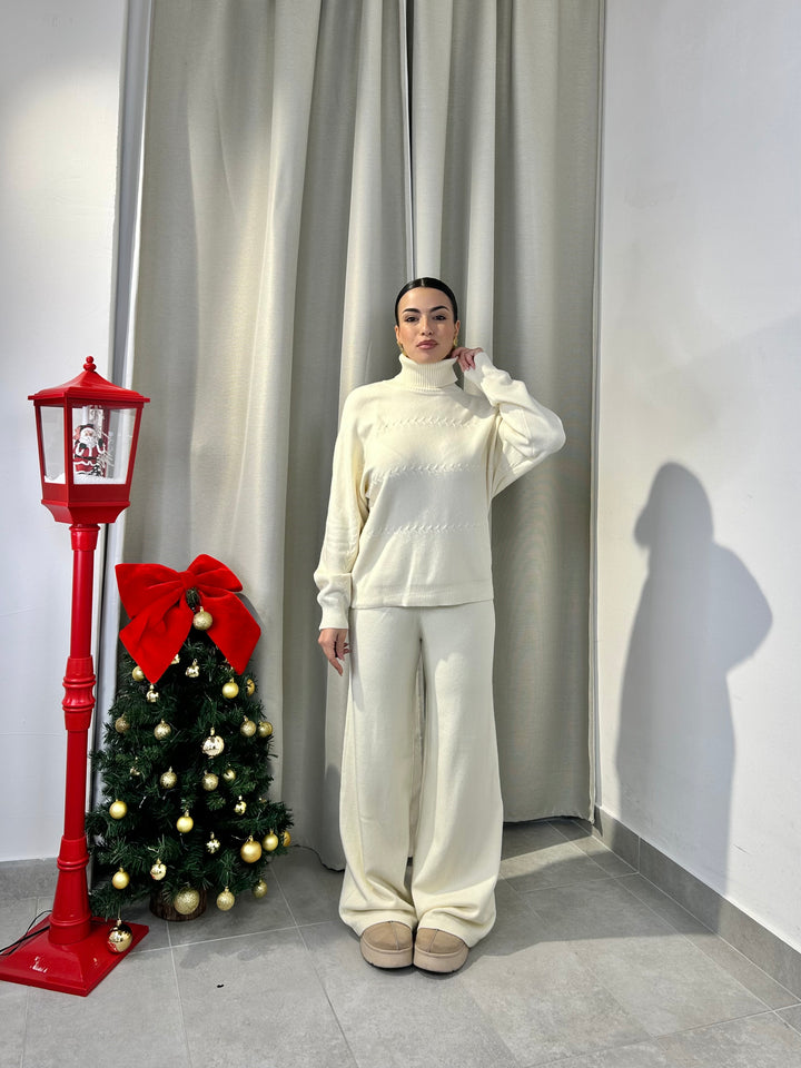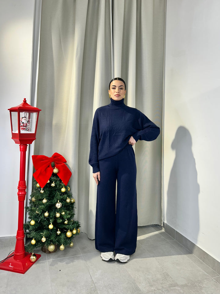 -Coordinato in lana rasata composto da Maglione collo alto lavorato all’interno+Pantalone palazzo con elastico in vita;