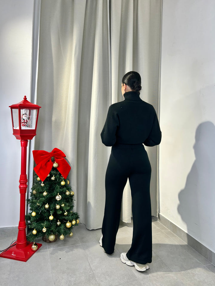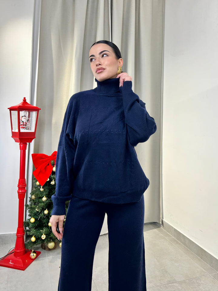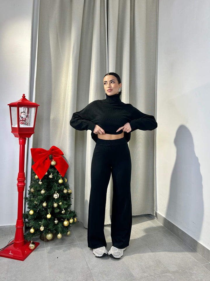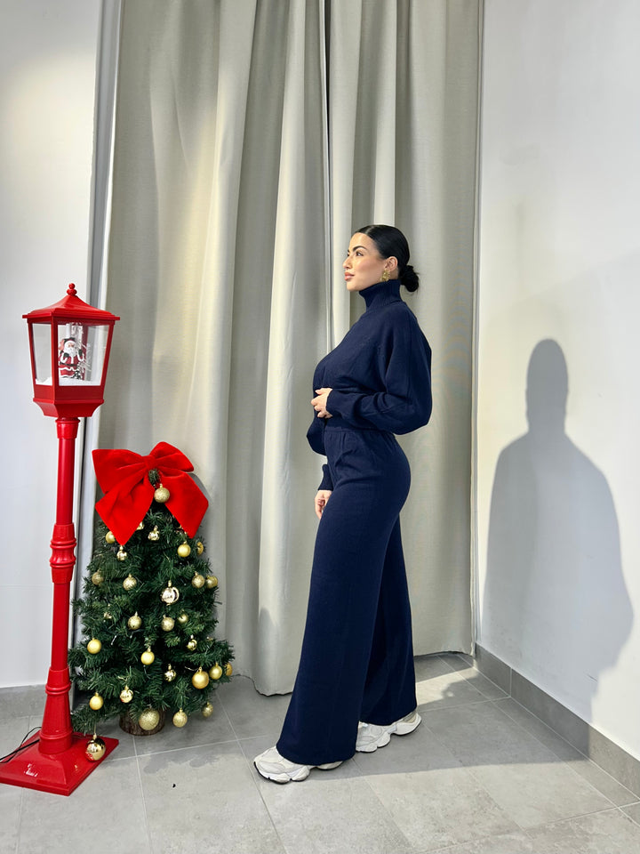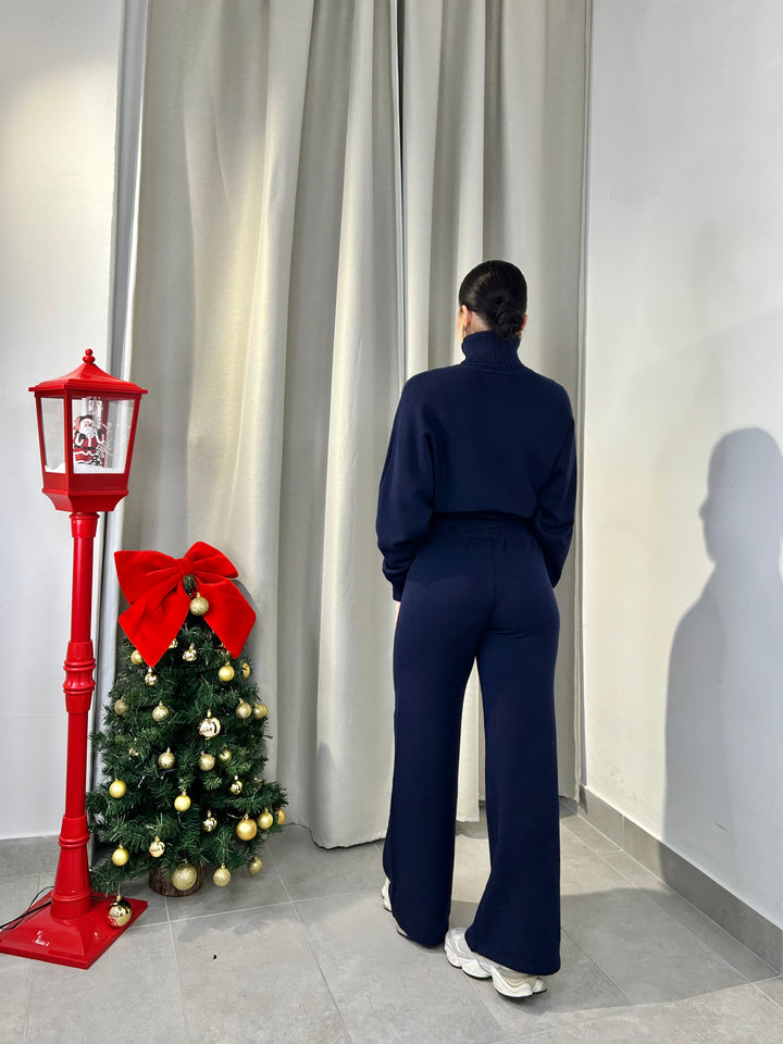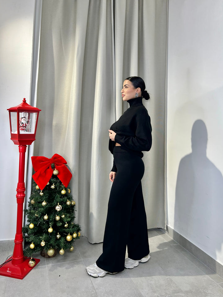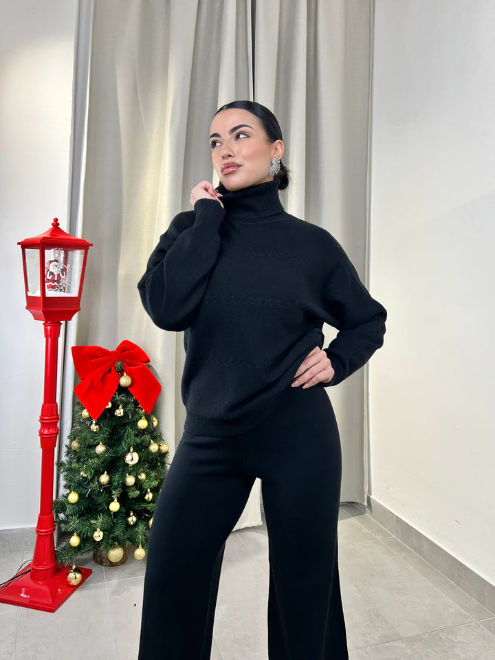 -Coordinato in lana rasata composto da Maglione collo alto lavorato all’interno+Pantalone palazzo con elastico in vita;