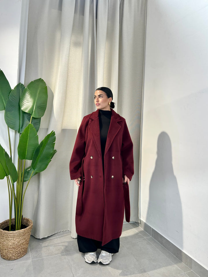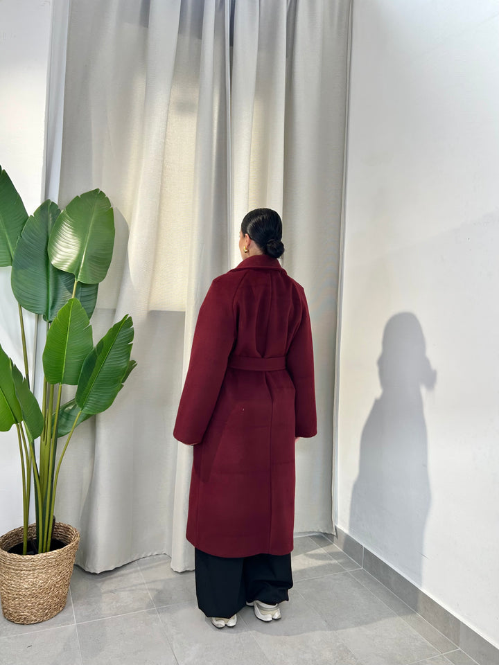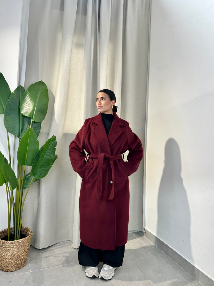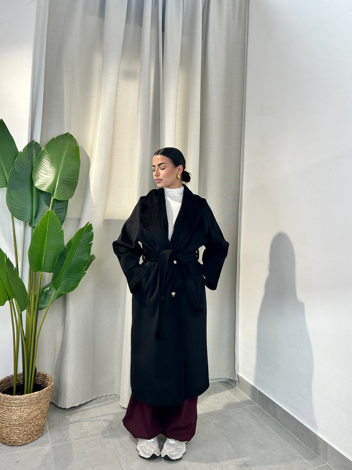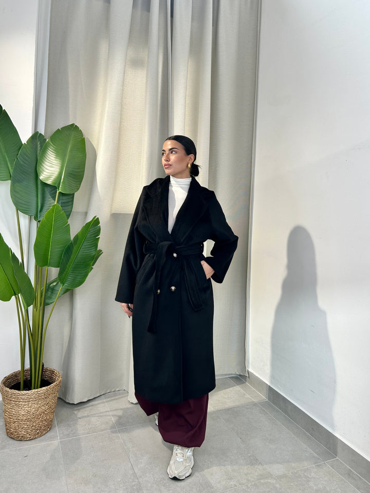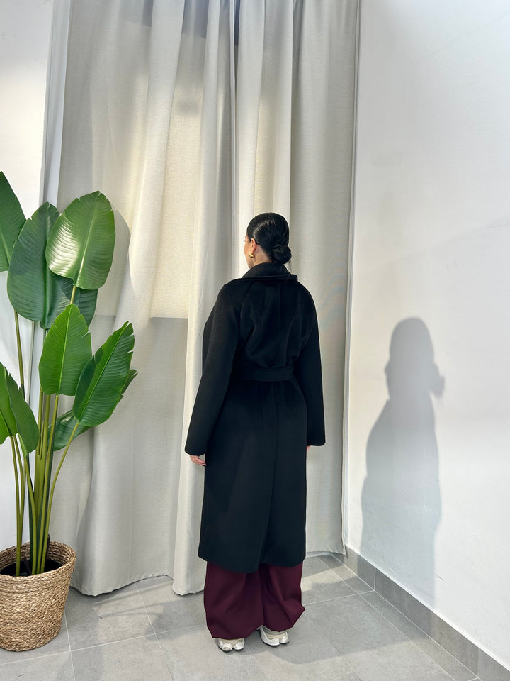 -Cappotto in panno con chiusura laterale doppio petto e cintura in vita; Interno foderato;