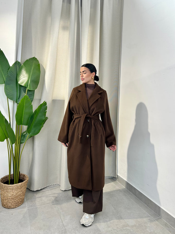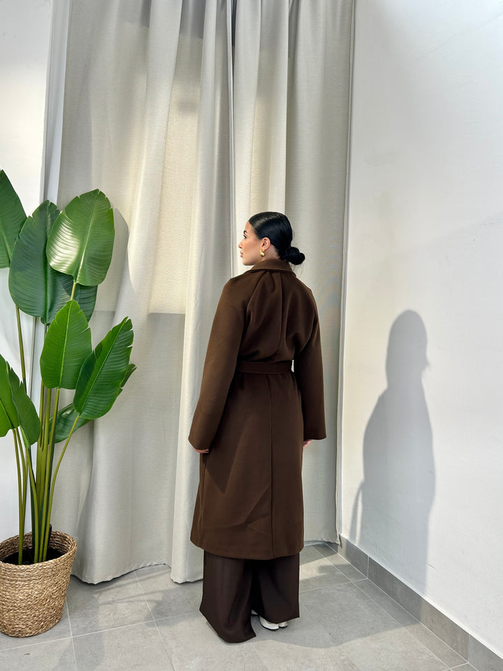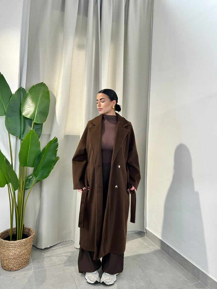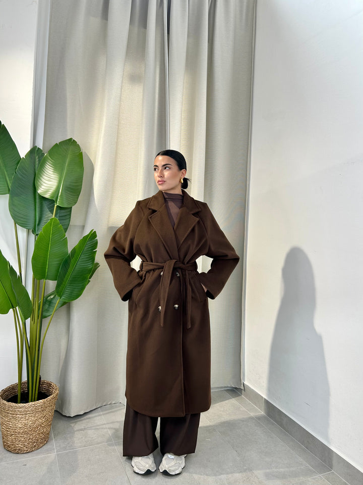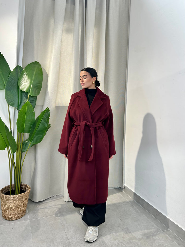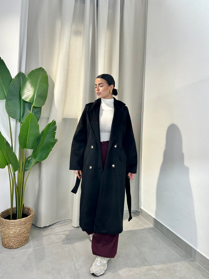 -Cappotto in panno con chiusura laterale doppio petto e cintura in vita; Interno foderato;