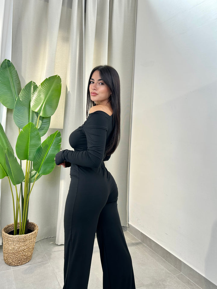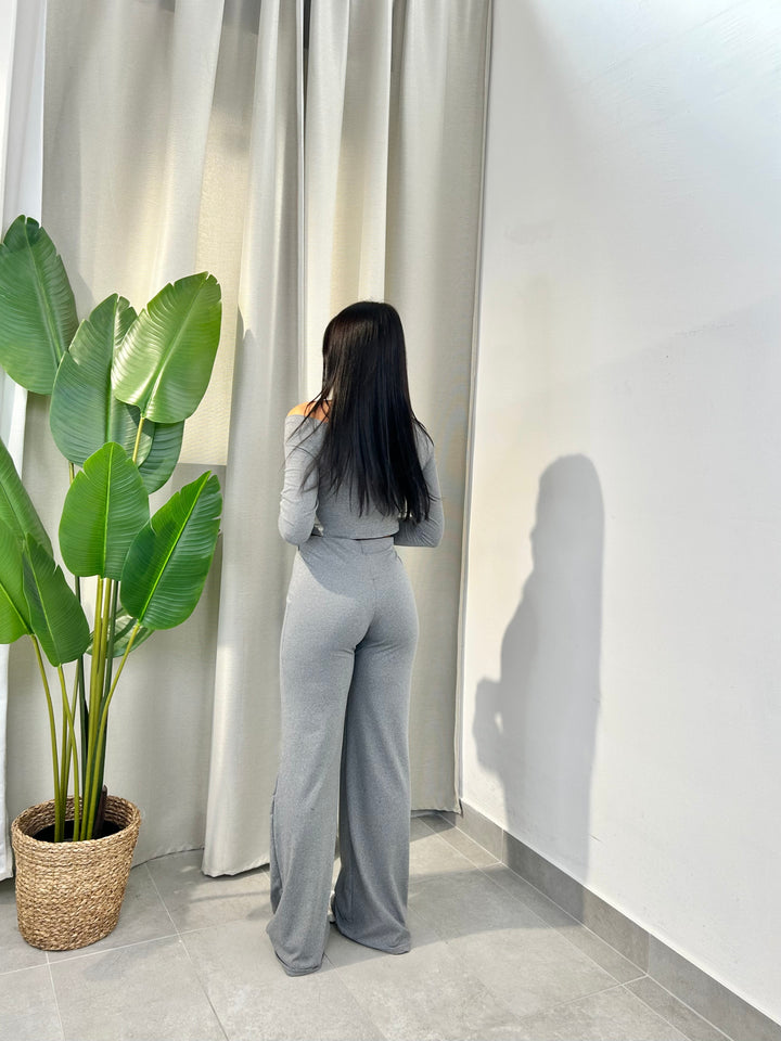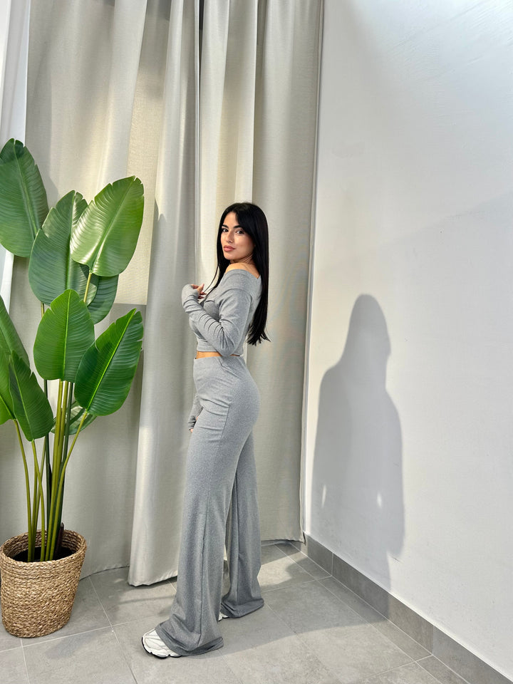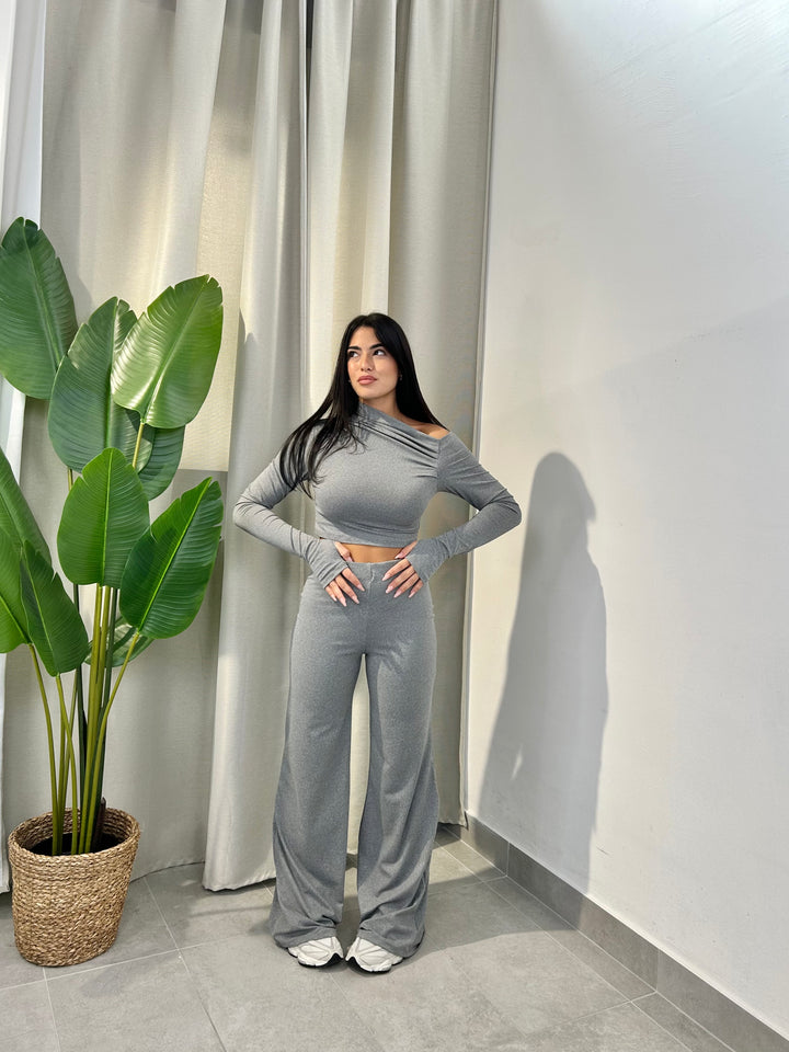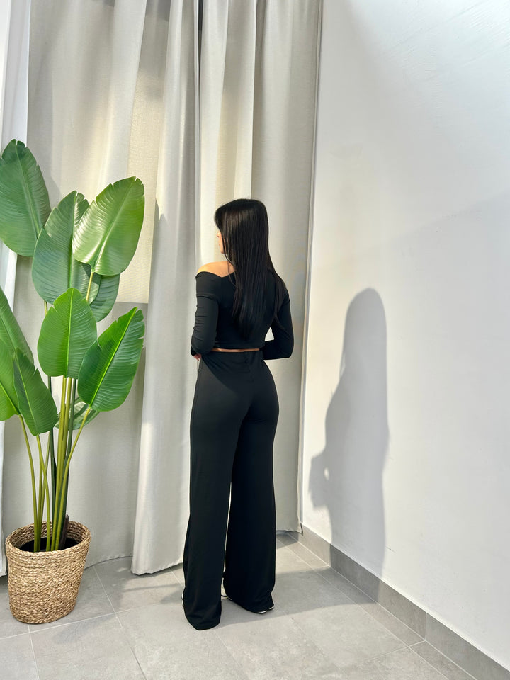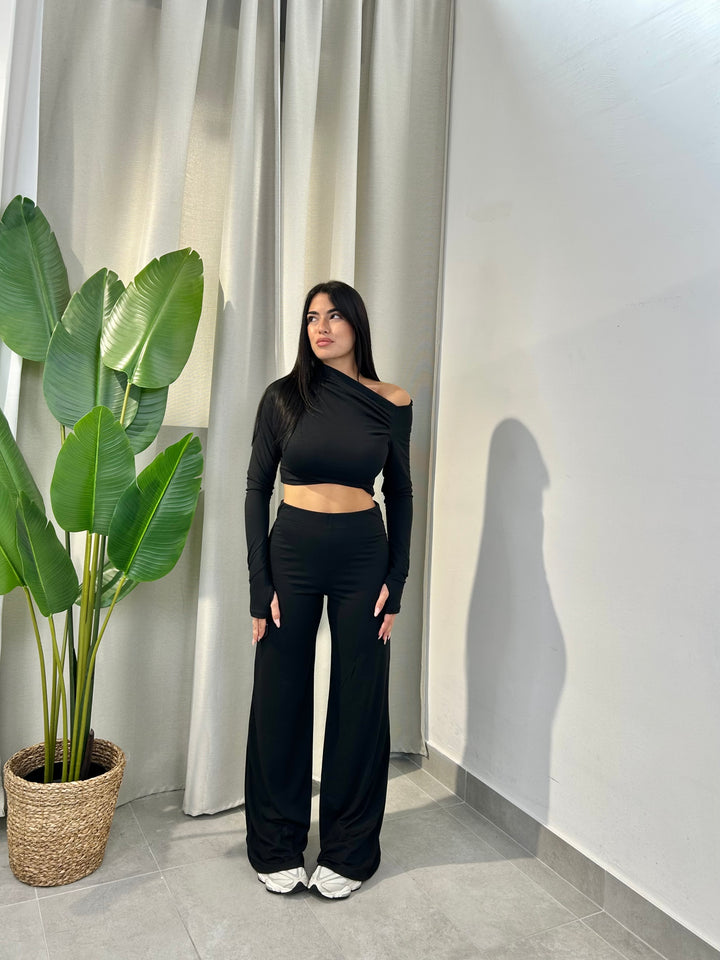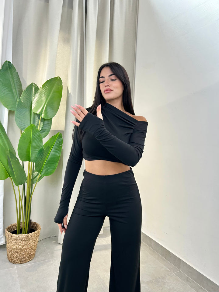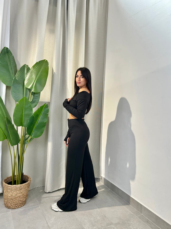 -Coordinato composto da maglia crop con taglio trasversale e manica a guanto+Pantalone a zampa con elastico in vita;