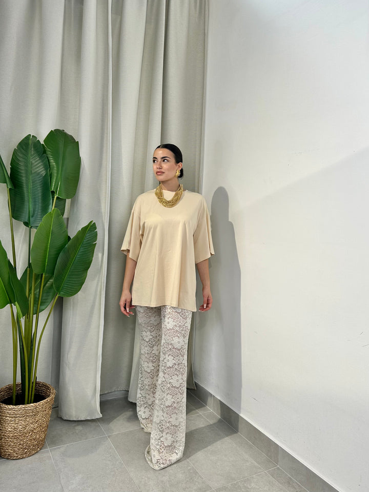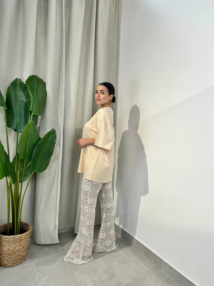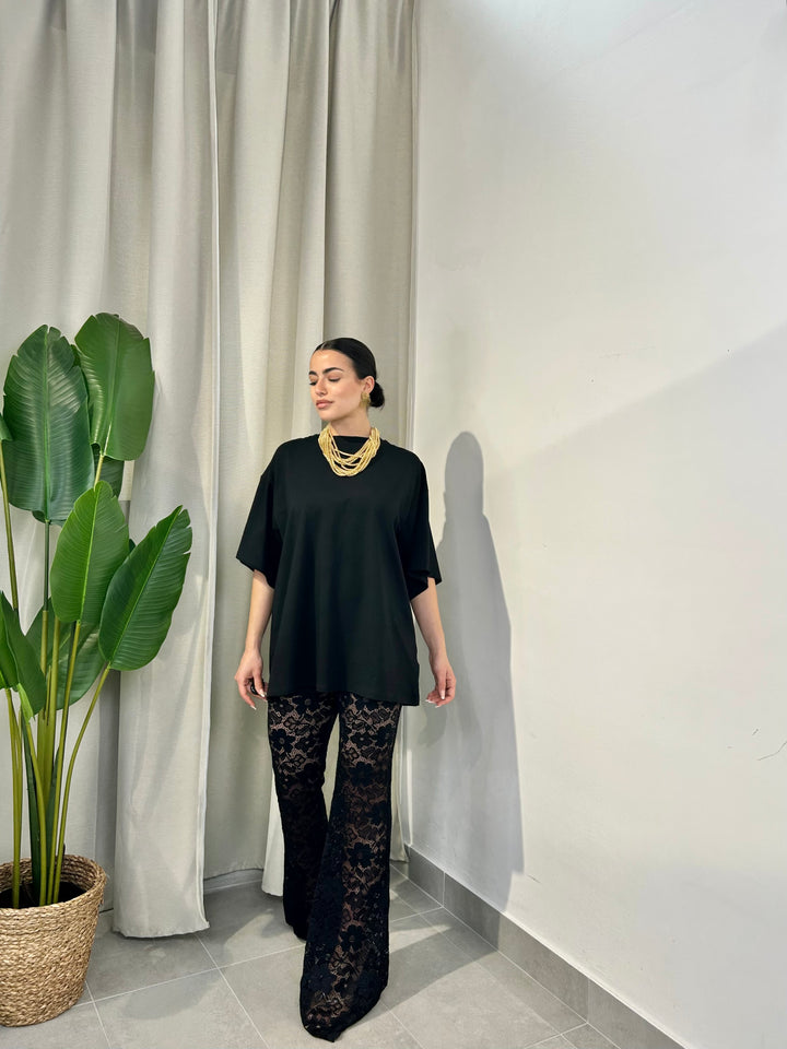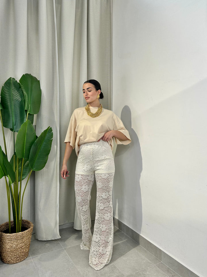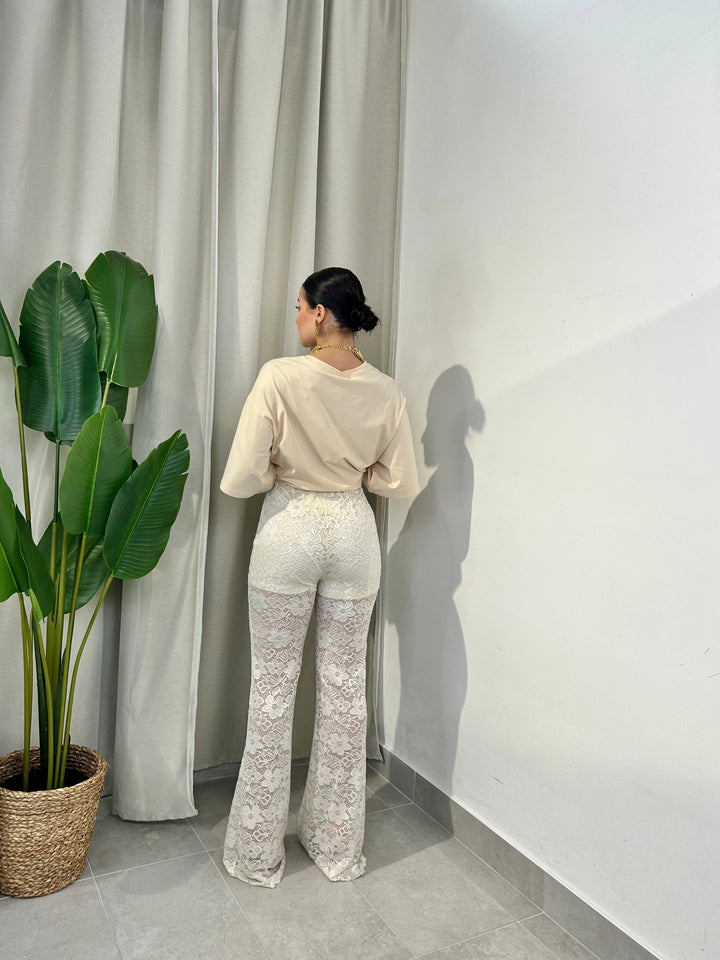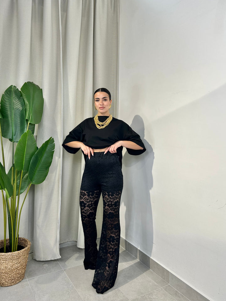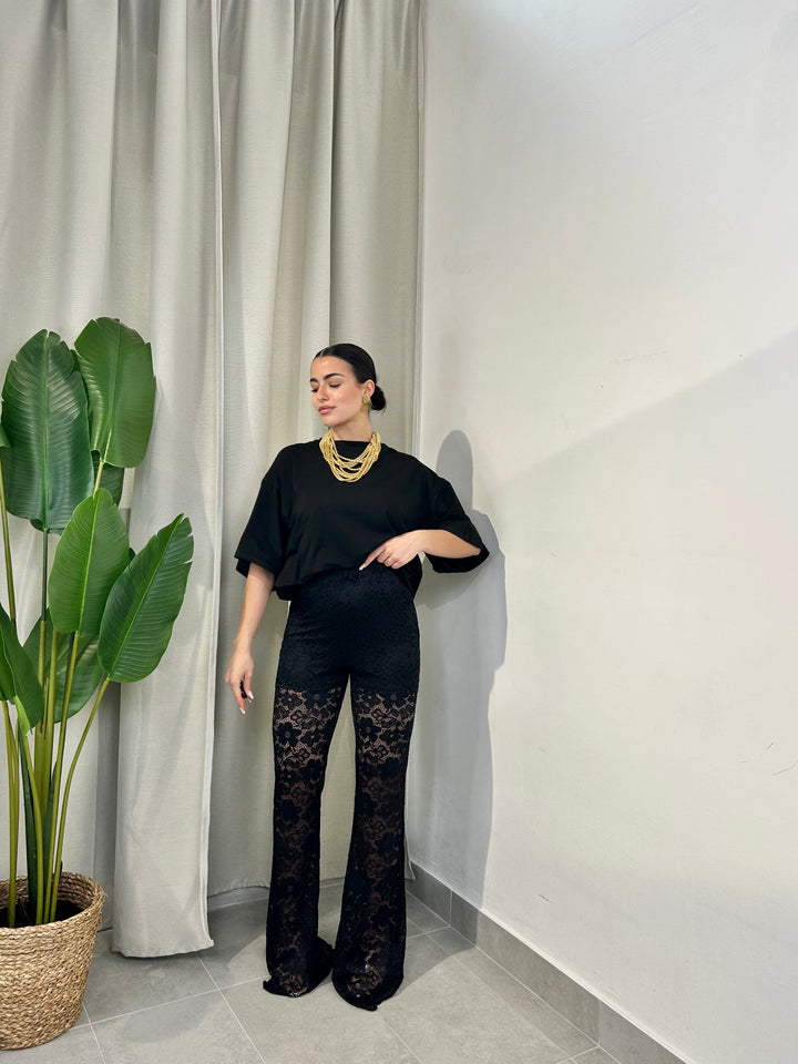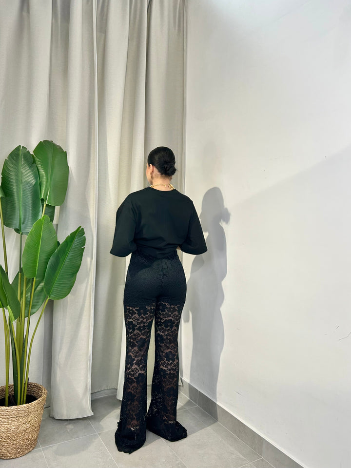 -Pantalone a zampa in microrete foderato all’interno fino a metà coscia;