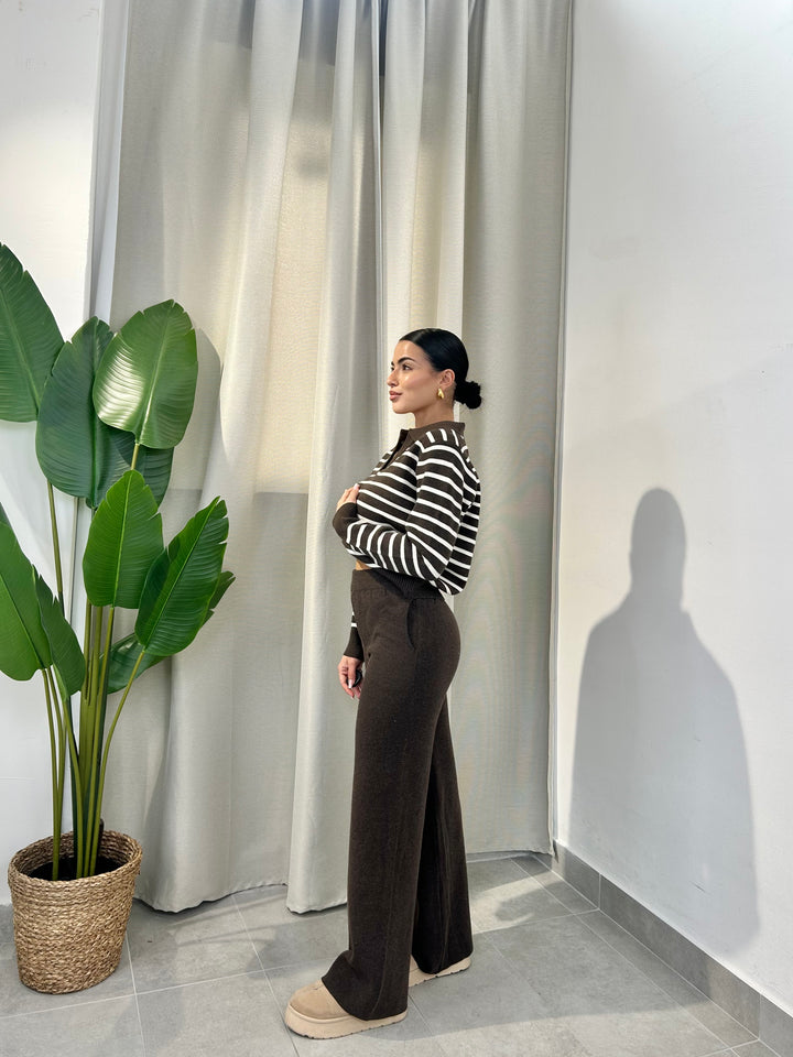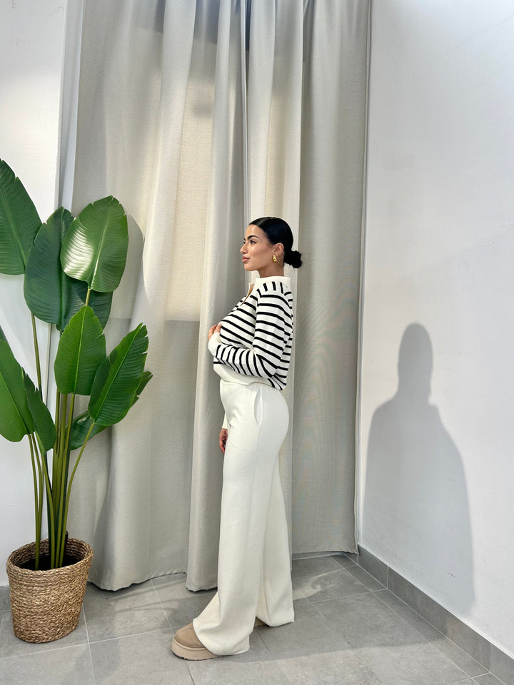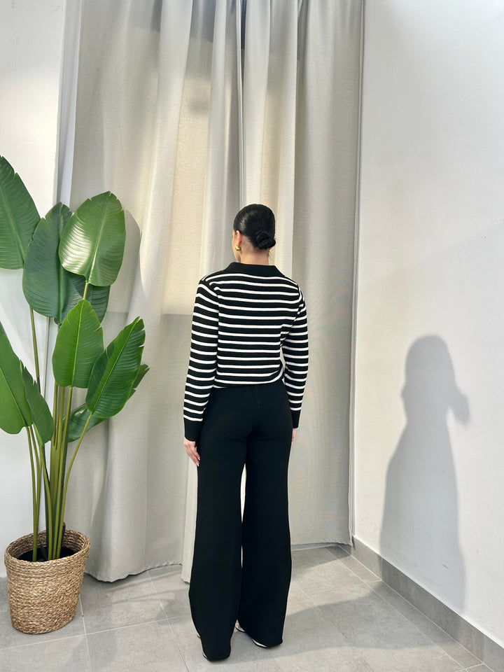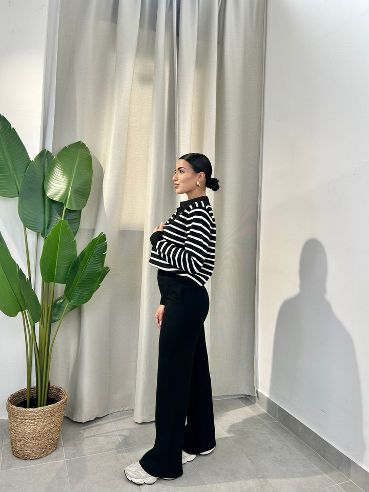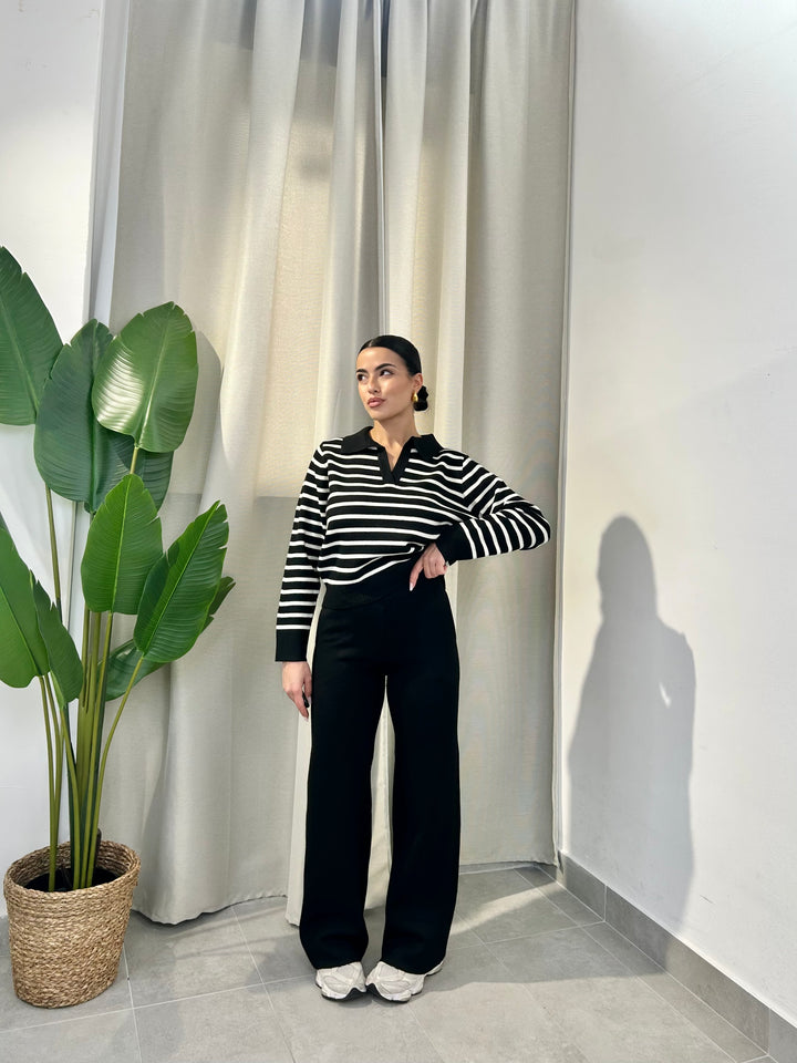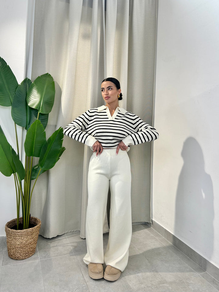 -Coordinato in lana rasata composto da Maglia scollo a V a righe+Pantalone palazzo con elastico in vita;