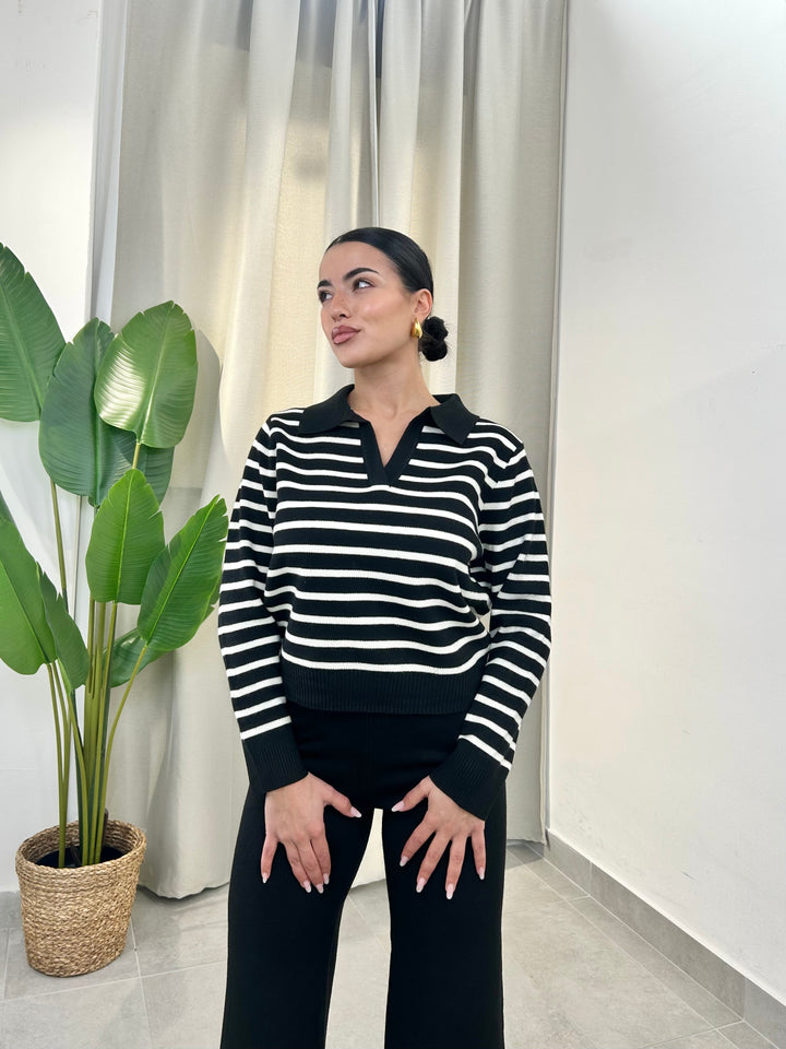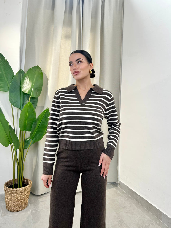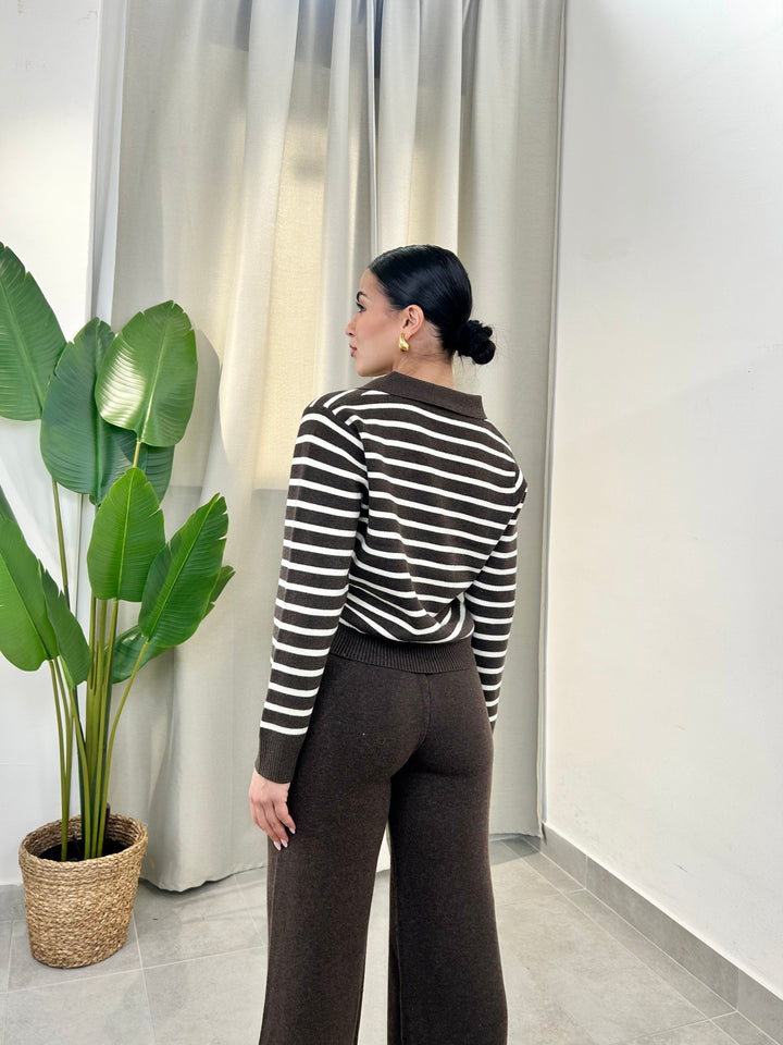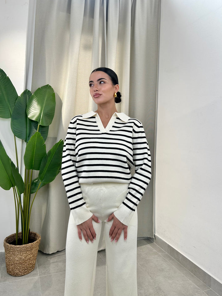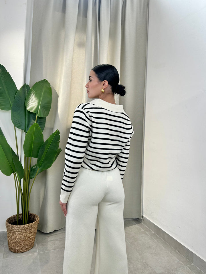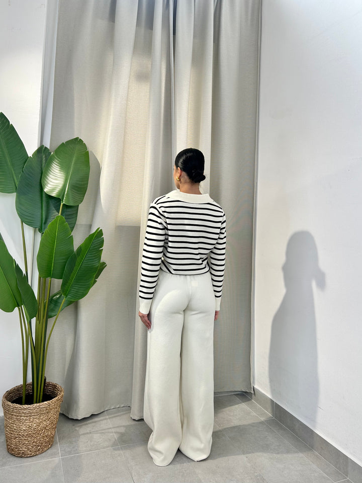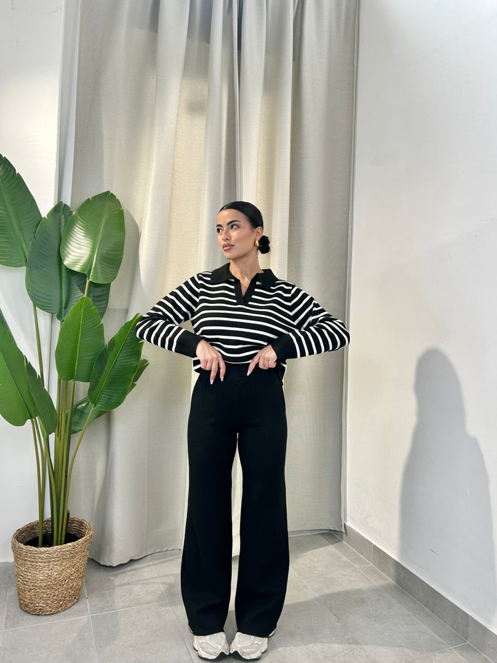 -Coordinato in lana rasata composto da Maglia scollo a V a righe+Pantalone palazzo con elastico in vita;