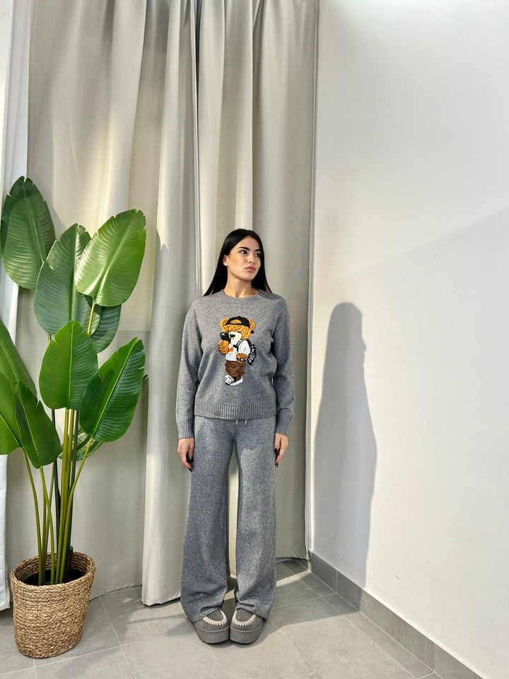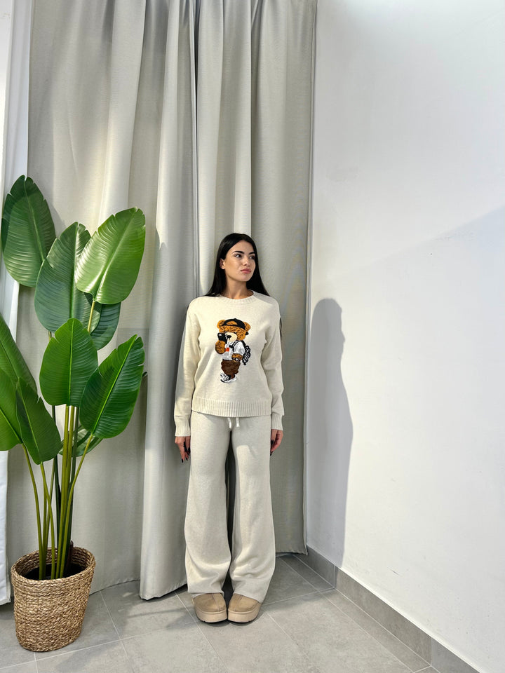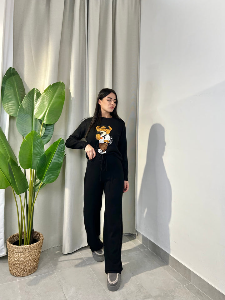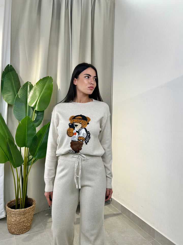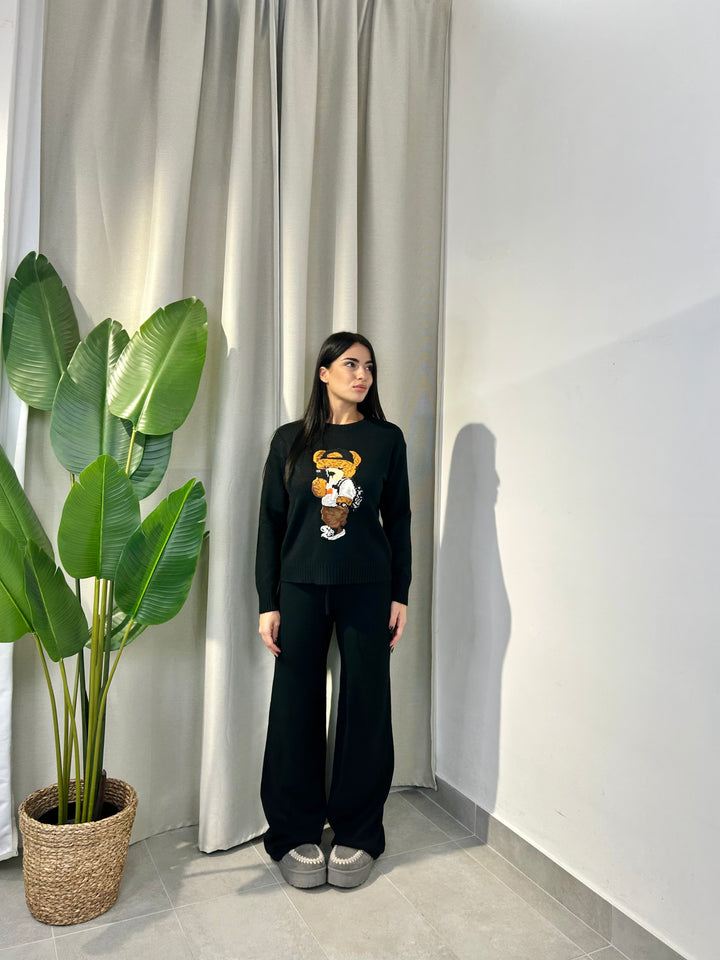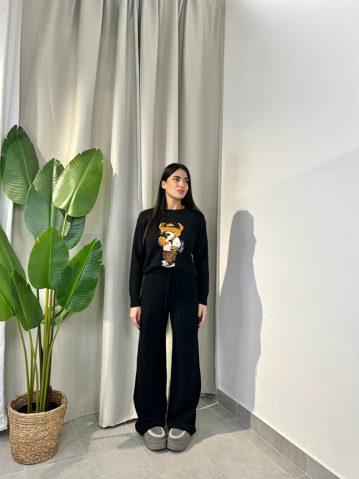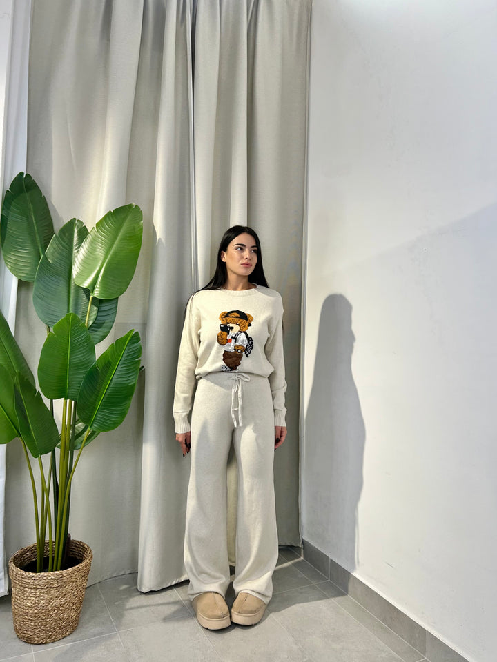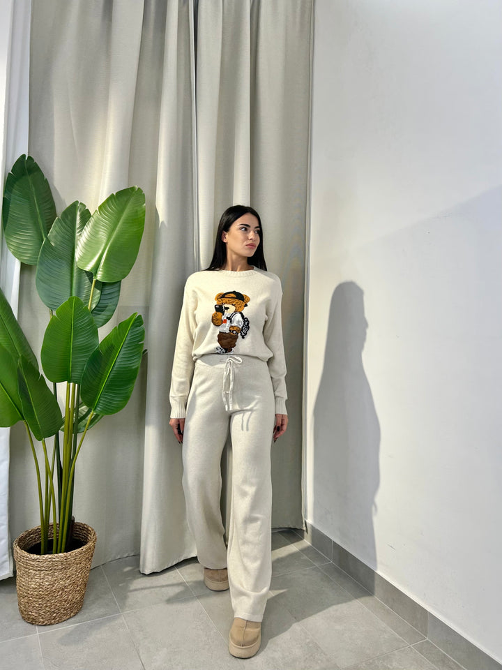 -Coordinato in lana composto da Maglia girocollo con Orsetto ricamato+Pantalone palazzo con coulisse regolabile in vita;