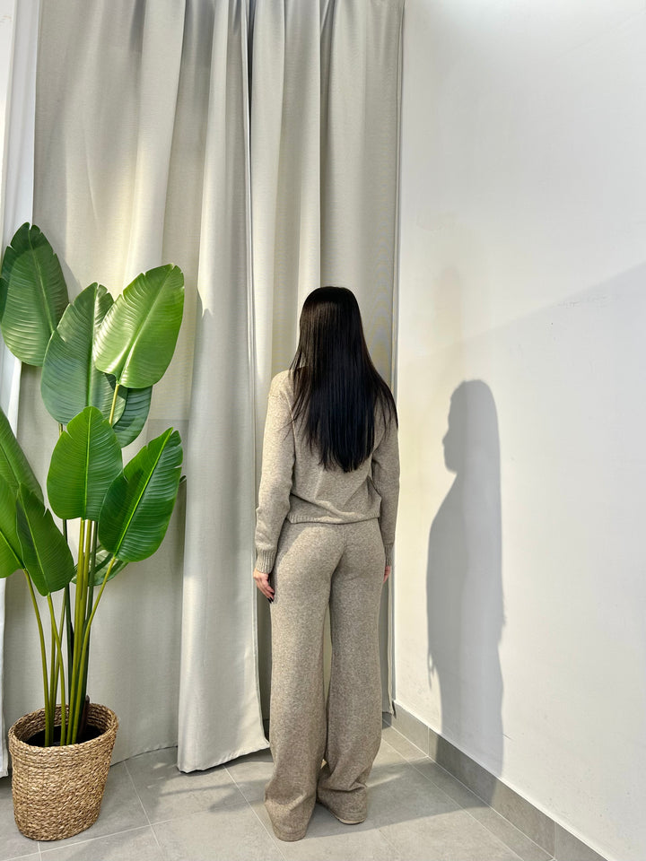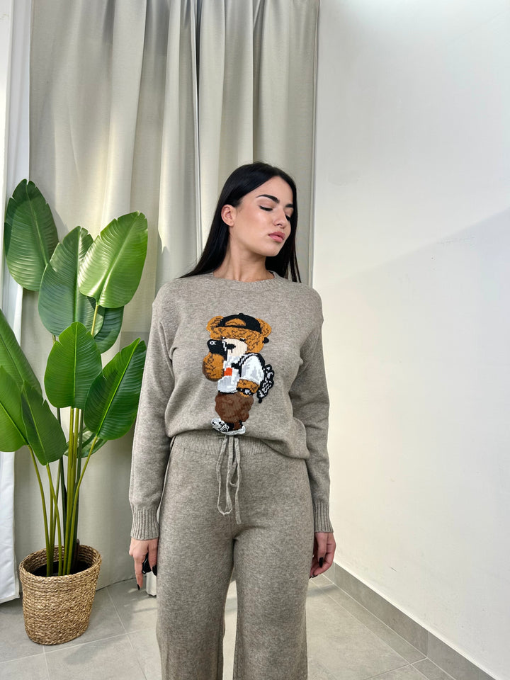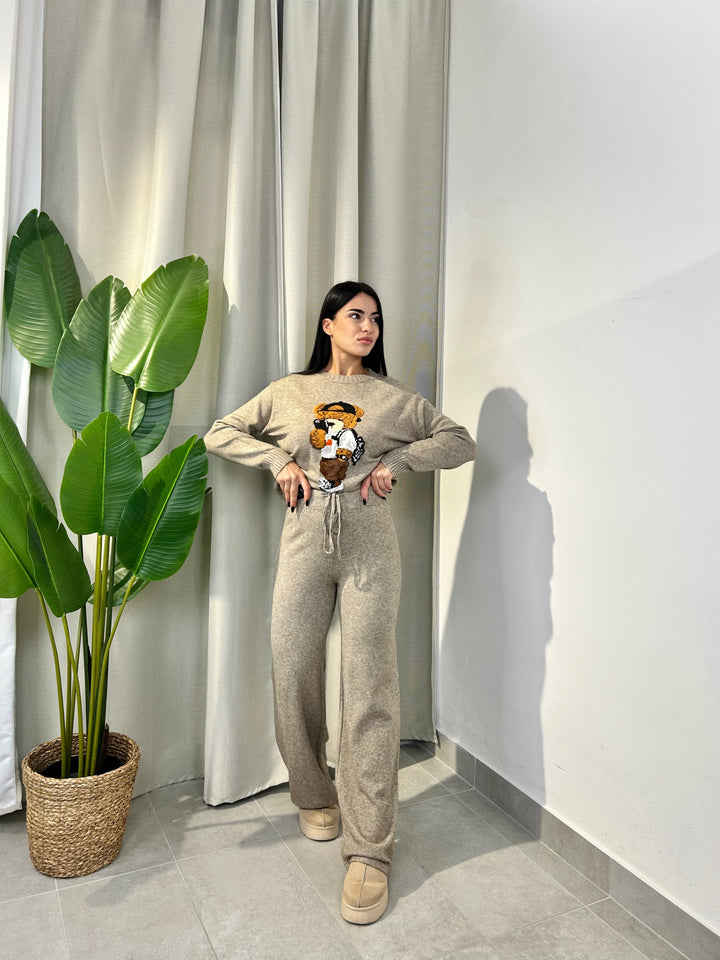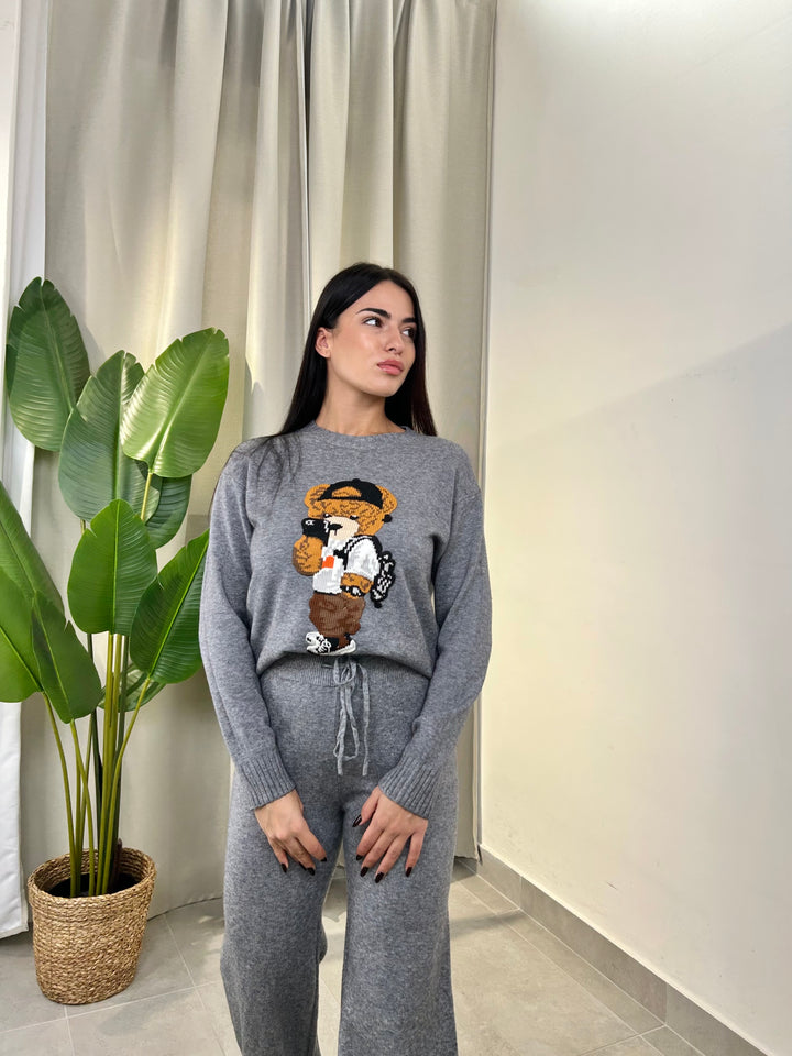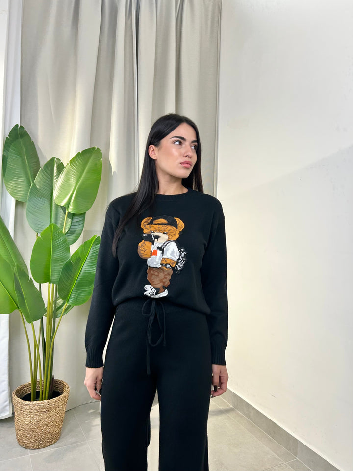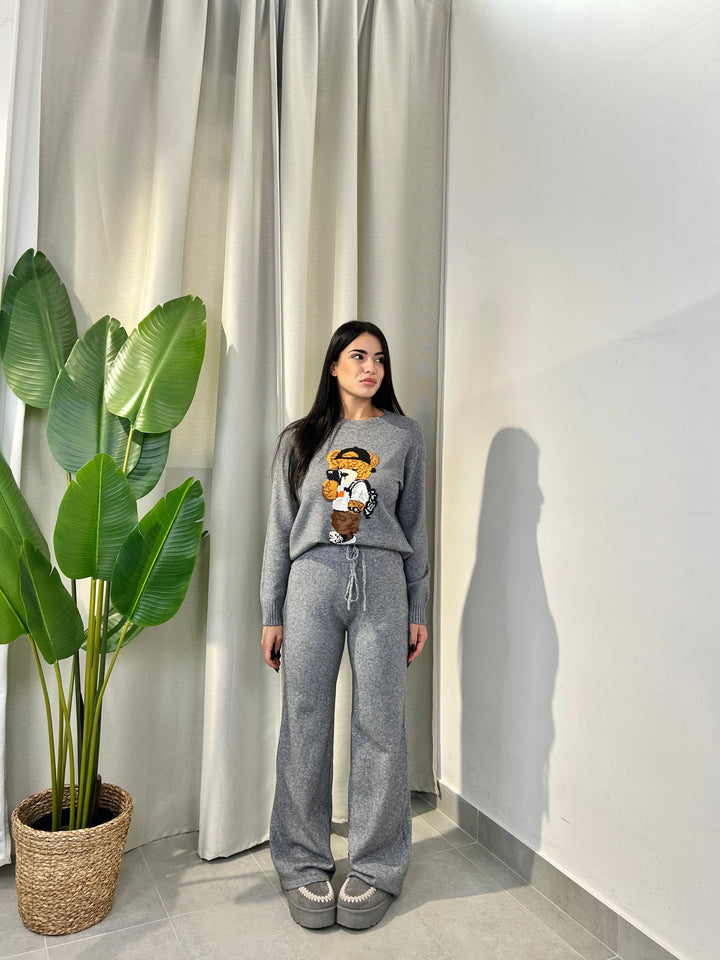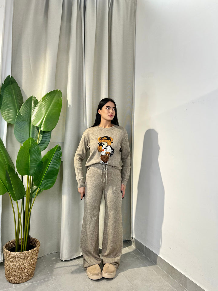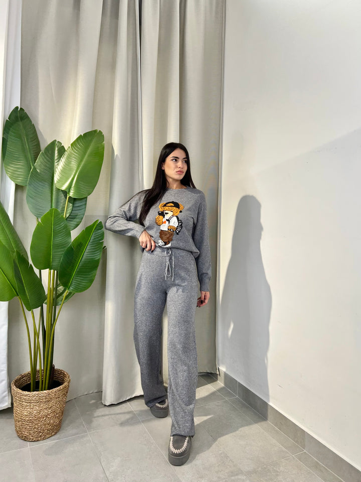 -Coordinato in lana composto da Maglia girocollo con Orsetto ricamato+Pantalone palazzo con coulisse regolabile in vita;
