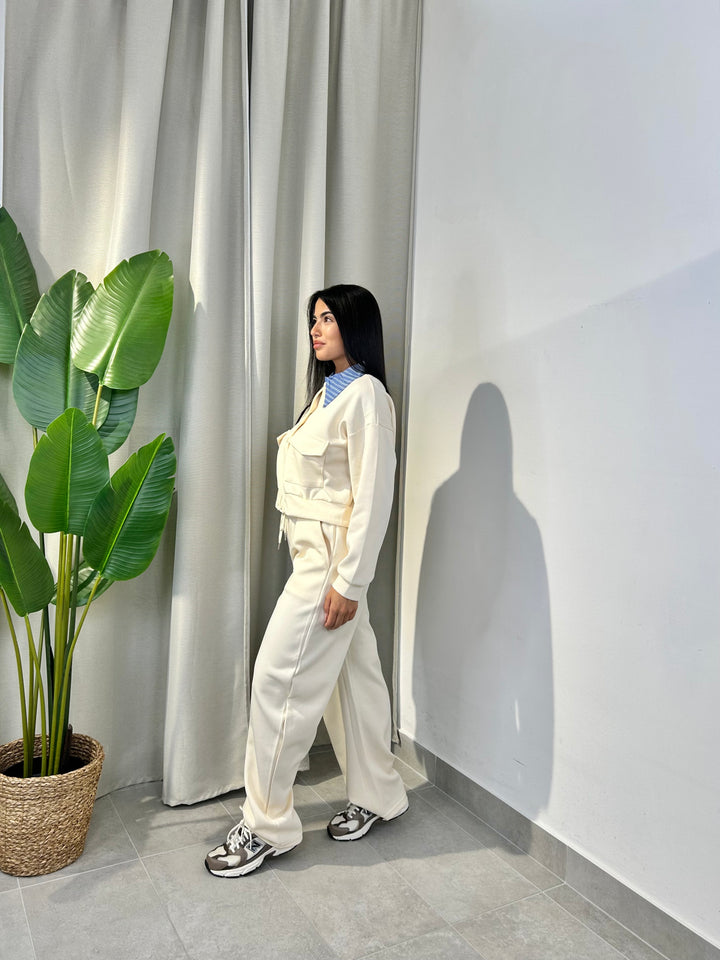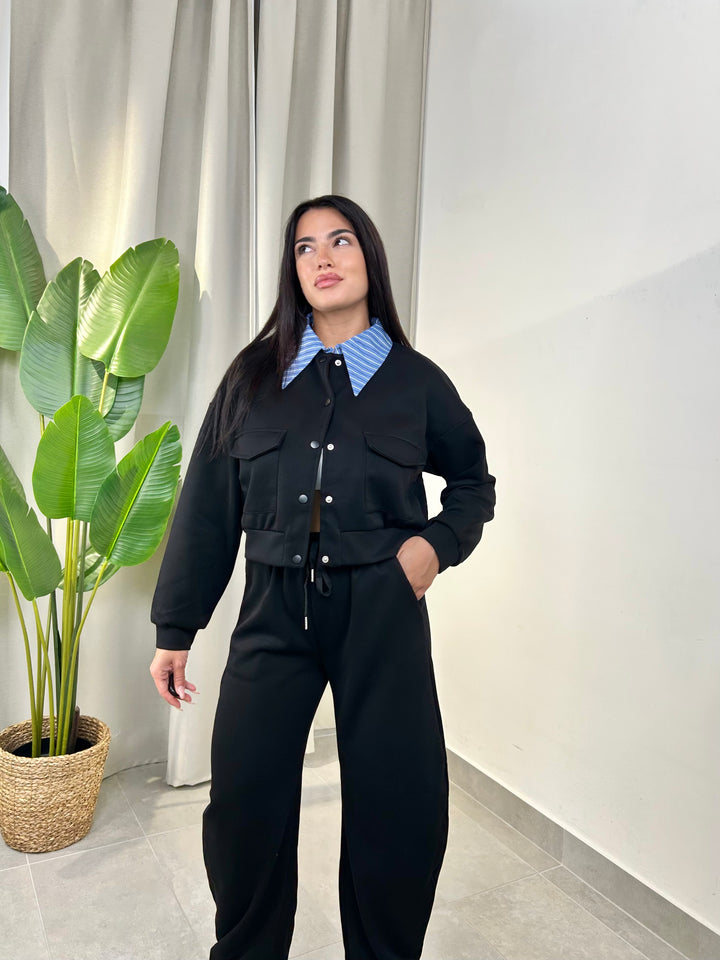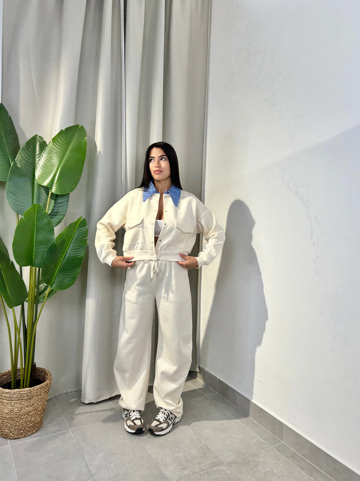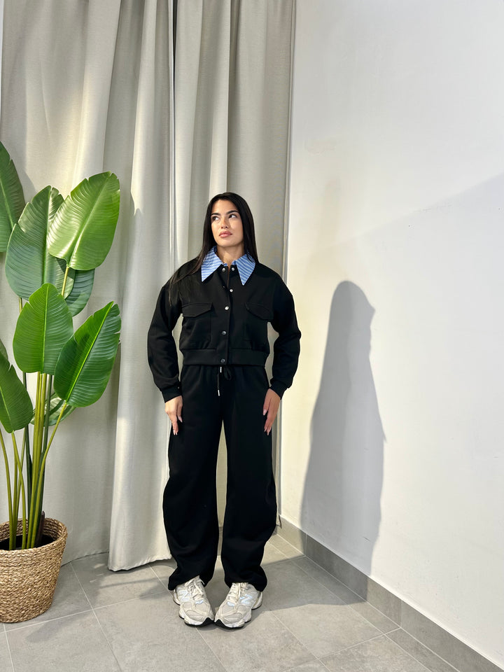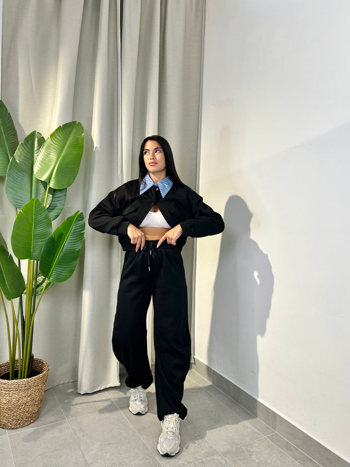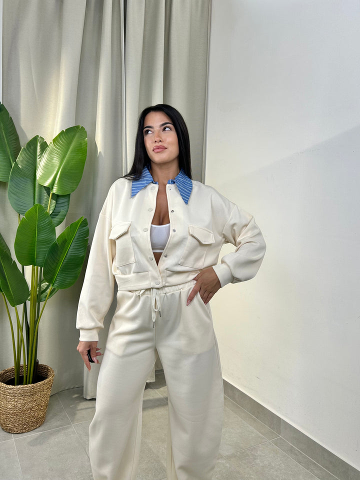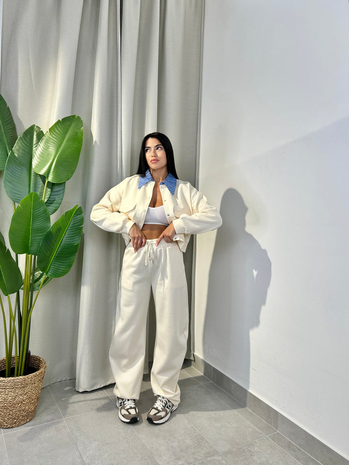 -Coordinato tuta in cotone garzato composto da Felpa modello college con colletto in cotone a righe+Pantalone Wide ballon con elastico regolabile in vita;