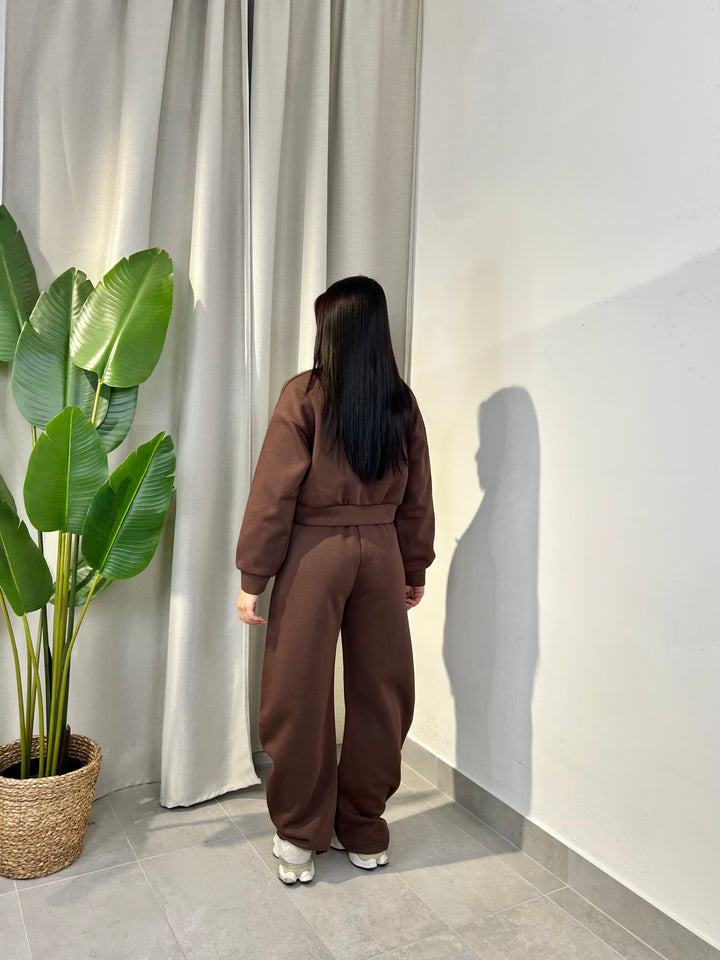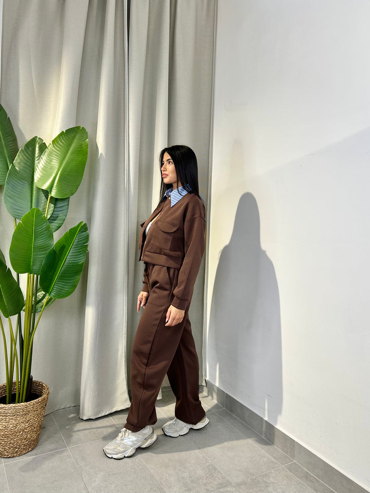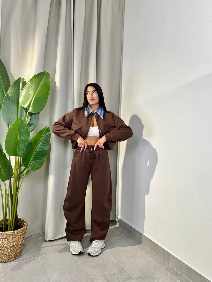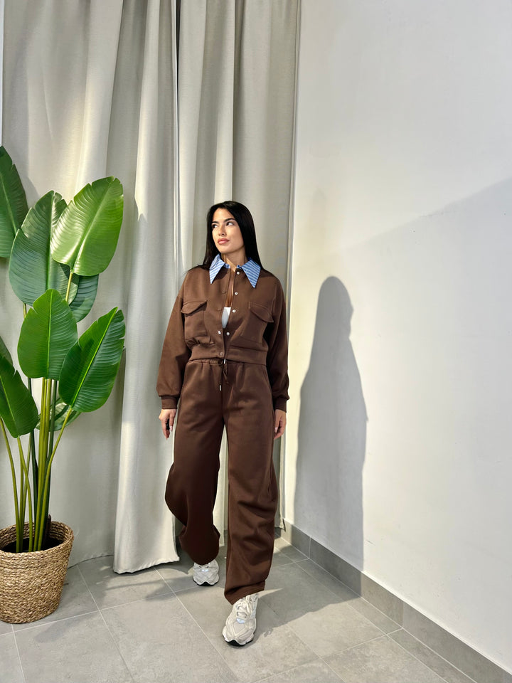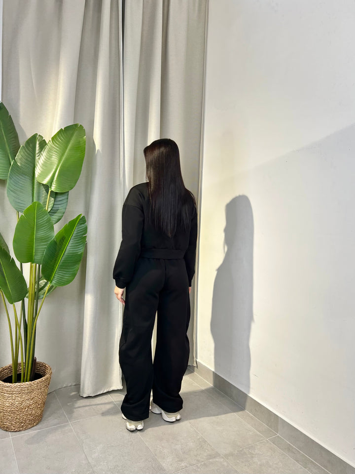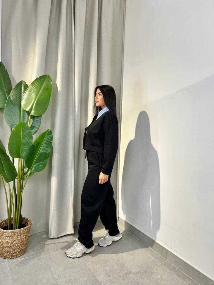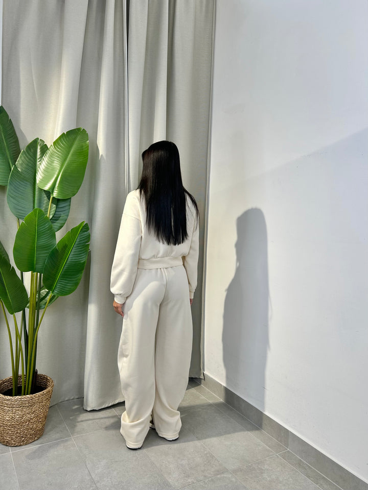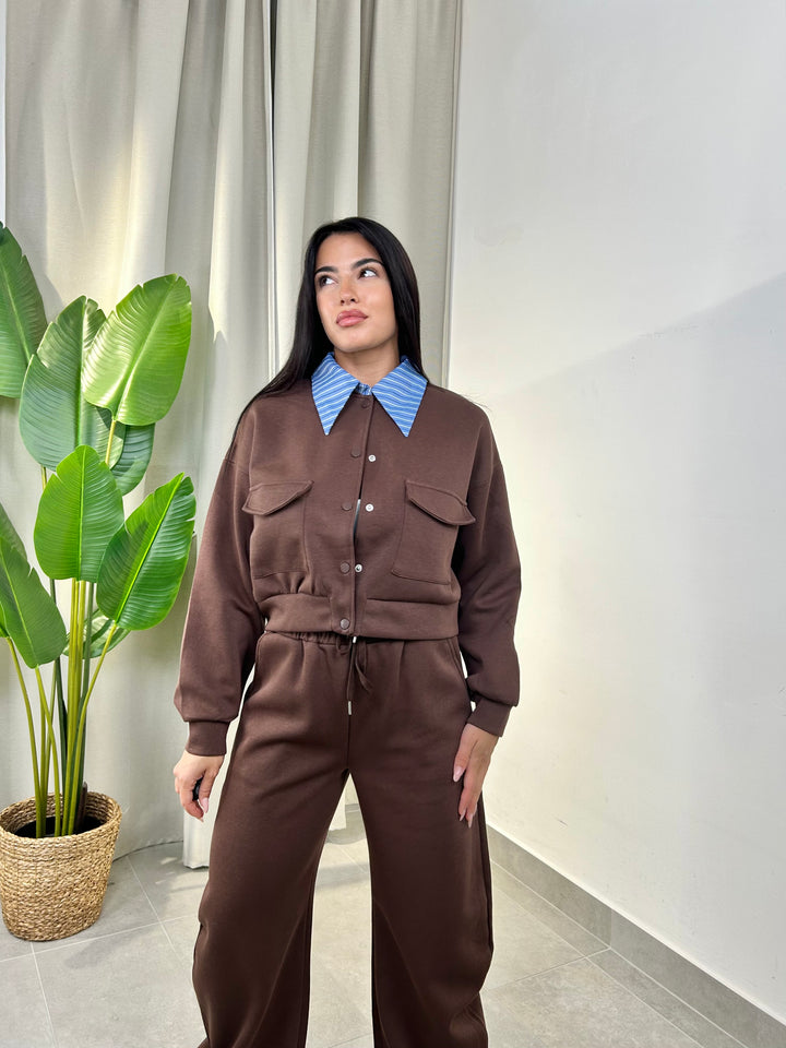 -Coordinato tuta in cotone garzato composto da Felpa modello college con colletto in cotone a righe+Pantalone Wide ballon con elastico regolabile in vita;