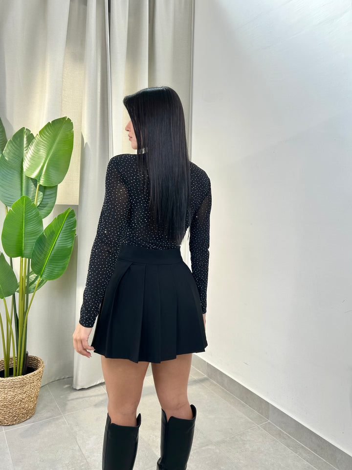 -Gonnellina plissettata in cotone elasticizzato con bottoni centrali e pantaloncino cucito sotto;