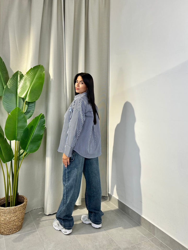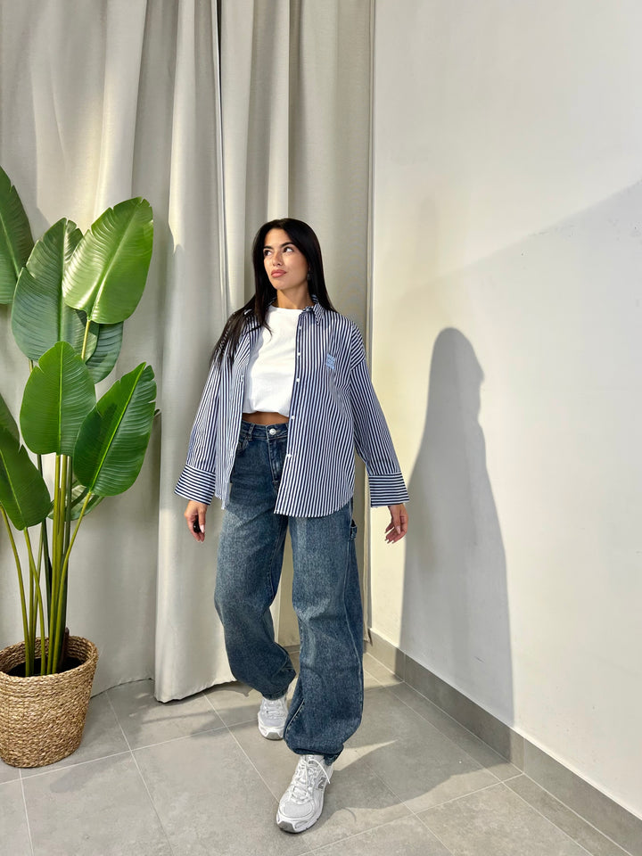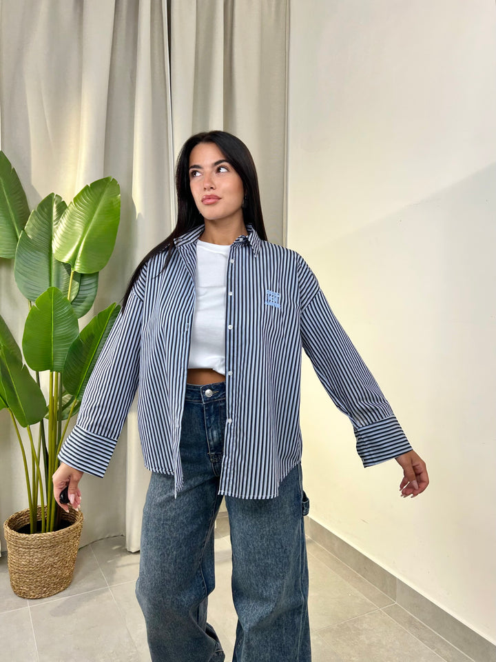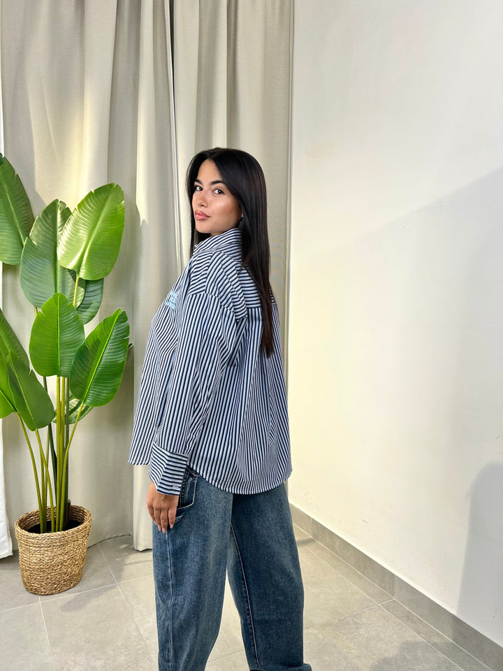 -Camicia in cotone a righe con scritta ricamata laterale;