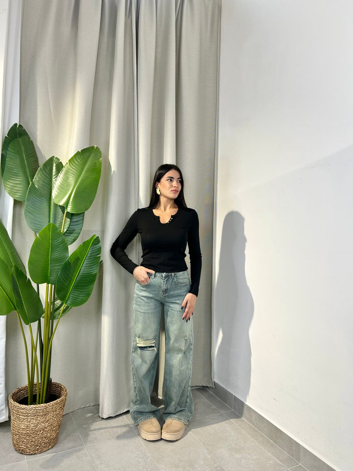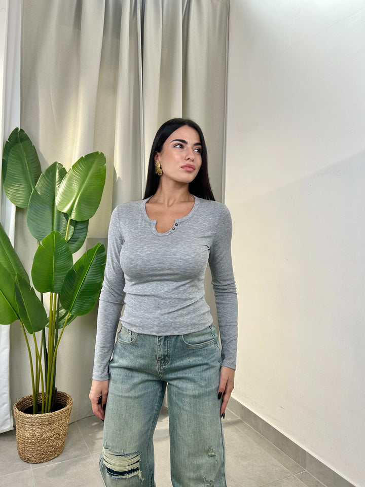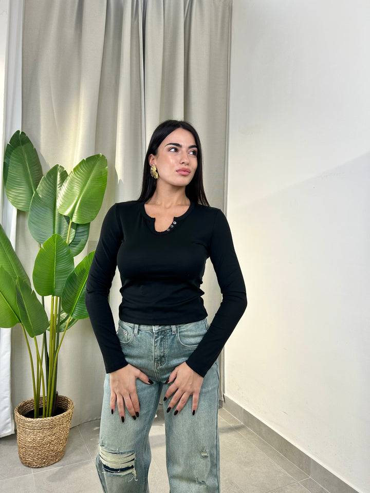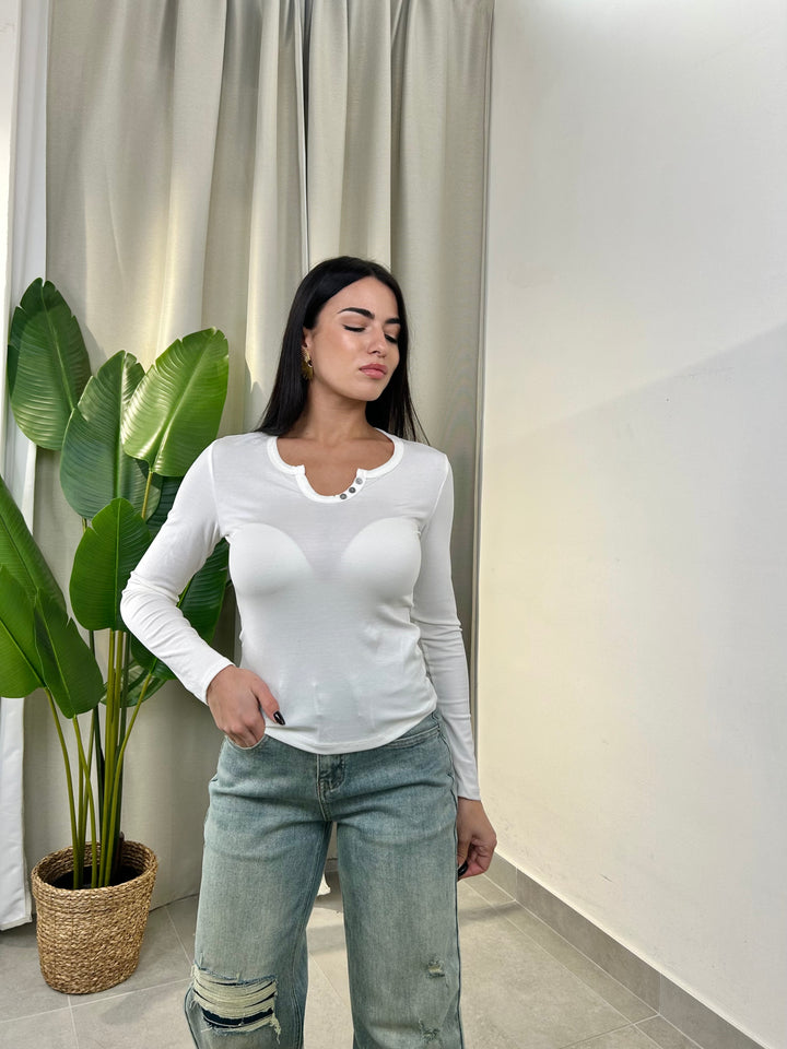 -Maglia 92% cotone con scollo rotondo e finti bottoncini;