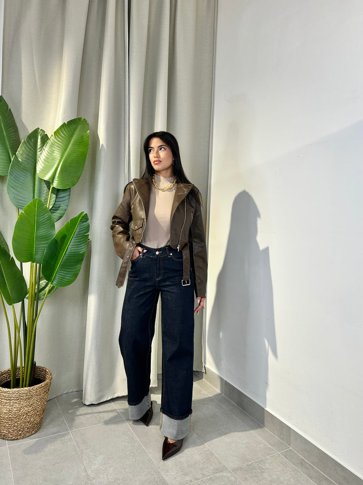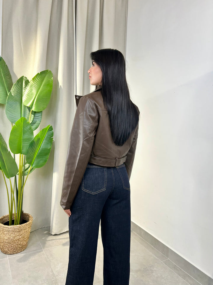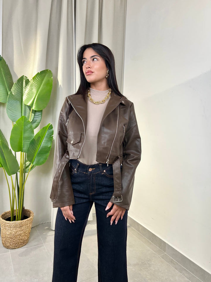 -Chiodo in ecopelle marrone con cintura removibile in vita;