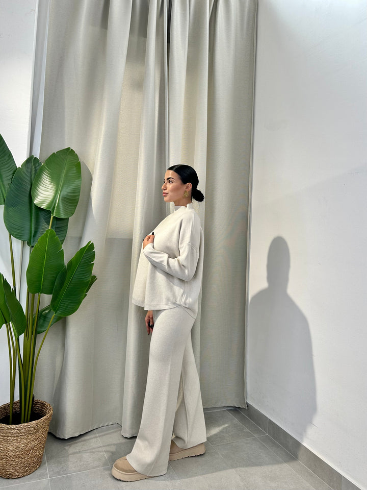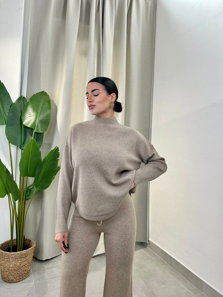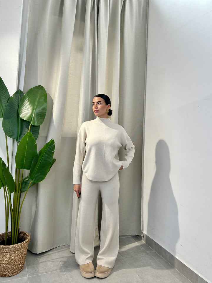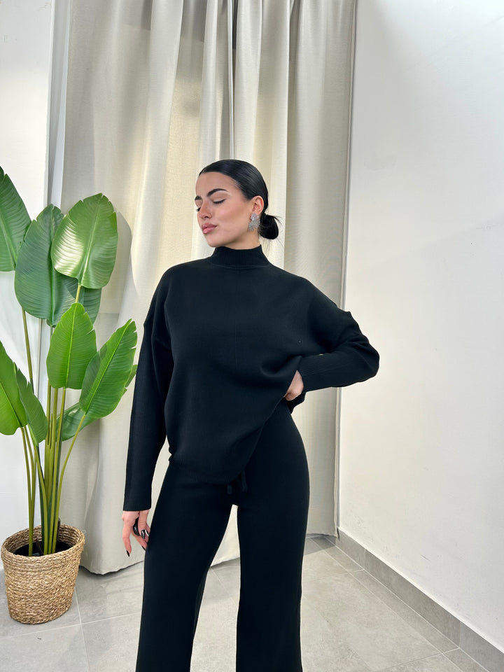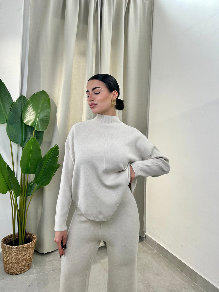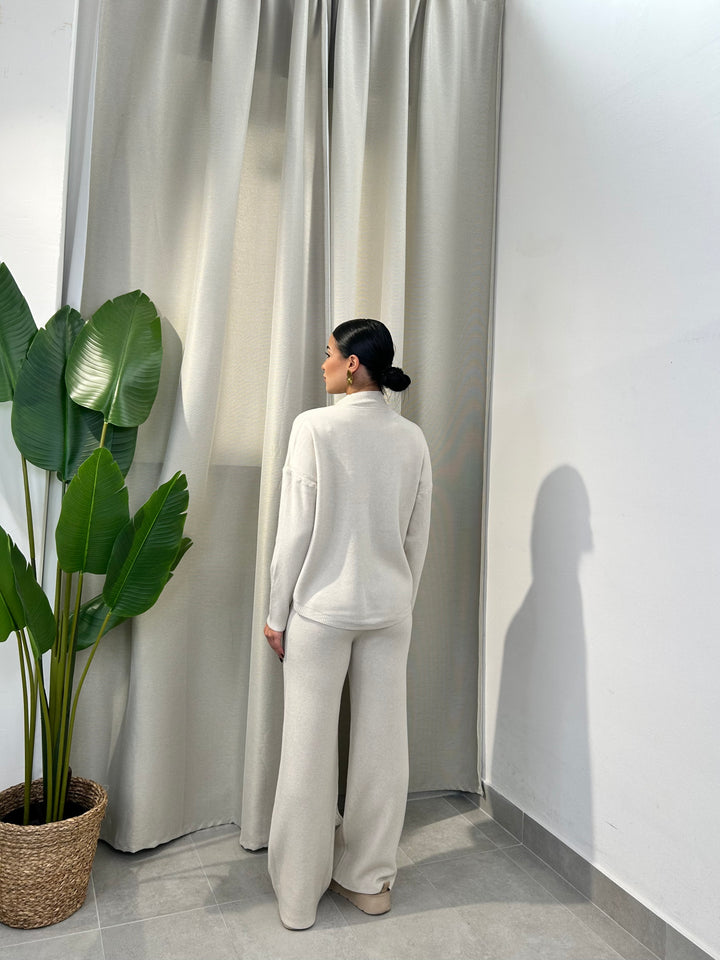-Coordinato in lana rasata composto da Maglioncino mezzo collo oversize+Pantalone palazzo con coulisse regolabile in vita;