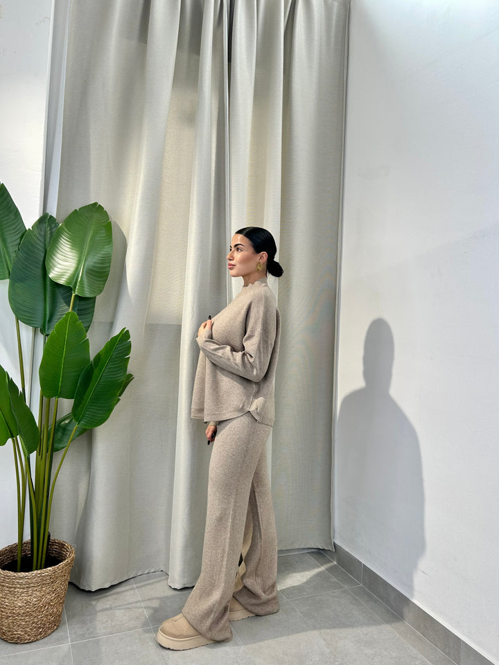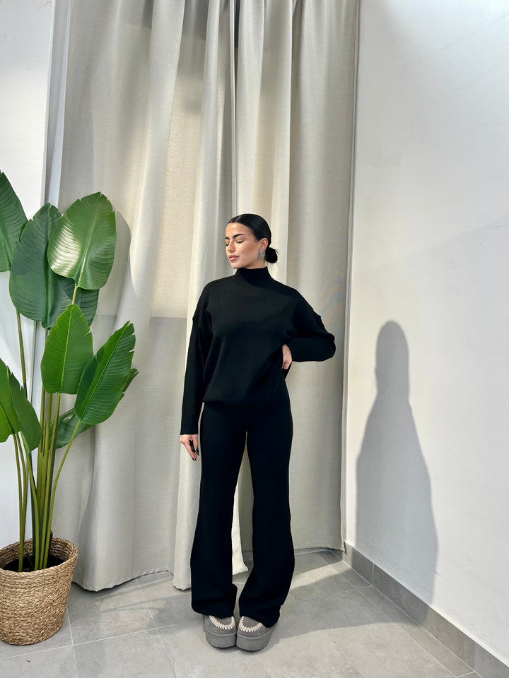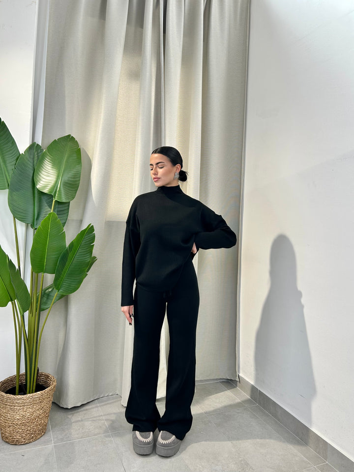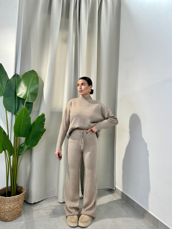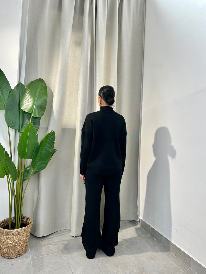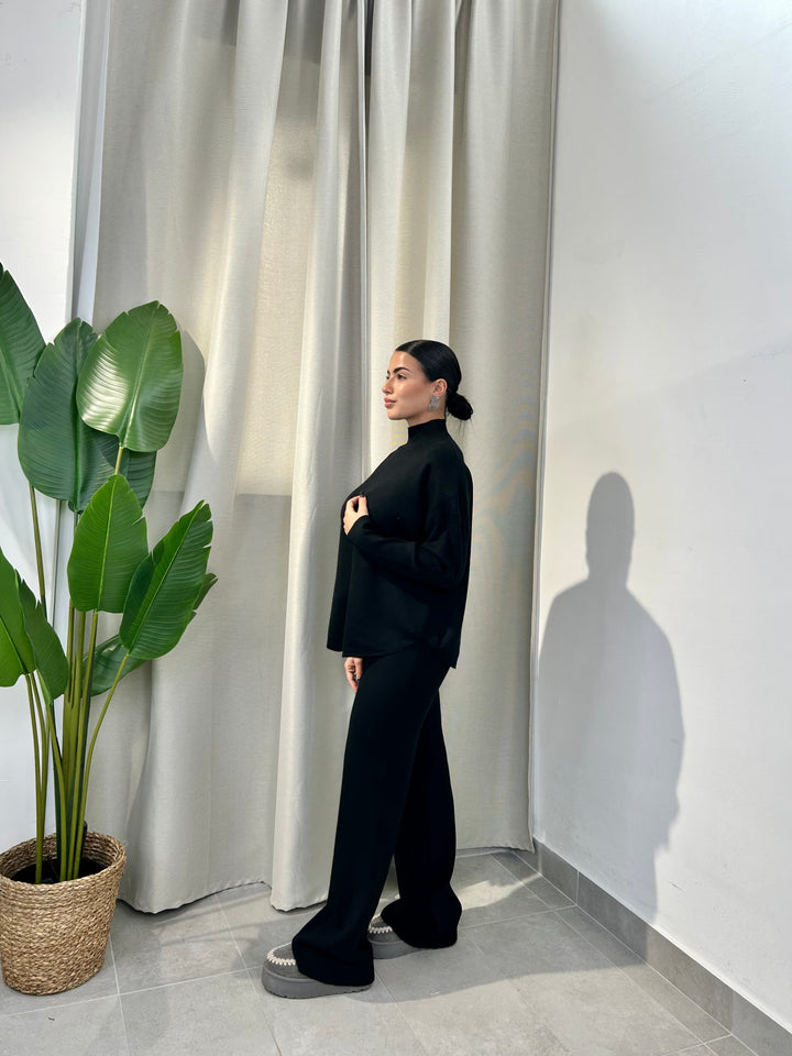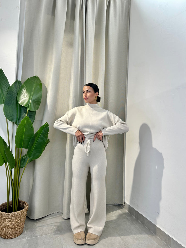 -Coordinato in lana rasata composto da Maglioncino mezzo collo oversize+Pantalone palazzo con coulisse regolabile in vita;