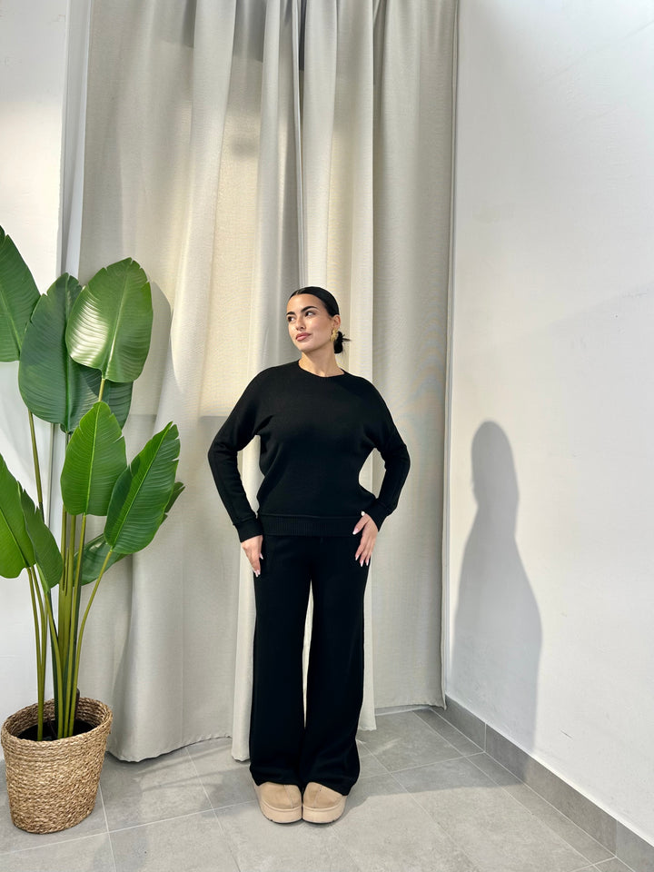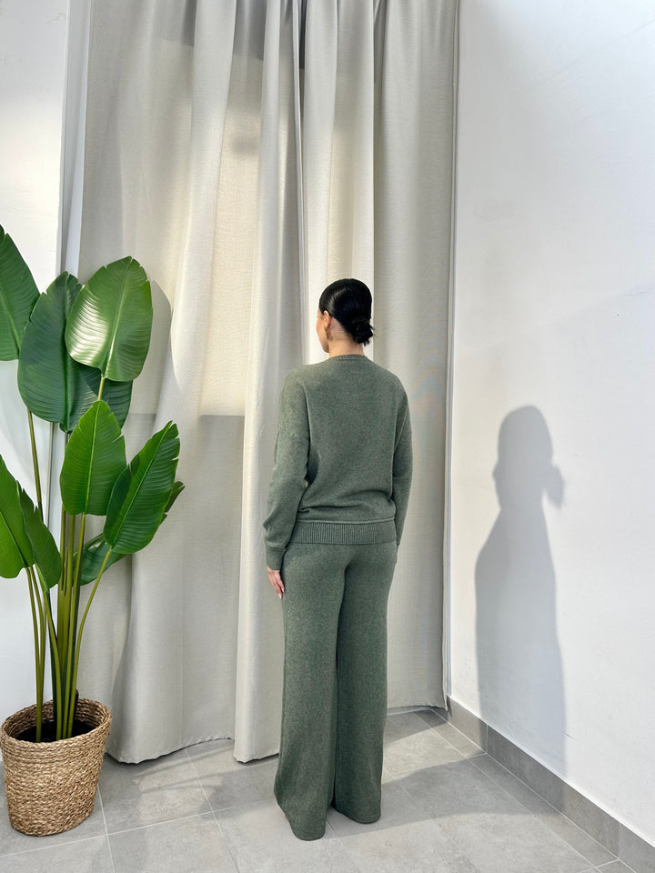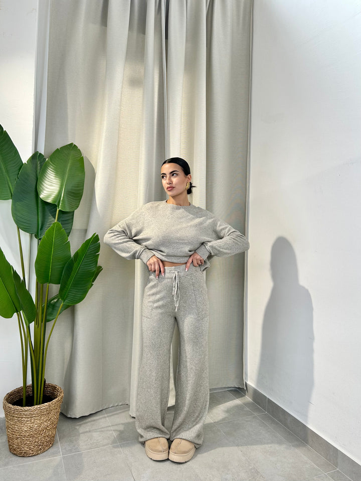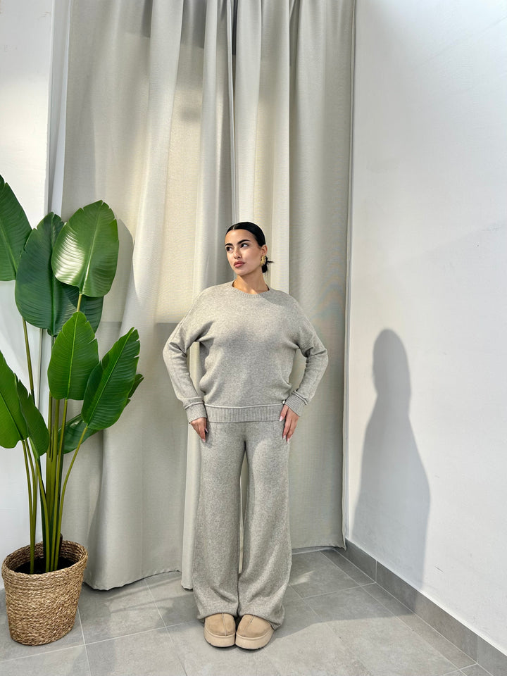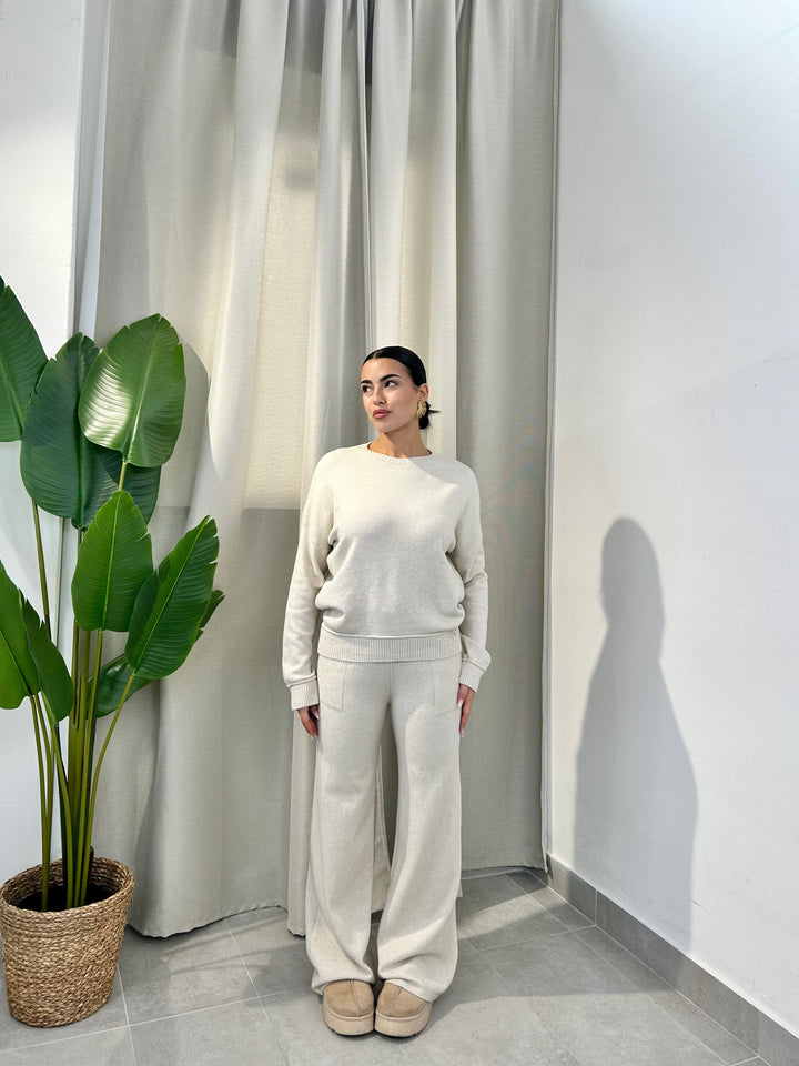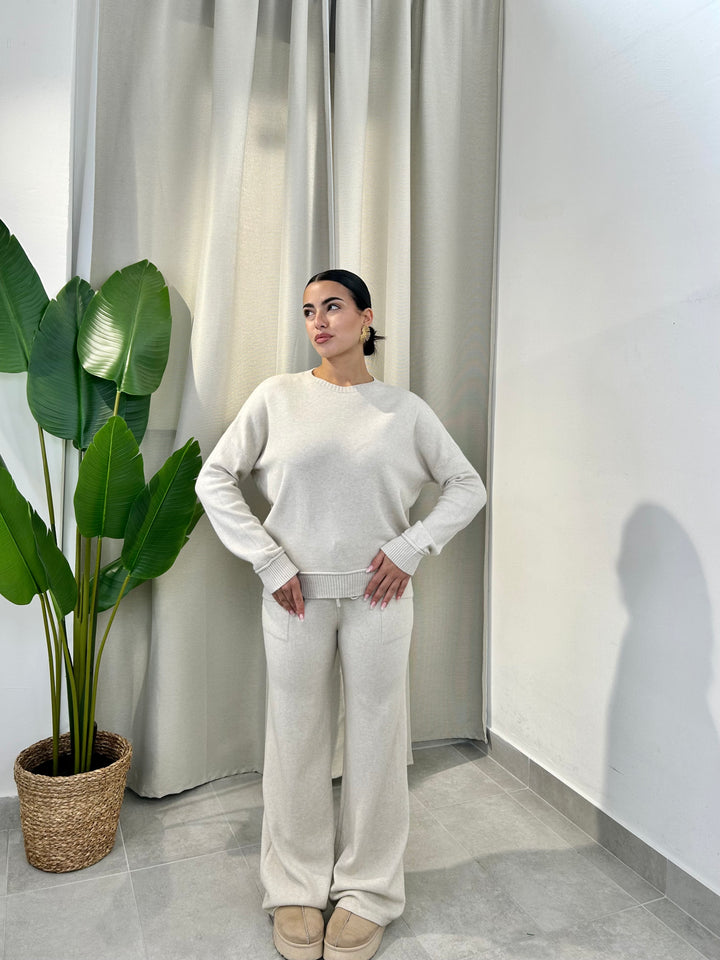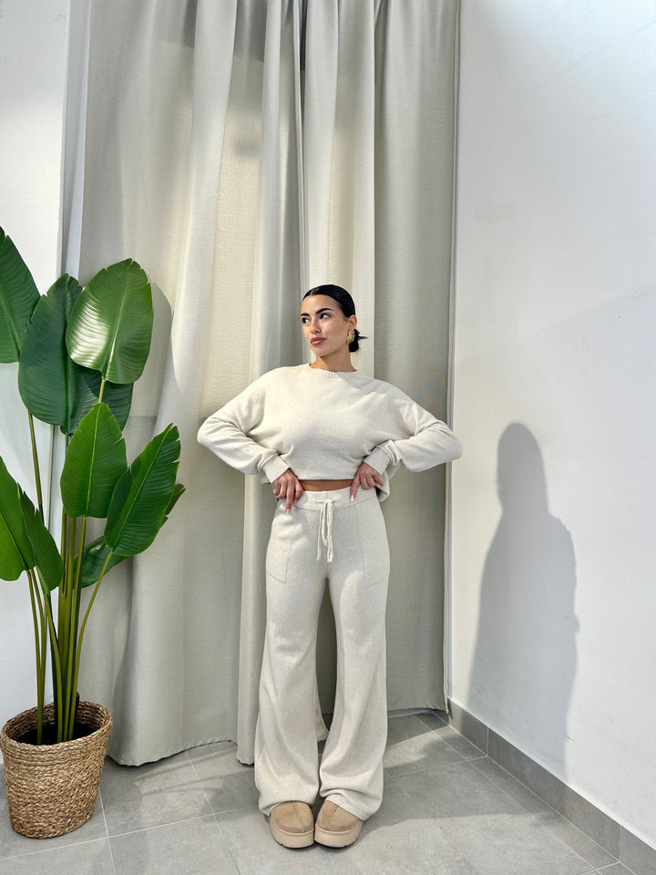 -Coordinato in lana rasata composto da Maglioncino girocollo oversize+Pantalone palazzo con coulisse regolabile in vita;