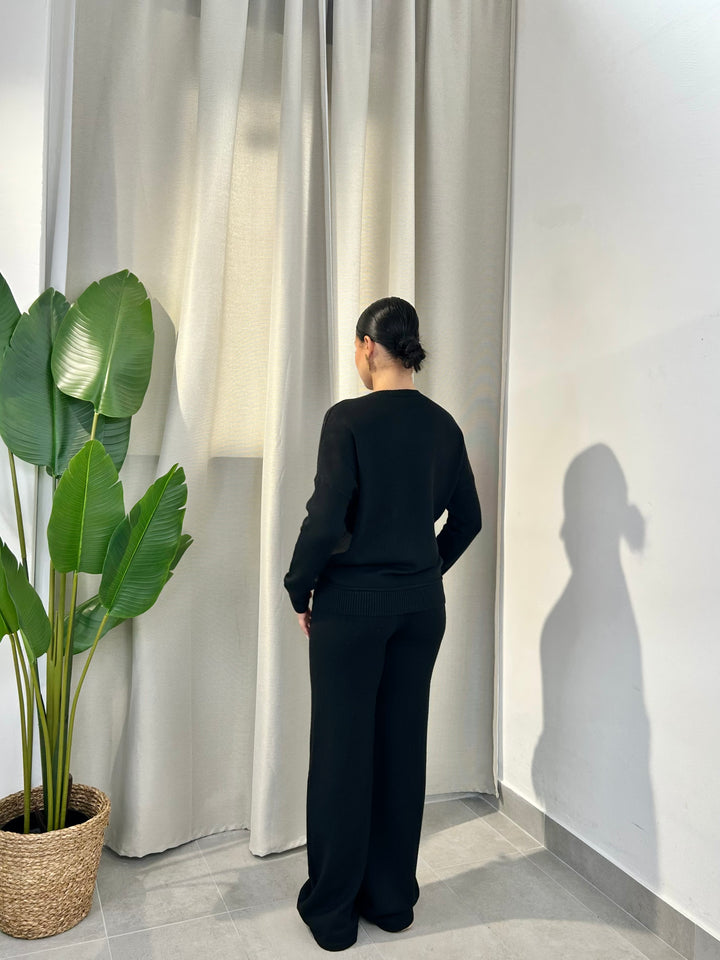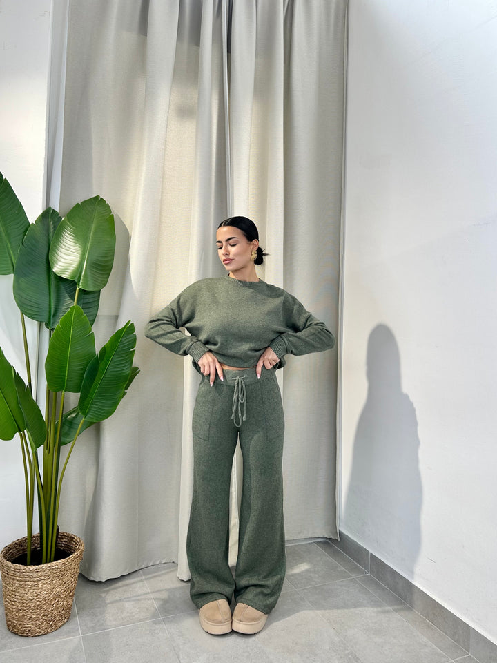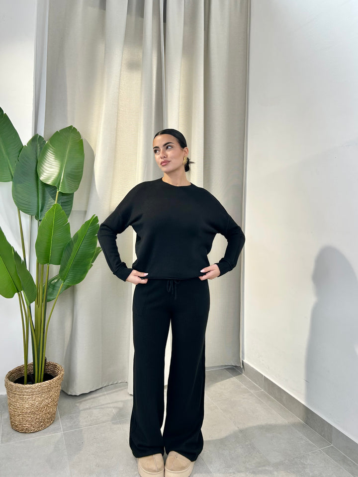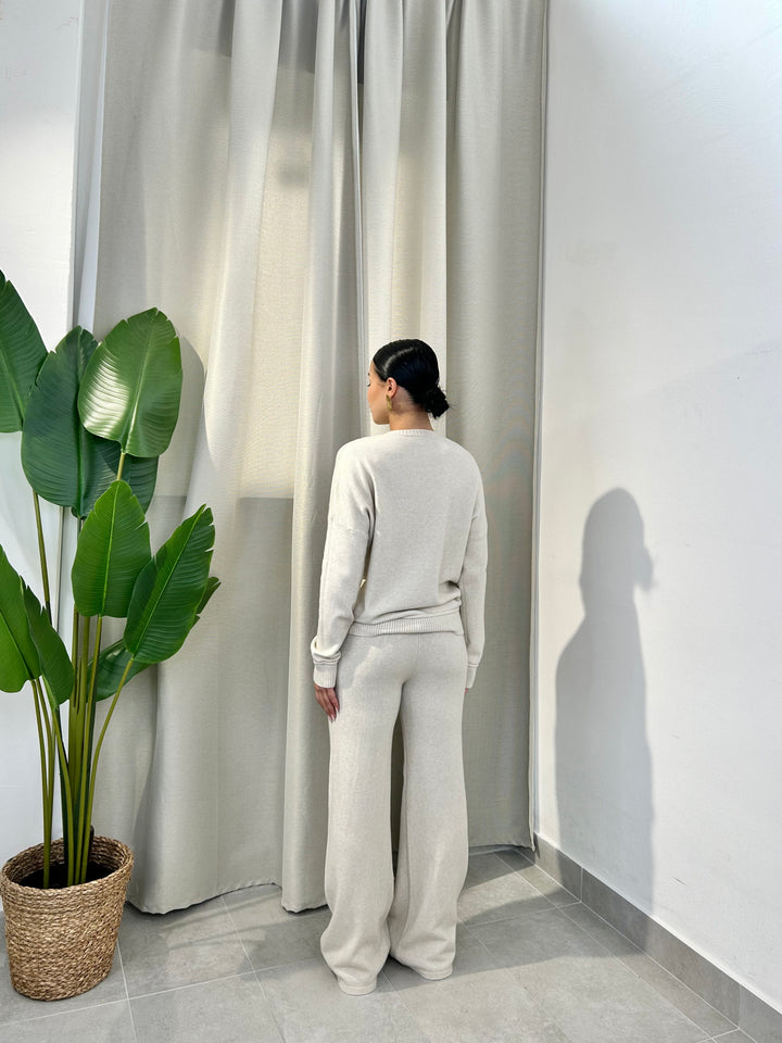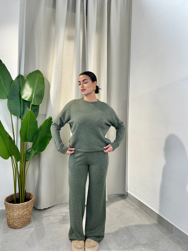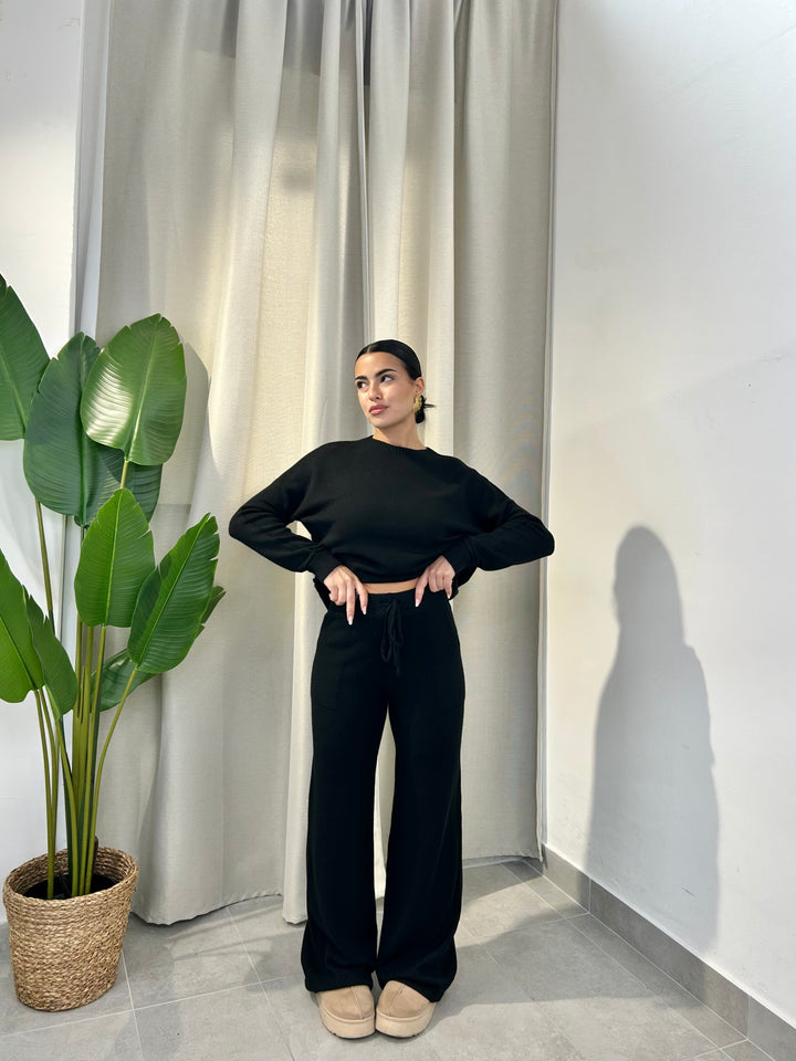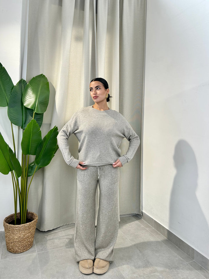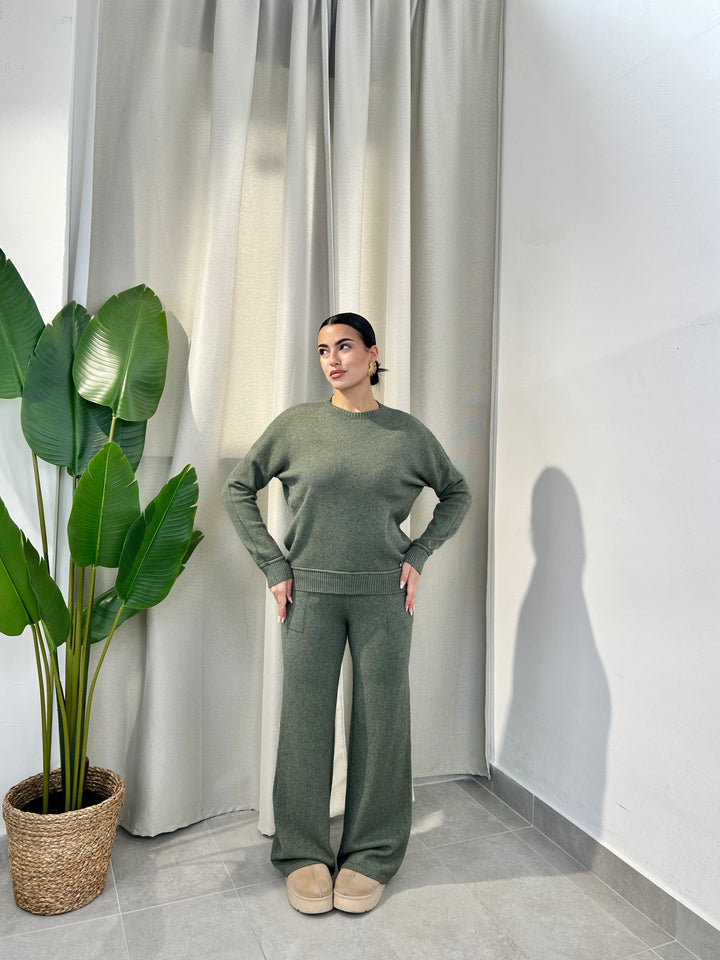 -Coordinato in lana rasata composto da Maglioncino girocollo oversize+Pantalone palazzo con coulisse regolabile in vita;