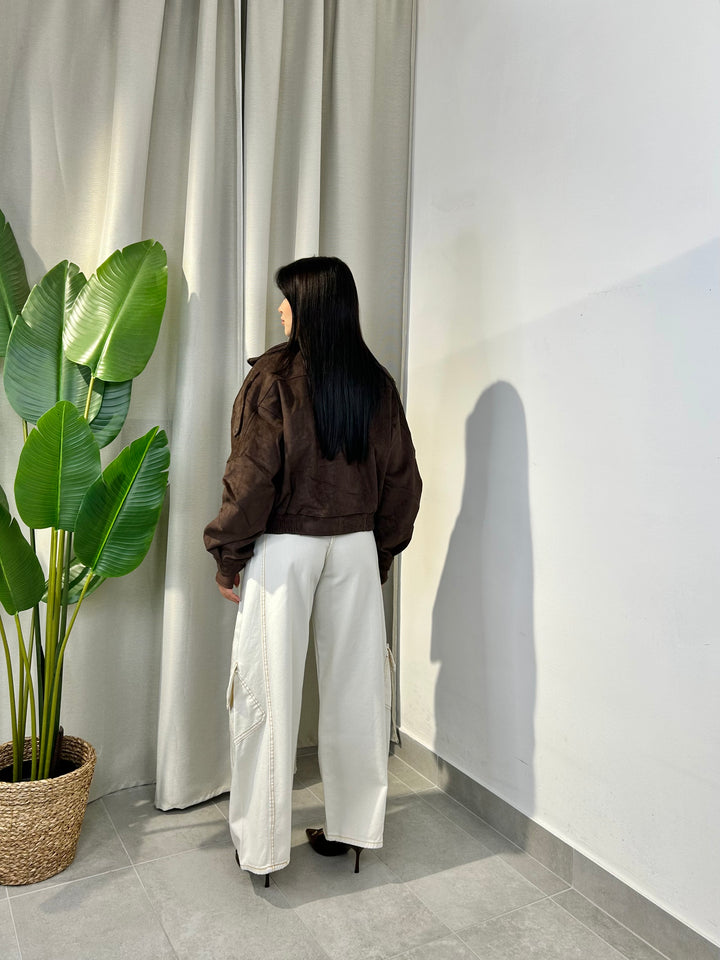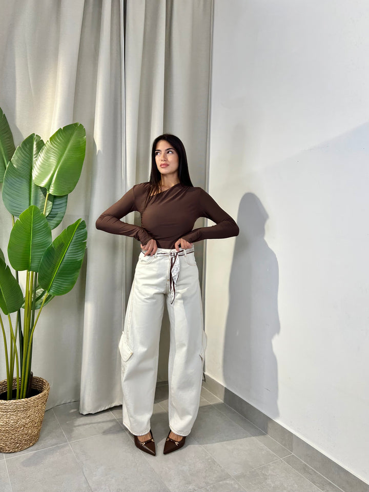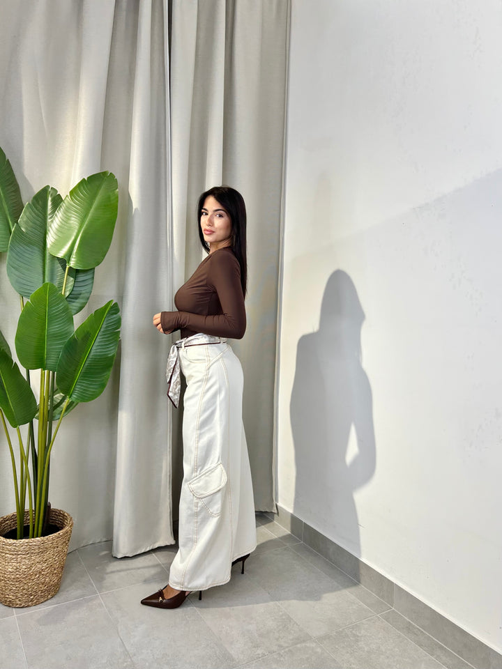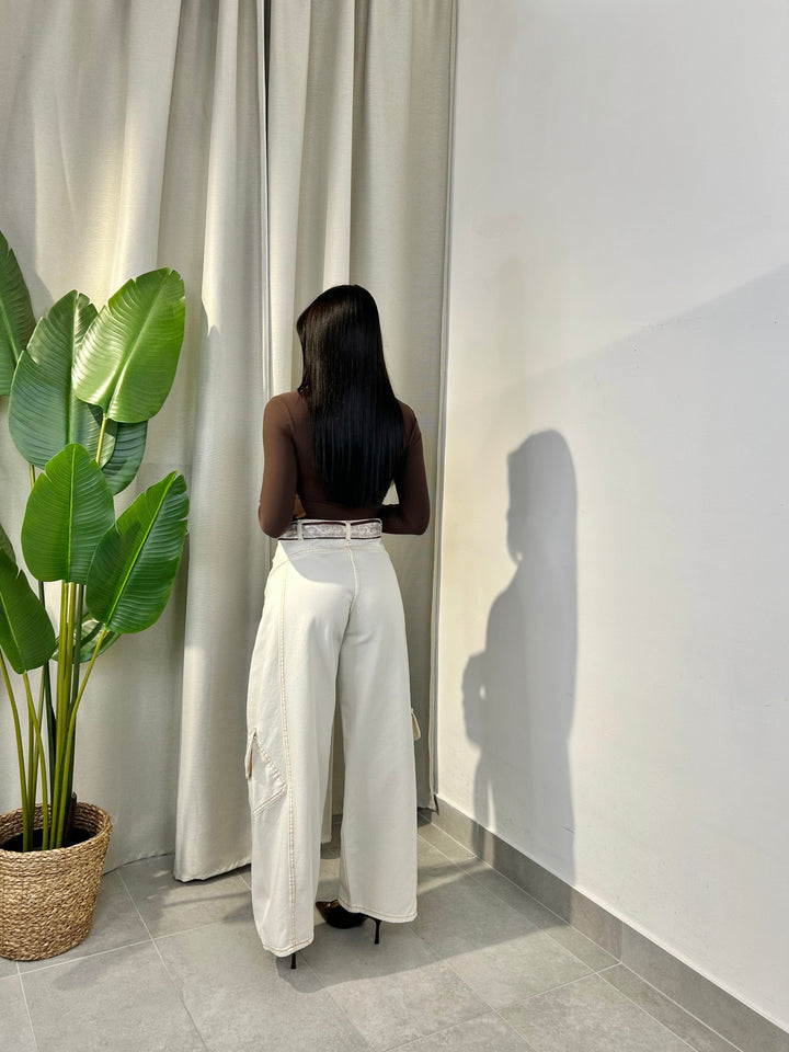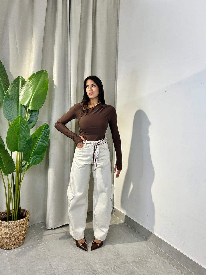 -Jeans beige modello wide ballon con tasche laterali;Compreso di foulard;