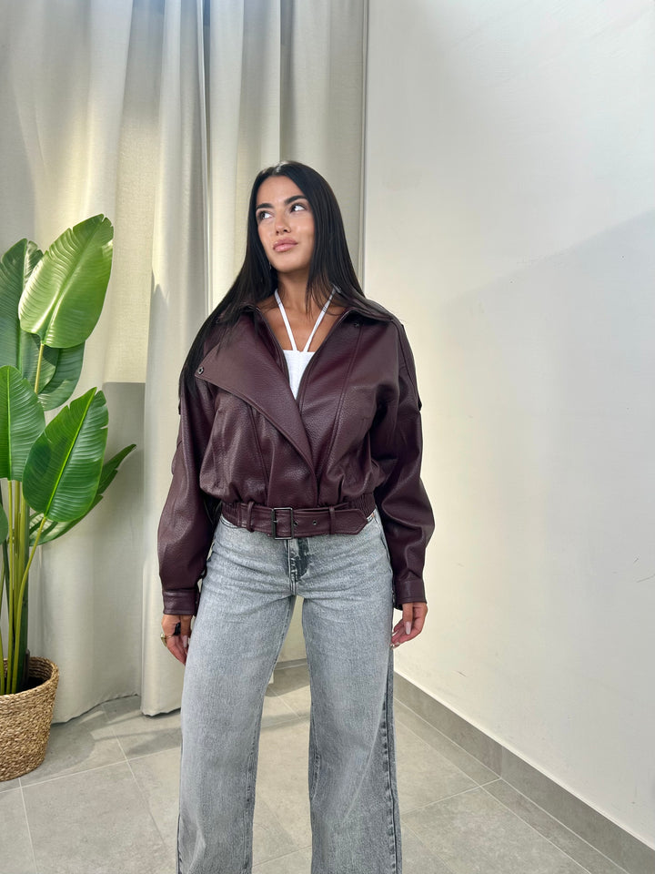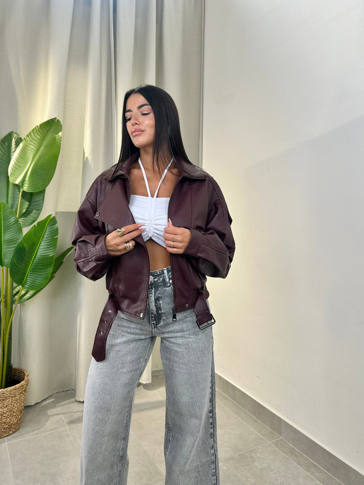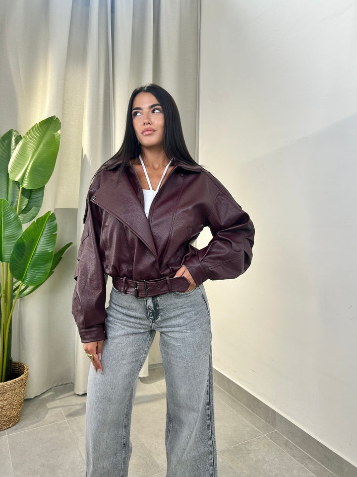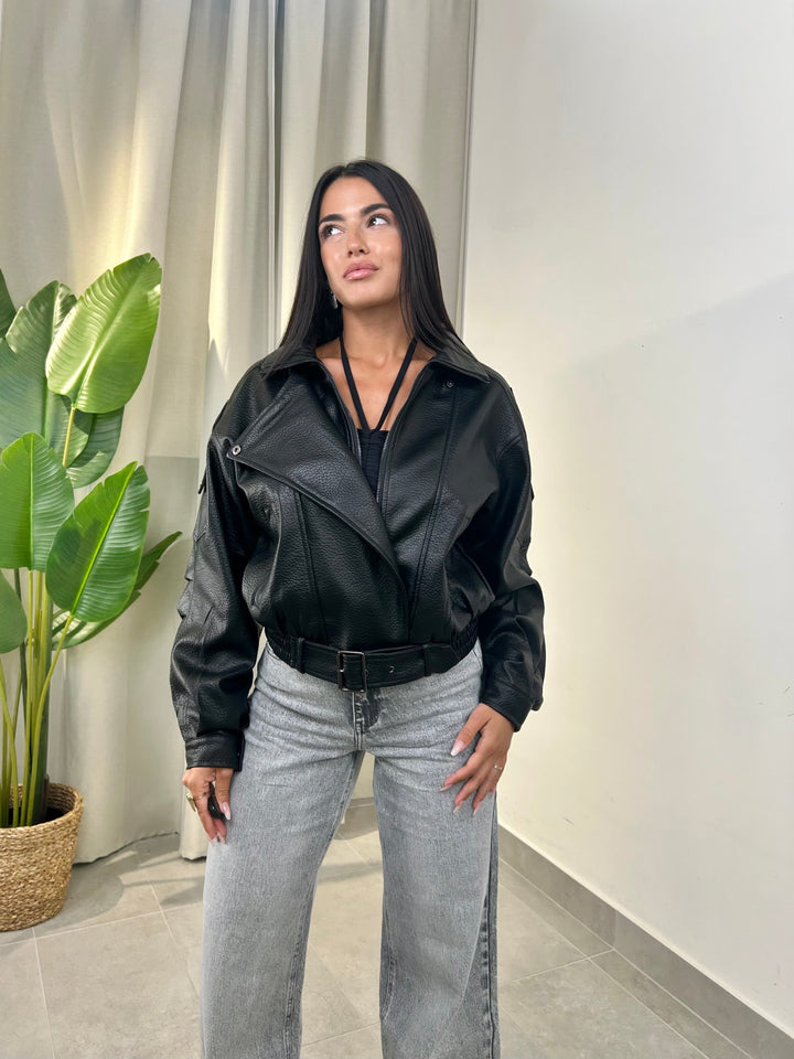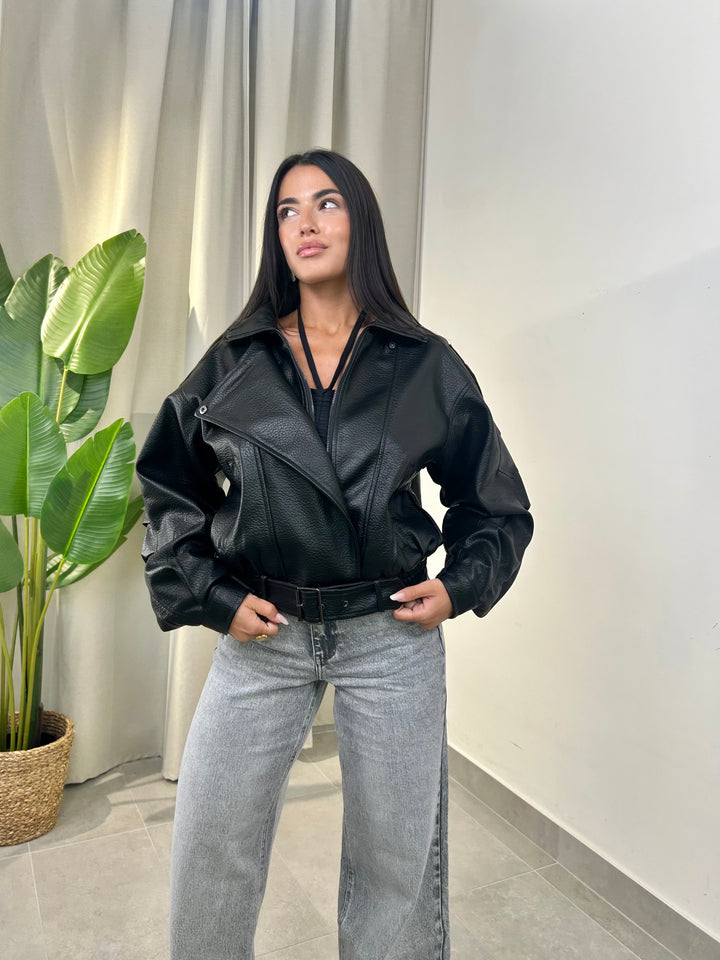 -Chiodo in ecopelle oversize con elastico in vita e cintura fissa;