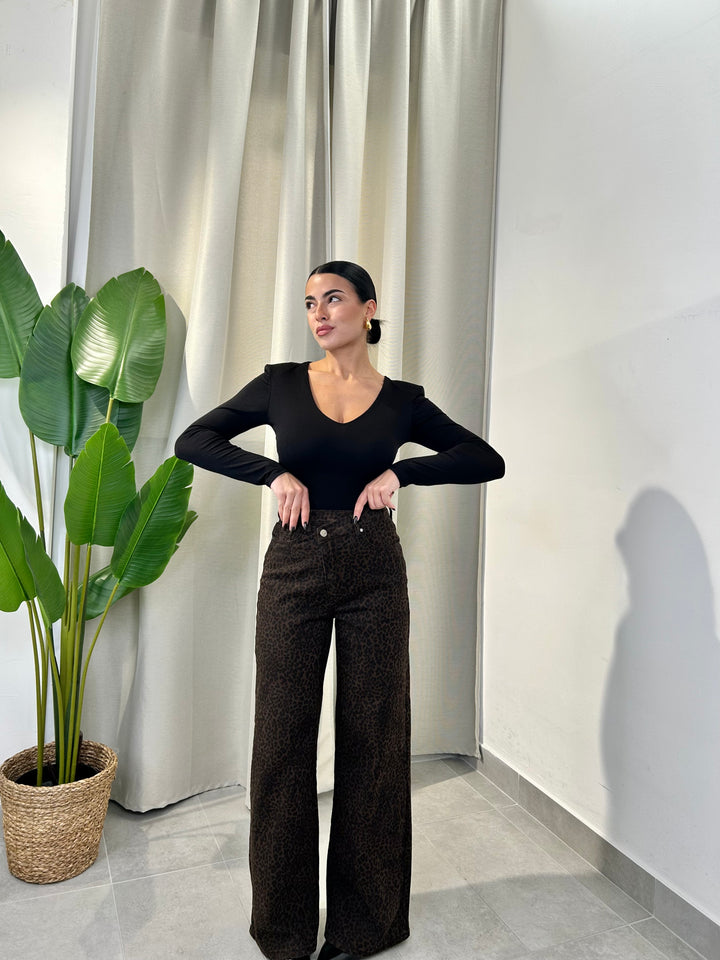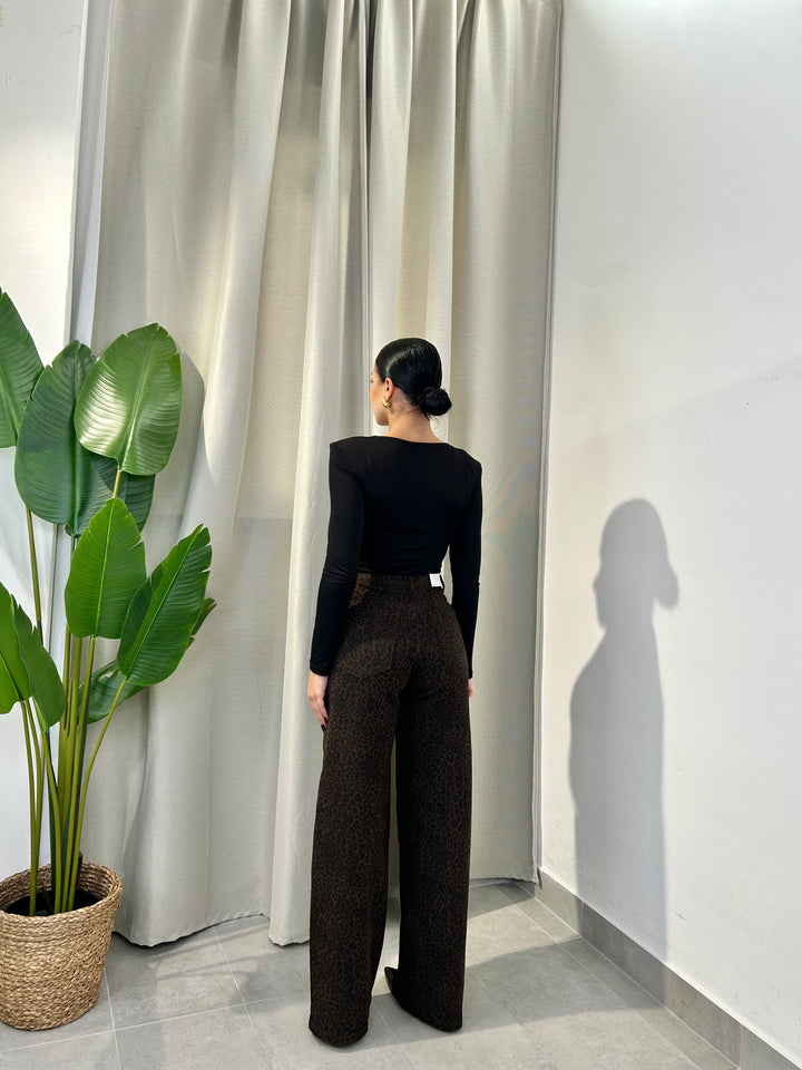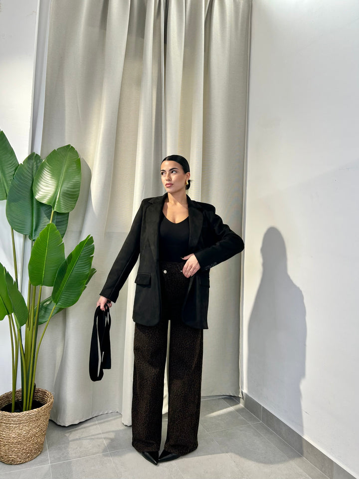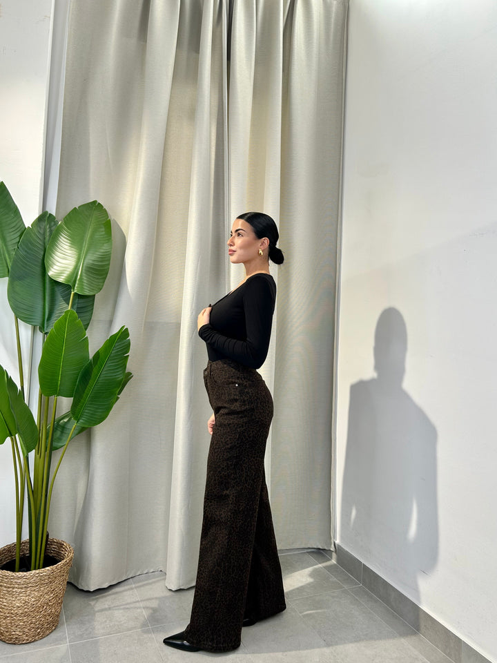 -Jeans fantasia animalier con bottone trasversale in tela elasticizzata;
