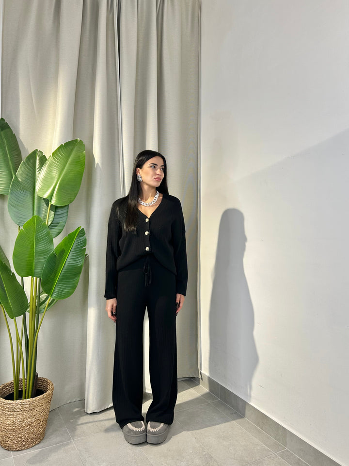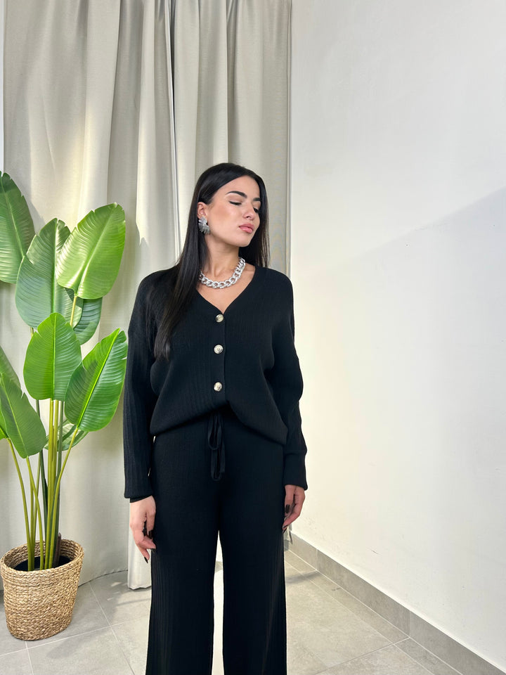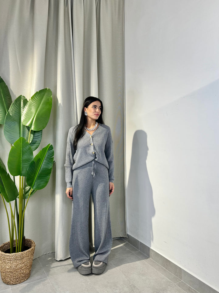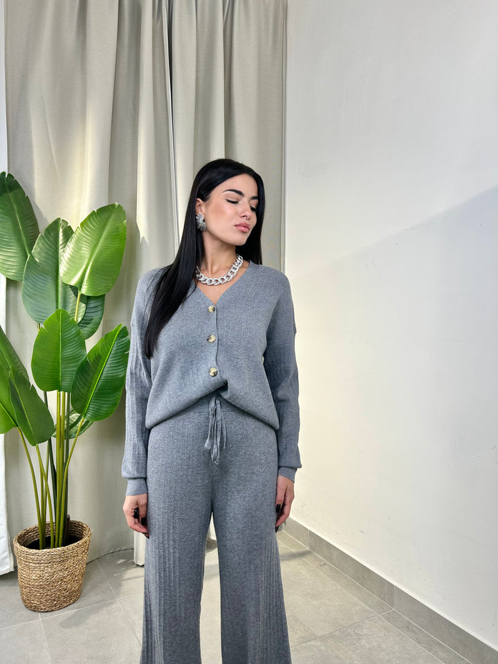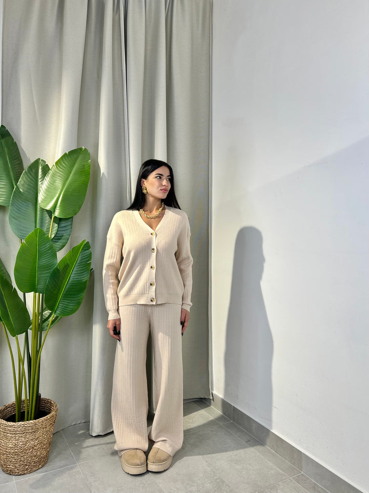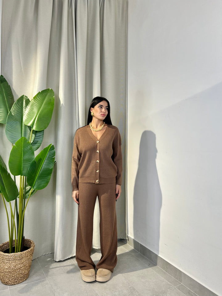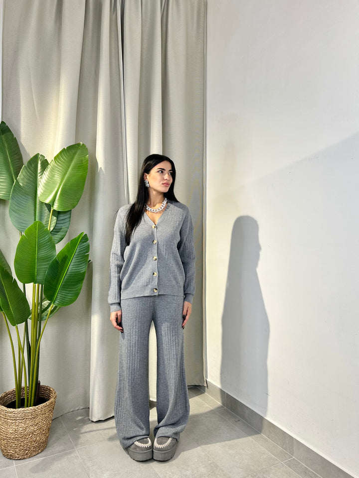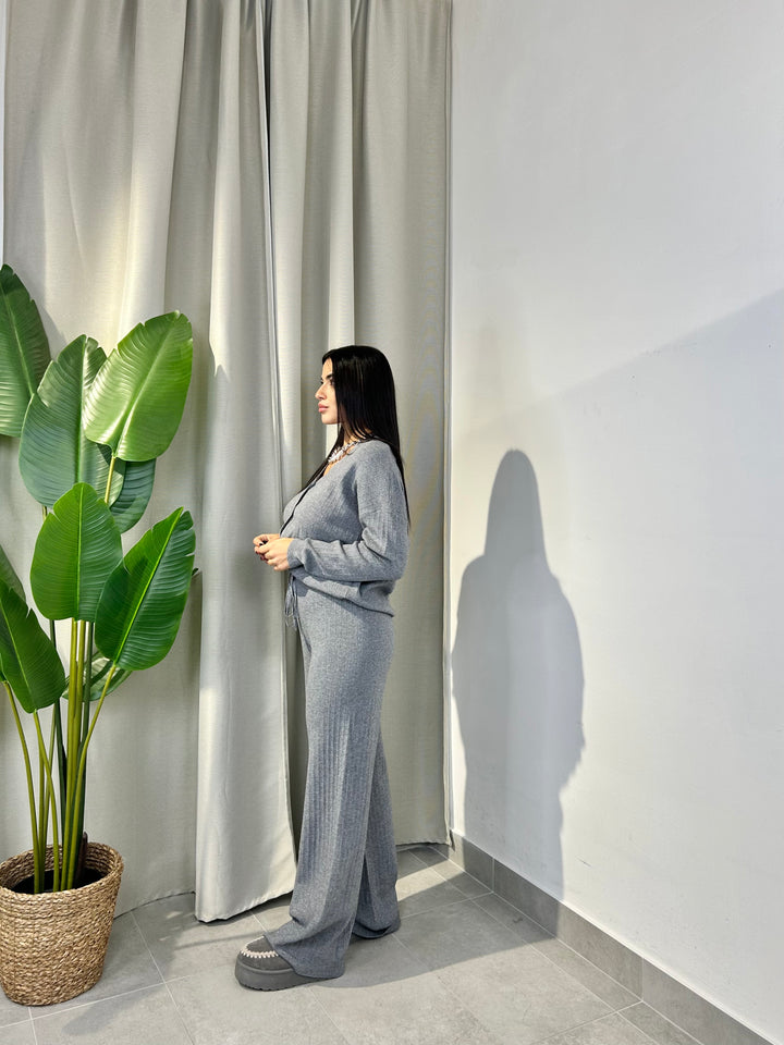 -Coordinato in lana rasata effetto lurex composto da Cardigan over+Pantalone palazzo con coulisse regolabile in vita;