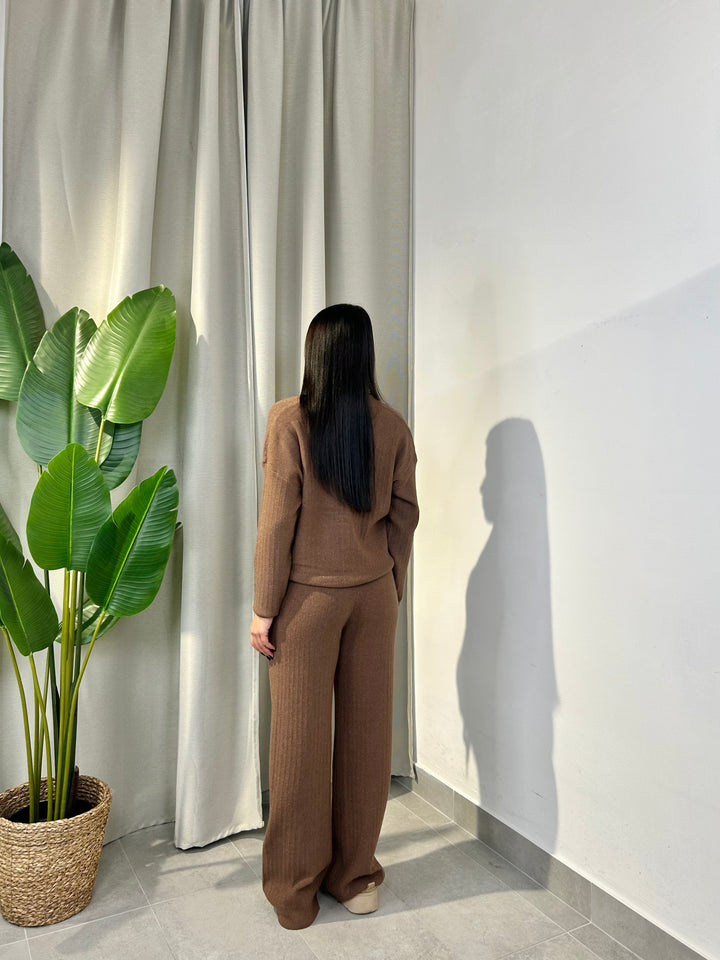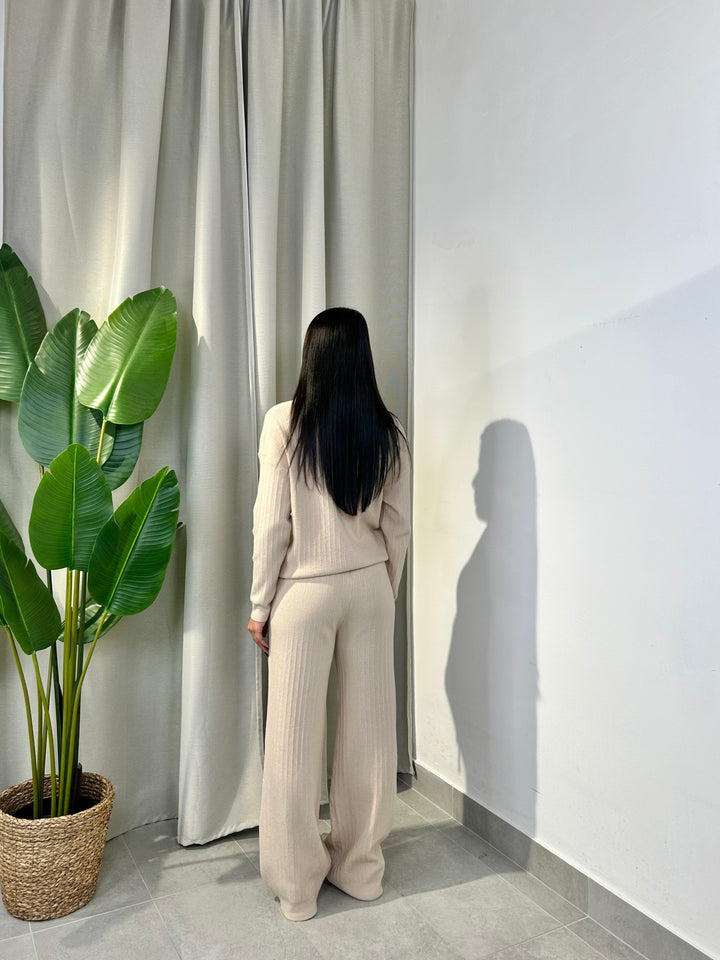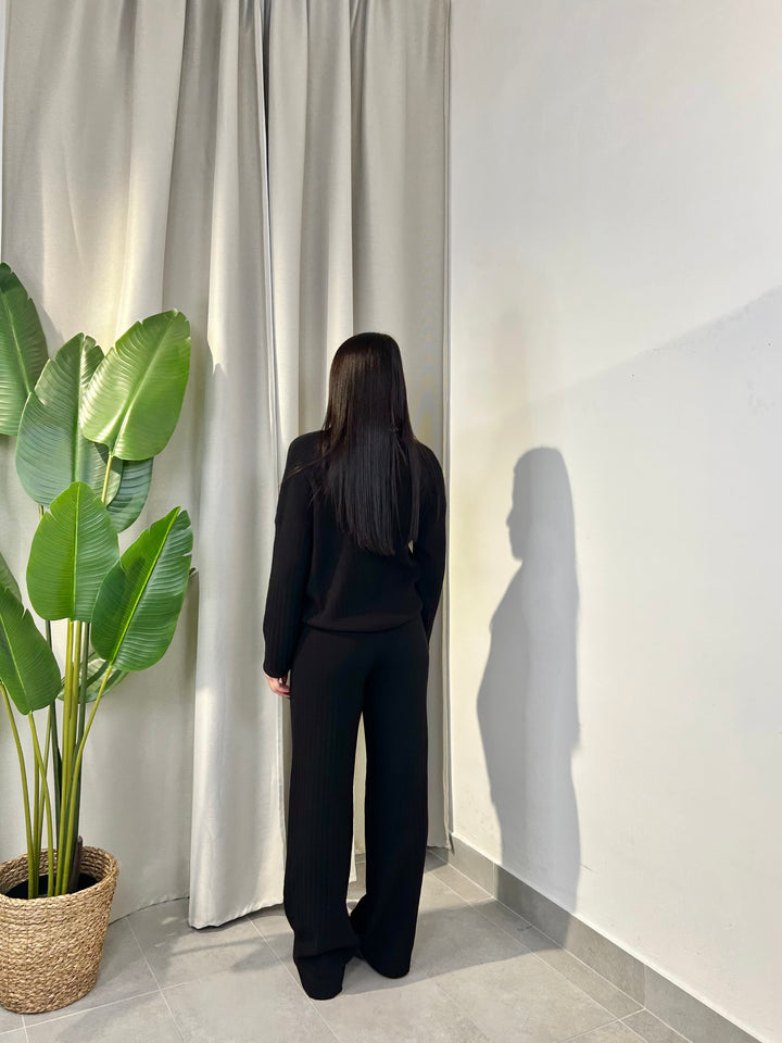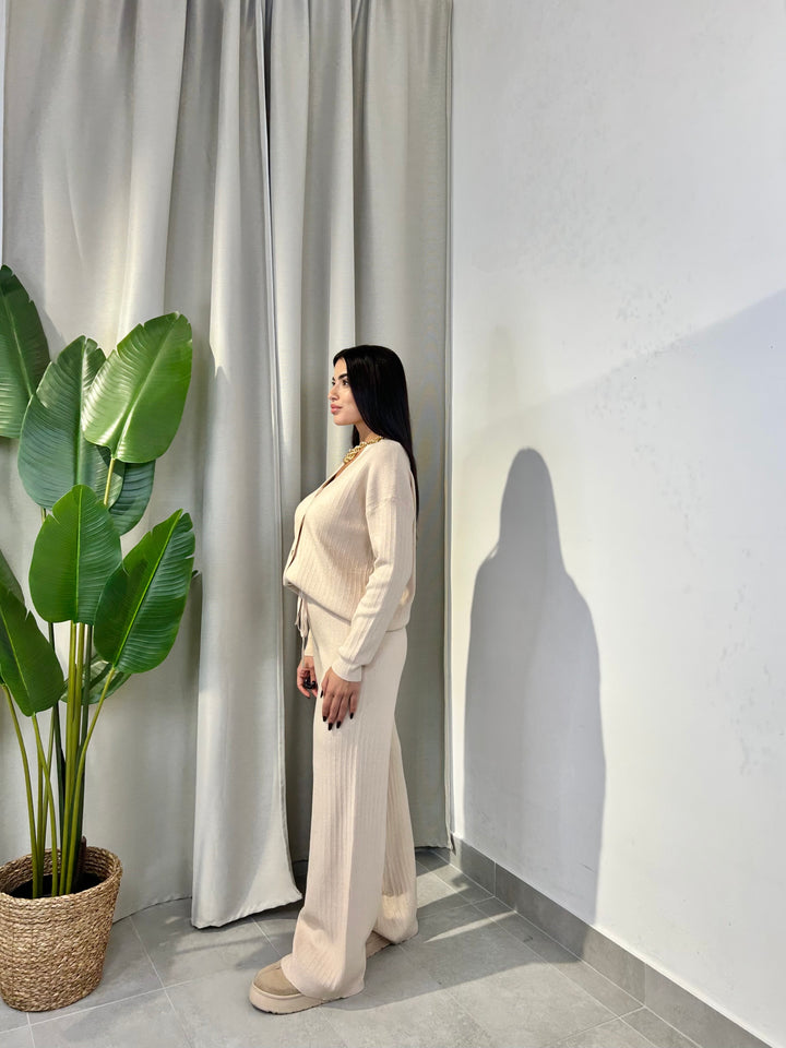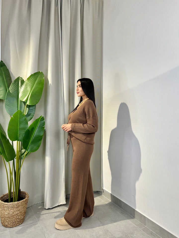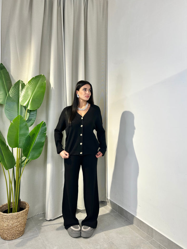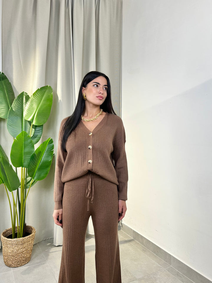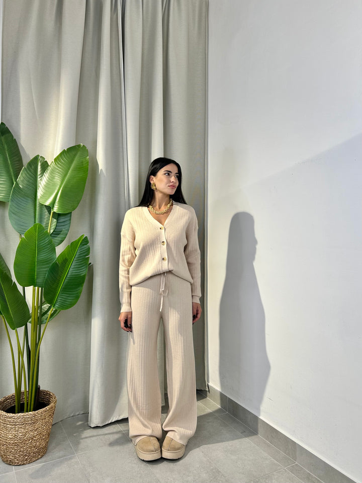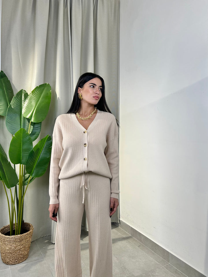-Coordinato in lana rasata effetto lurex composto da Cardigan over+Pantalone palazzo con coulisse regolabile in vita;