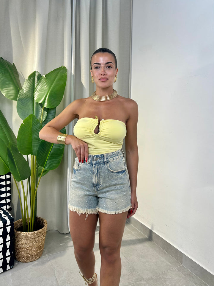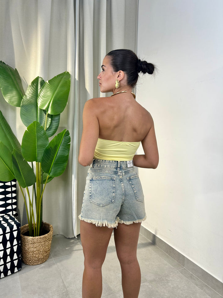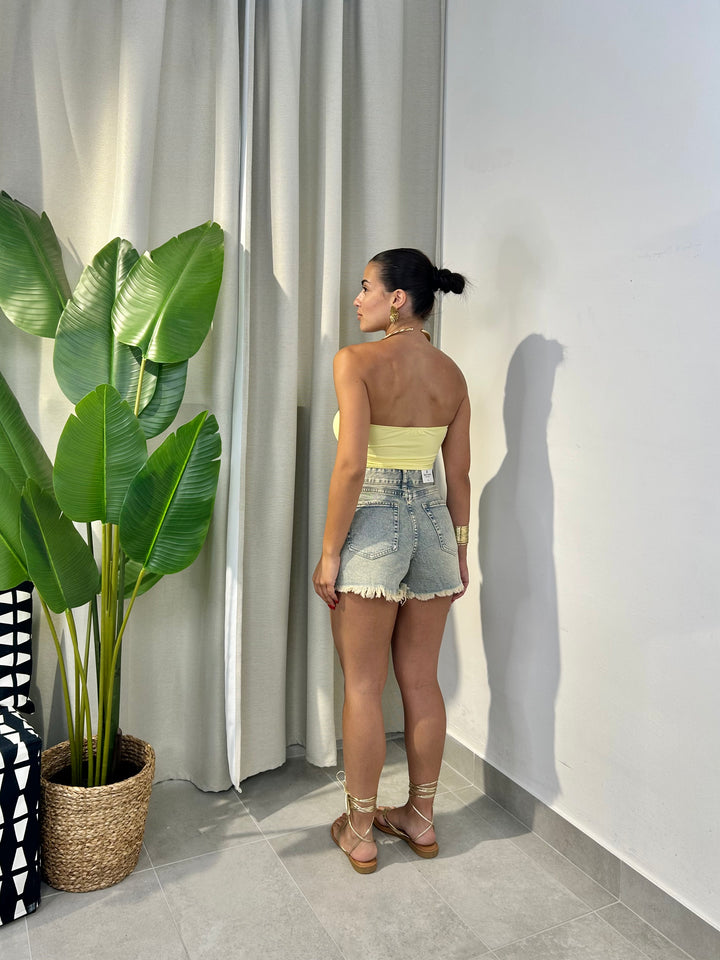 -Shorts in denim effetto sabbiato con mini Swarovski all’interno;