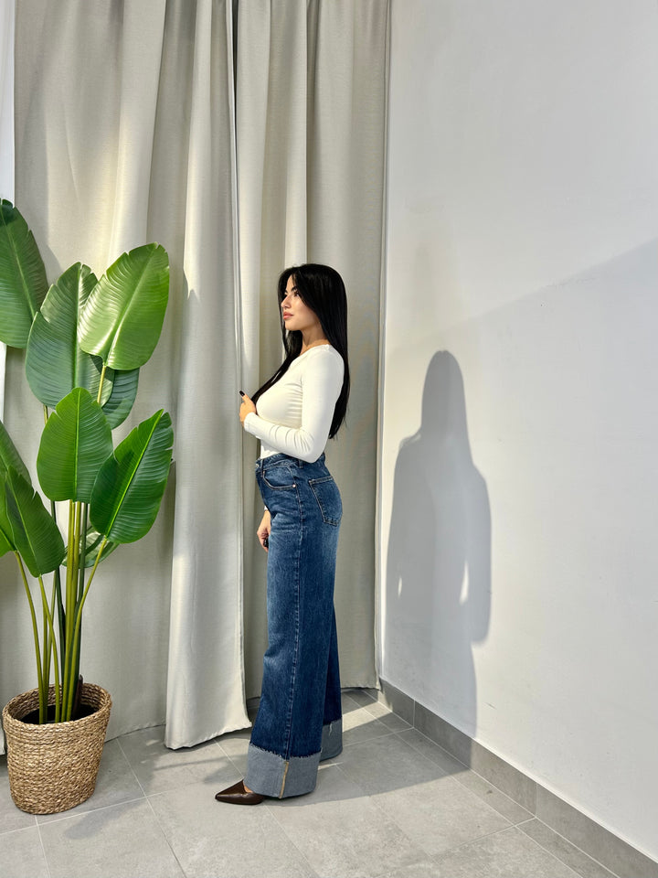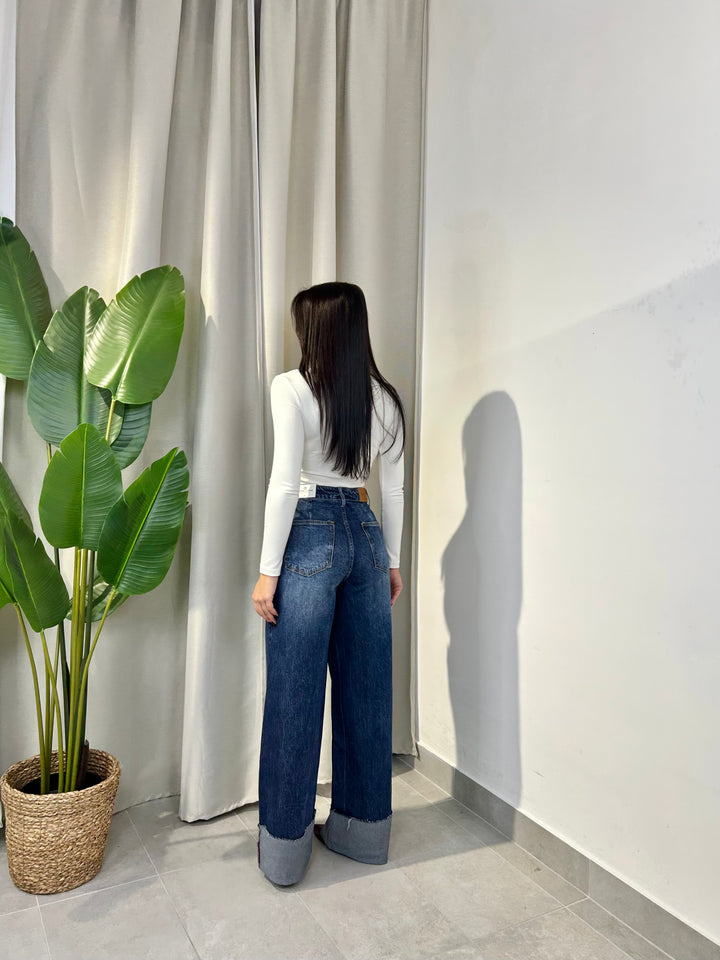 -Jeans Mod.Palazzo con piegone cucito sul finale;
