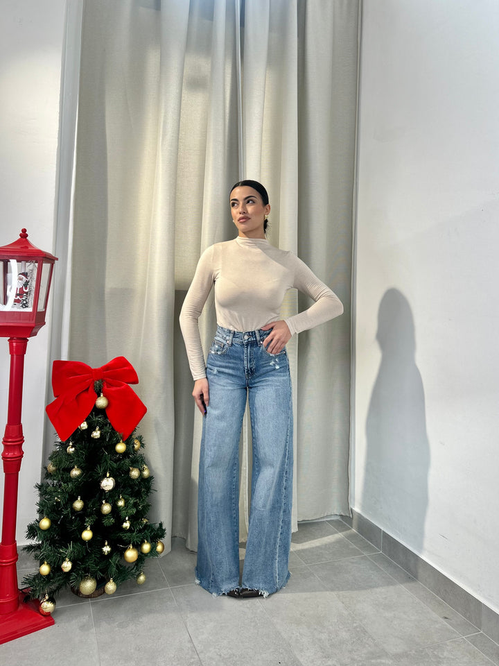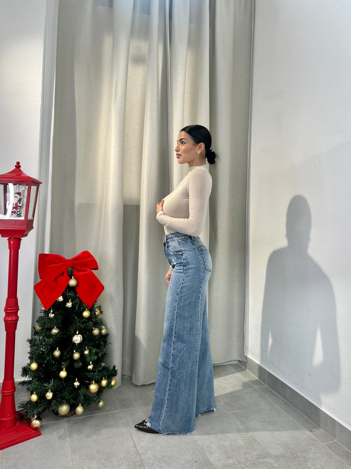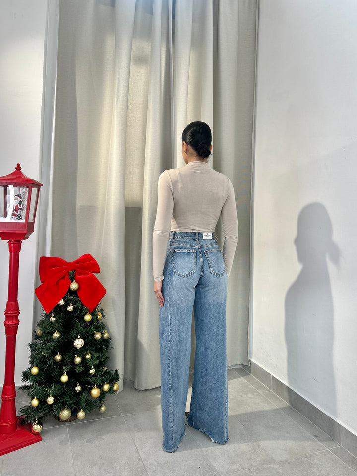 -Jeans Mod.Palazzo vita alta con taglio vivo sul finale in tela ferma;
