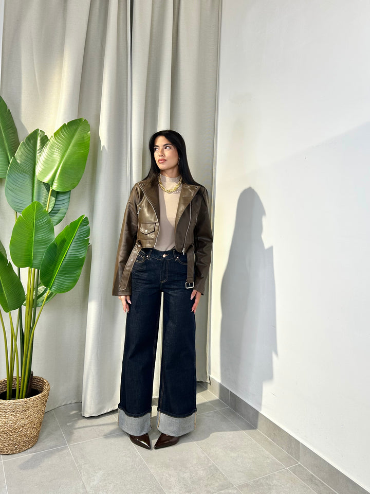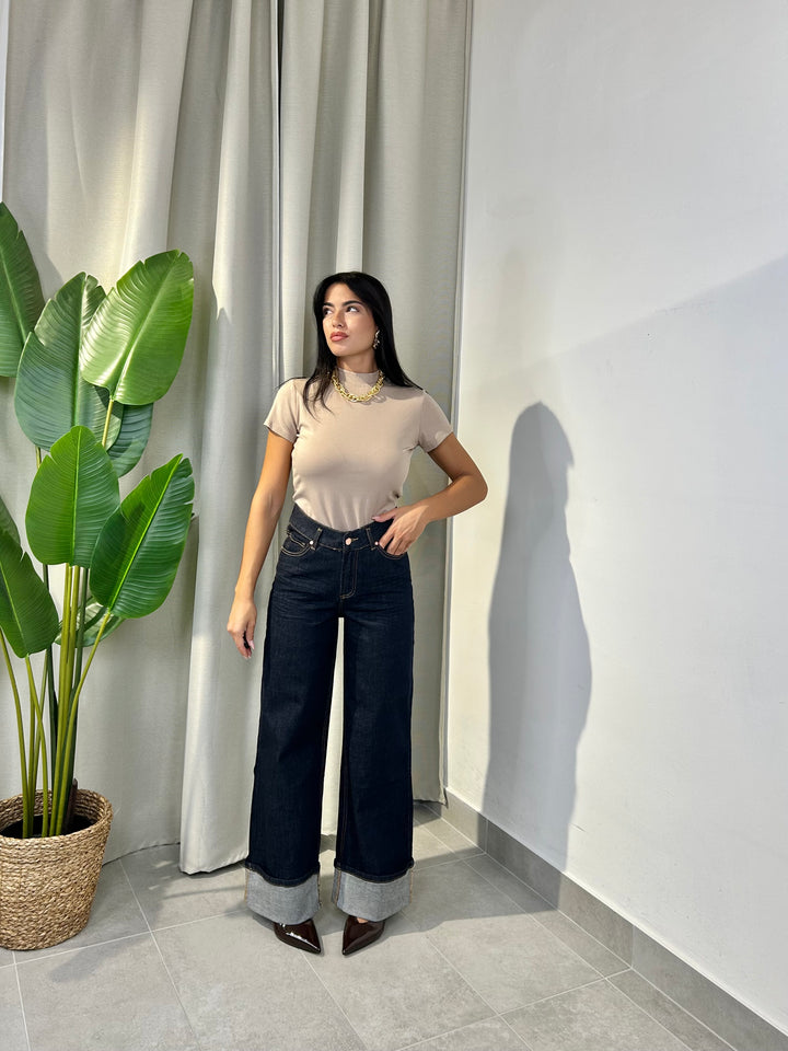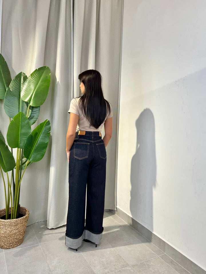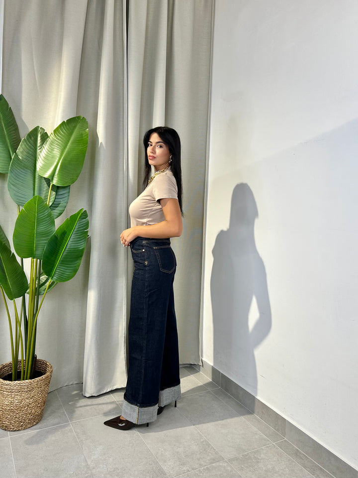 -Jeans palazzo con piegone cucito sul fondo;