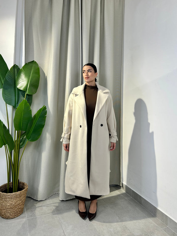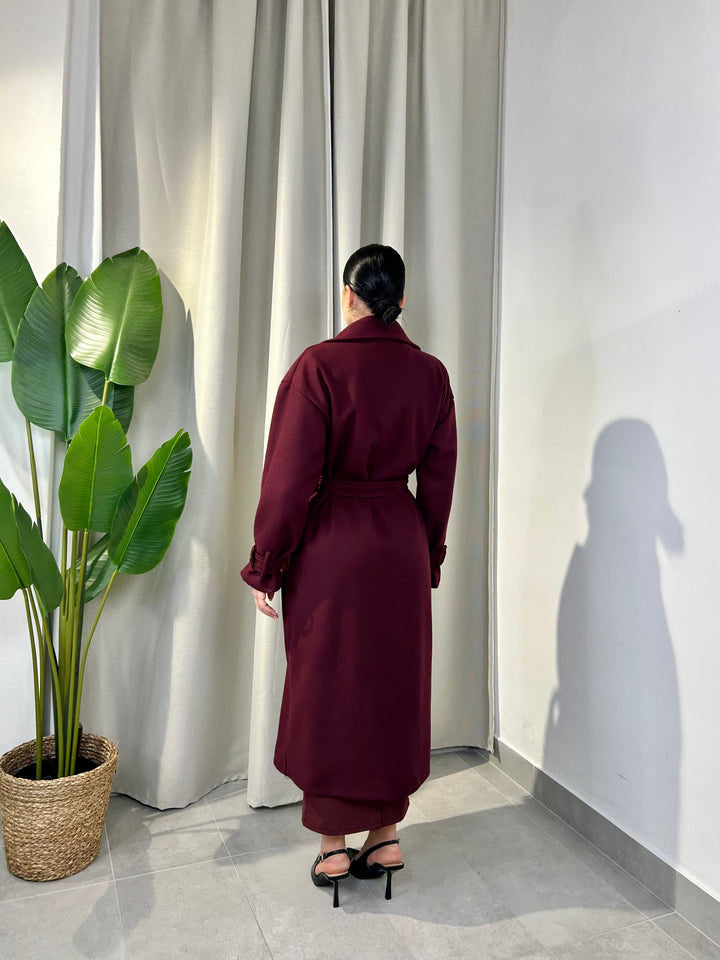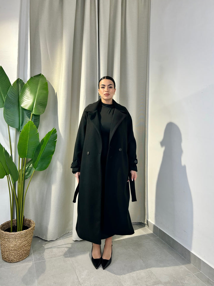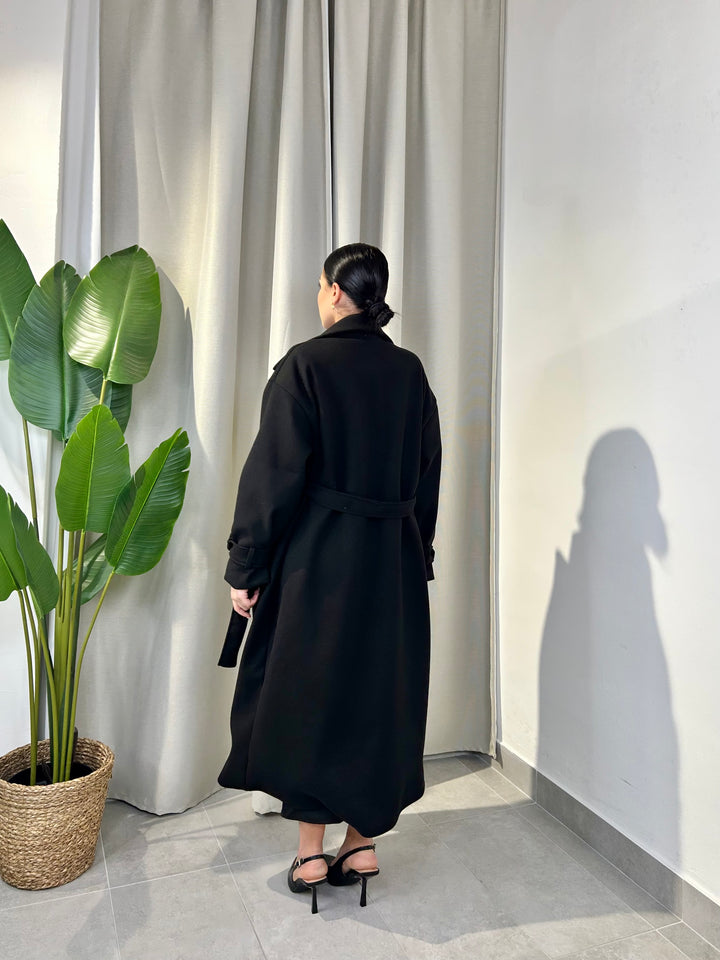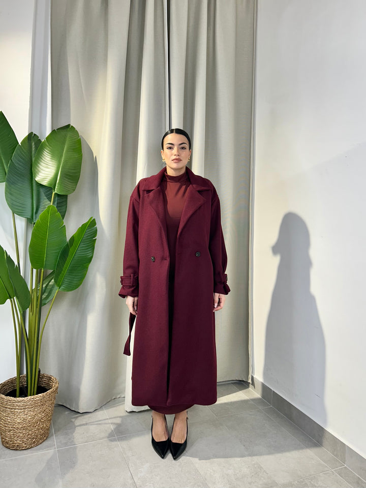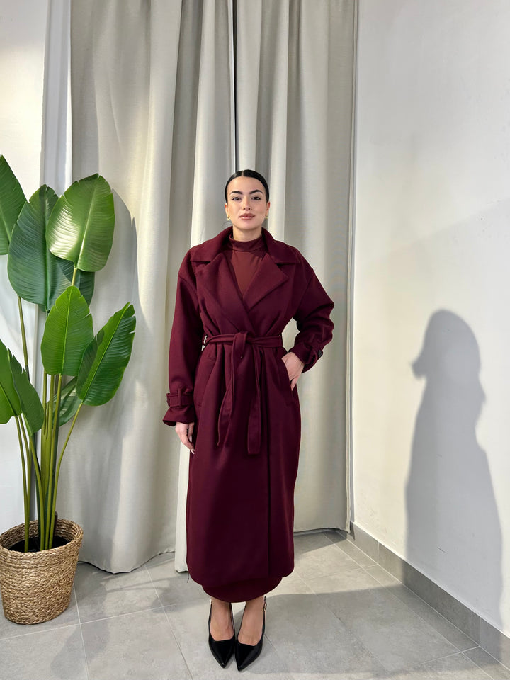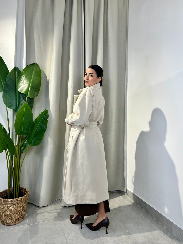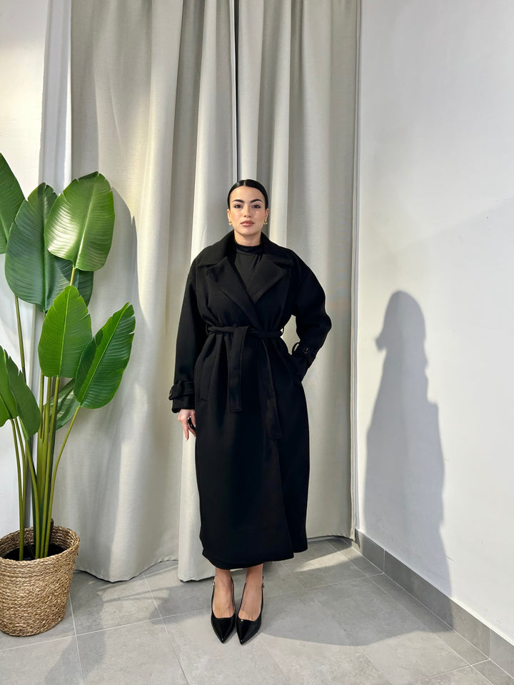 -Cappotto in panno con cintura in vita foderato all’interno;