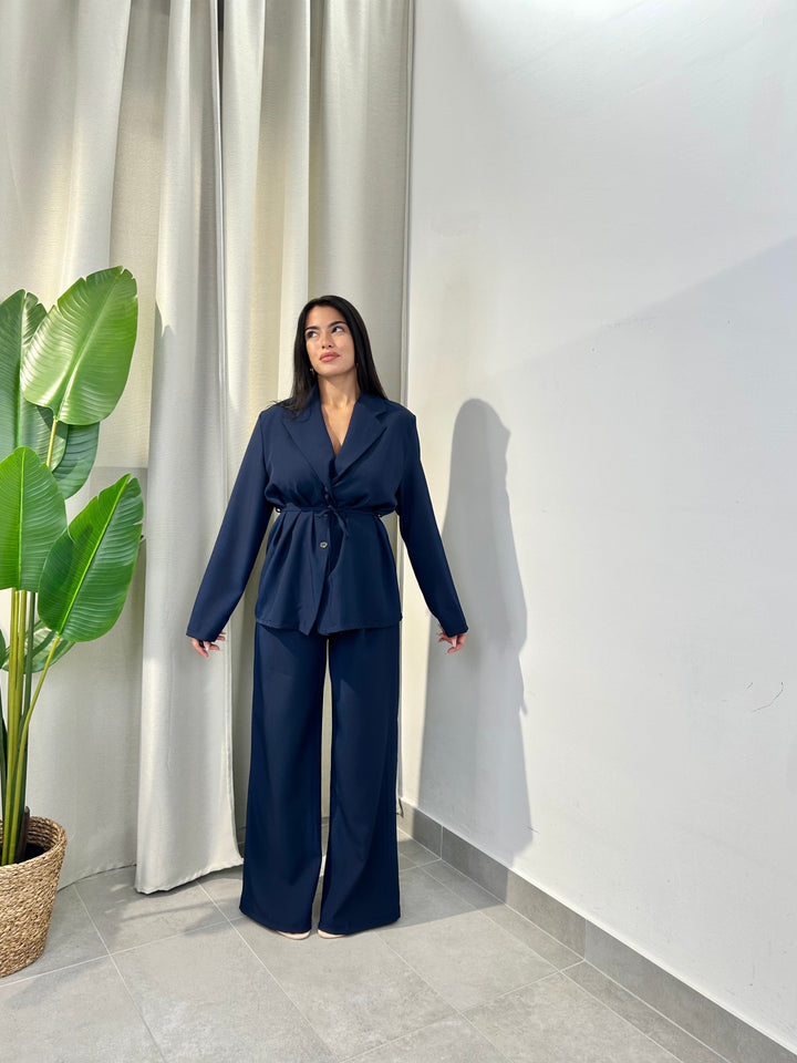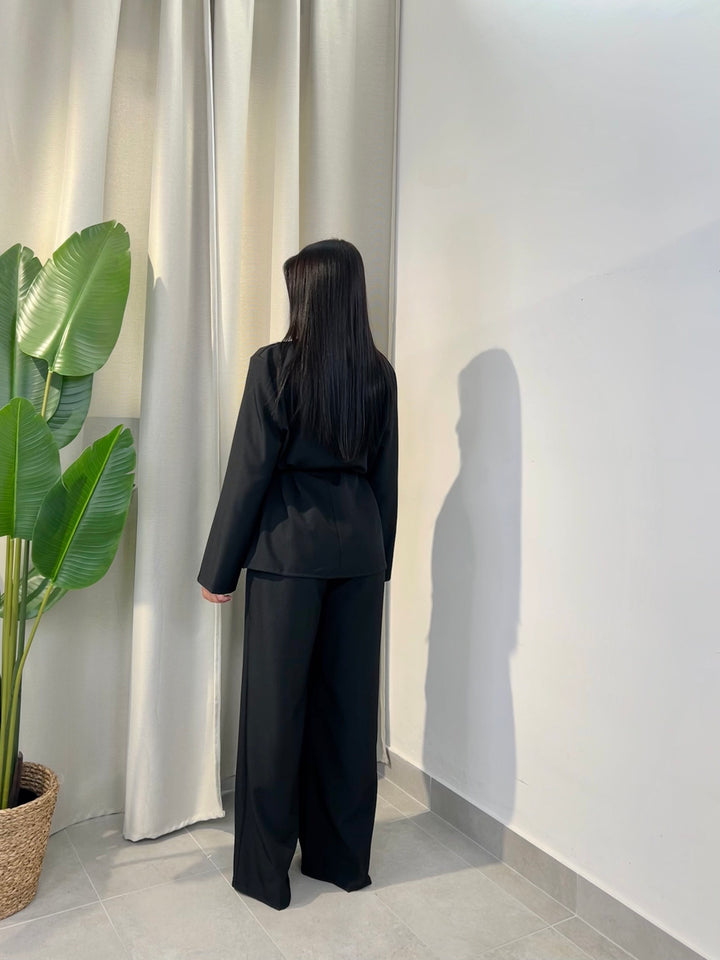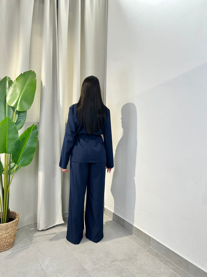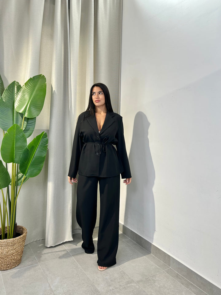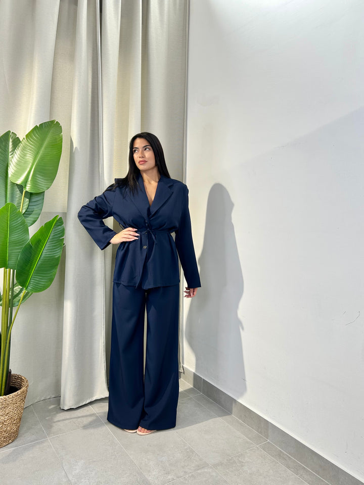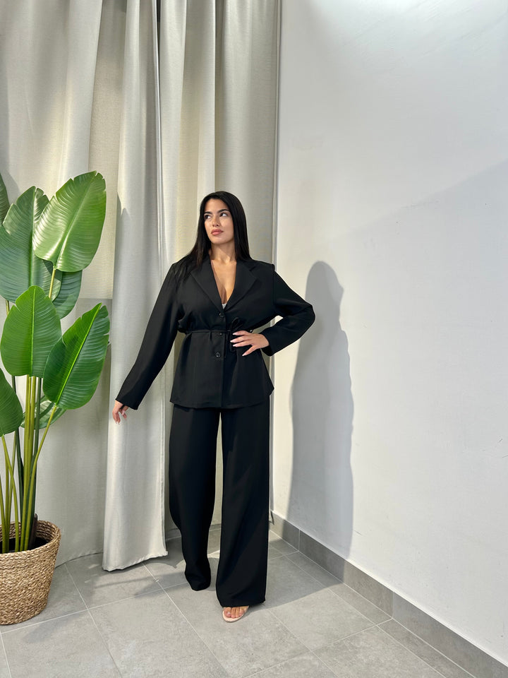 -Coordinato composto da Giacca/Camicia con cinturino in vita+Pantalone palazzo con bottone in vita ed elastico sul retro;