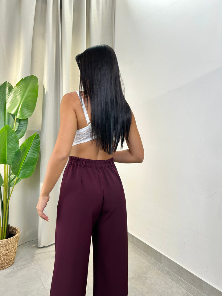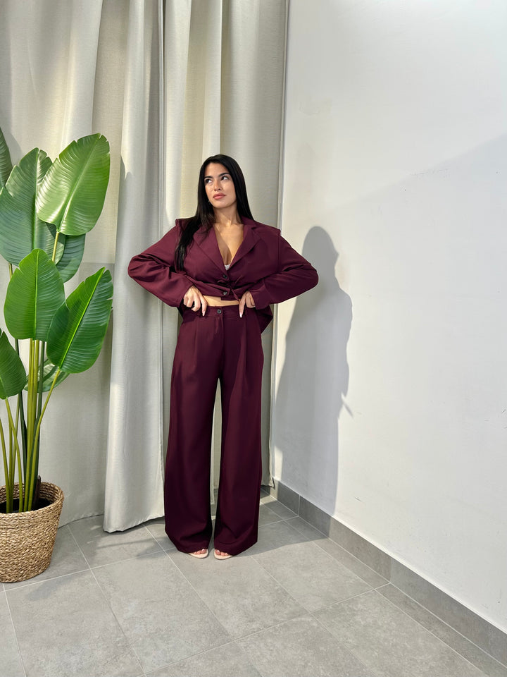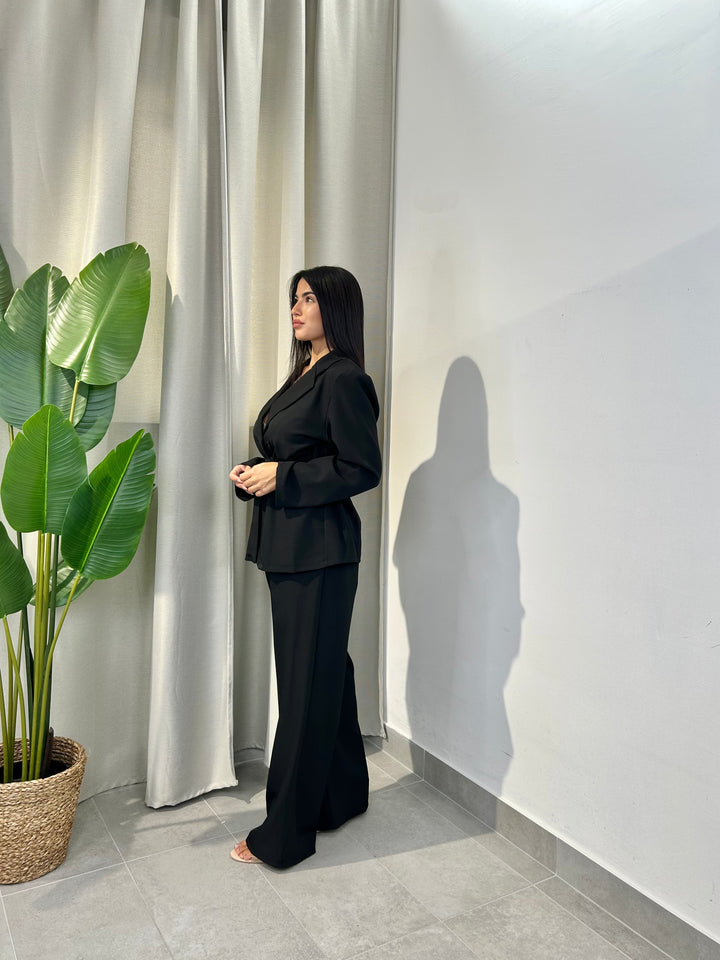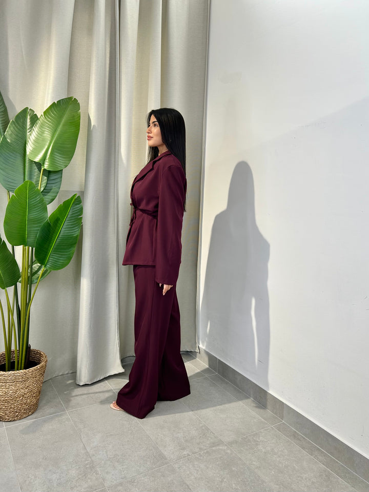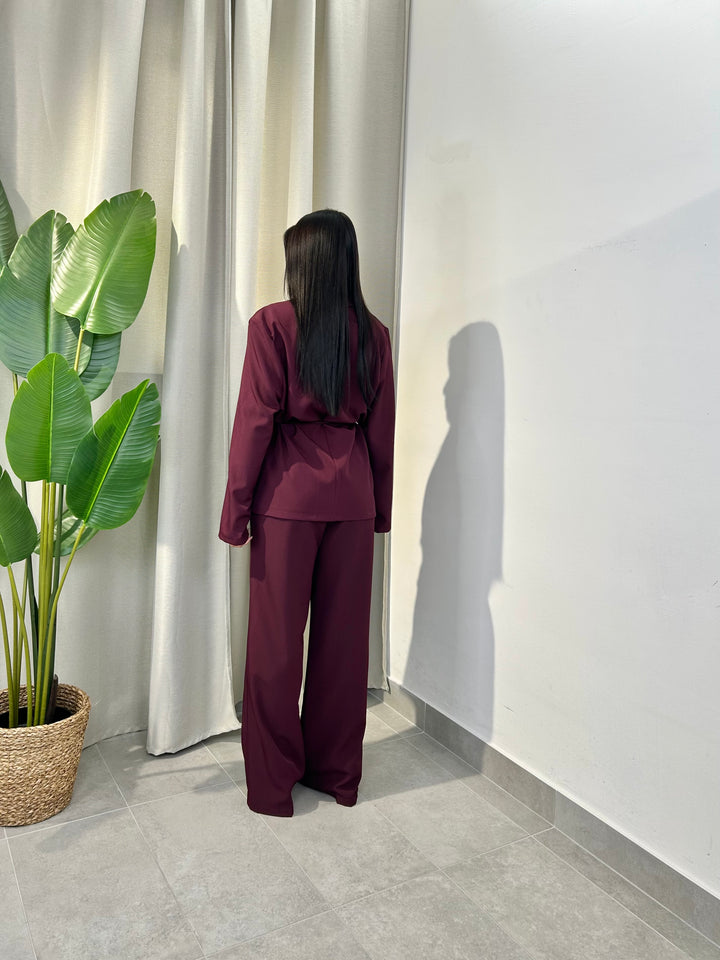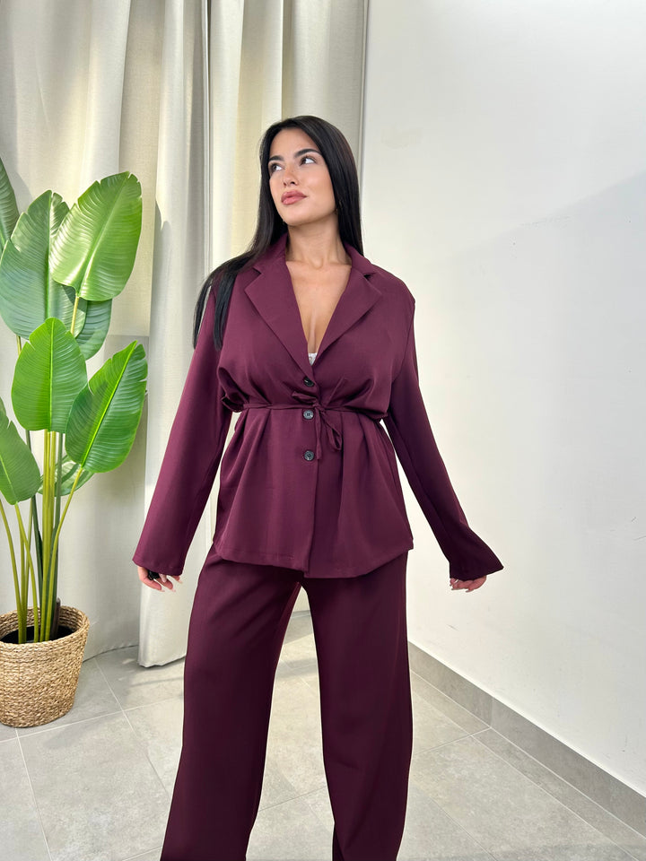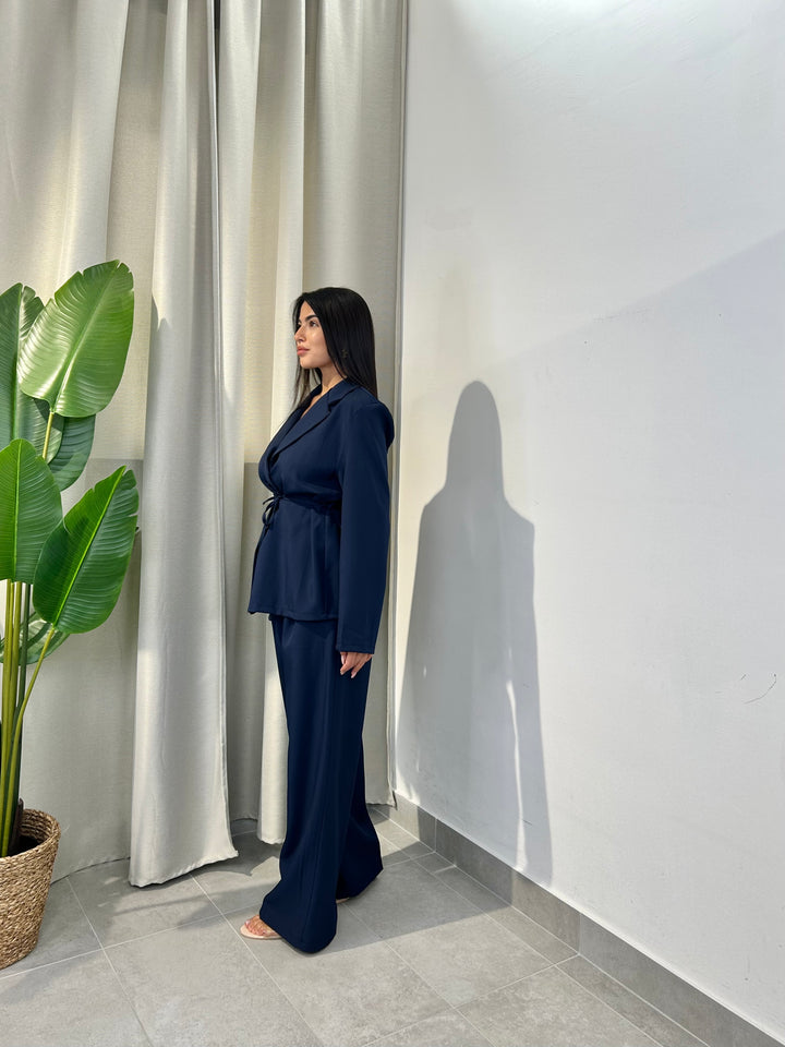 -Coordinato composto da Giacca/Camicia con cinturino in vita+Pantalone palazzo con bottone in vita ed elastico sul retro;