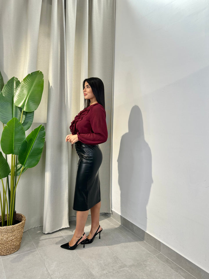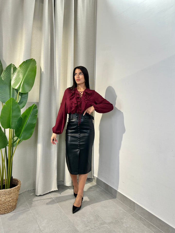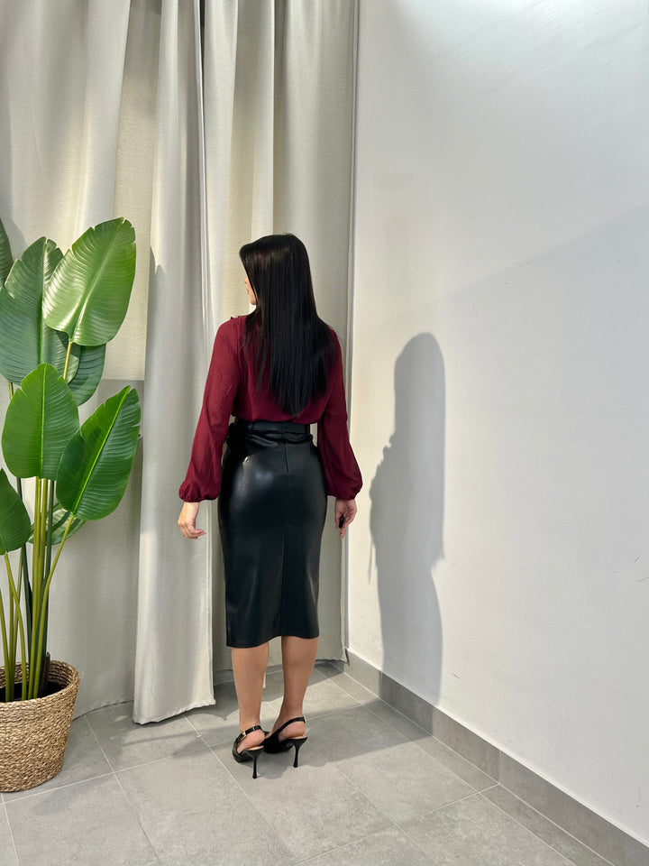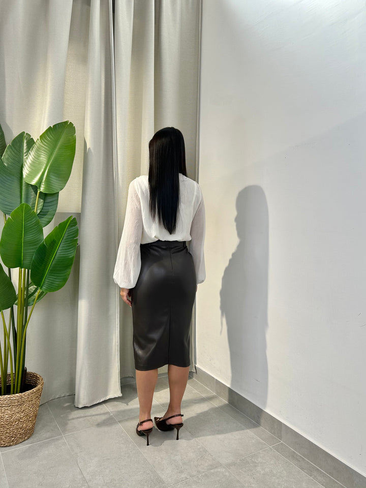 -Longuette in ecopelle vita alta con finti bottoni davanti e leggero spacco;Compresa di cintura in vita e zip sul retro;