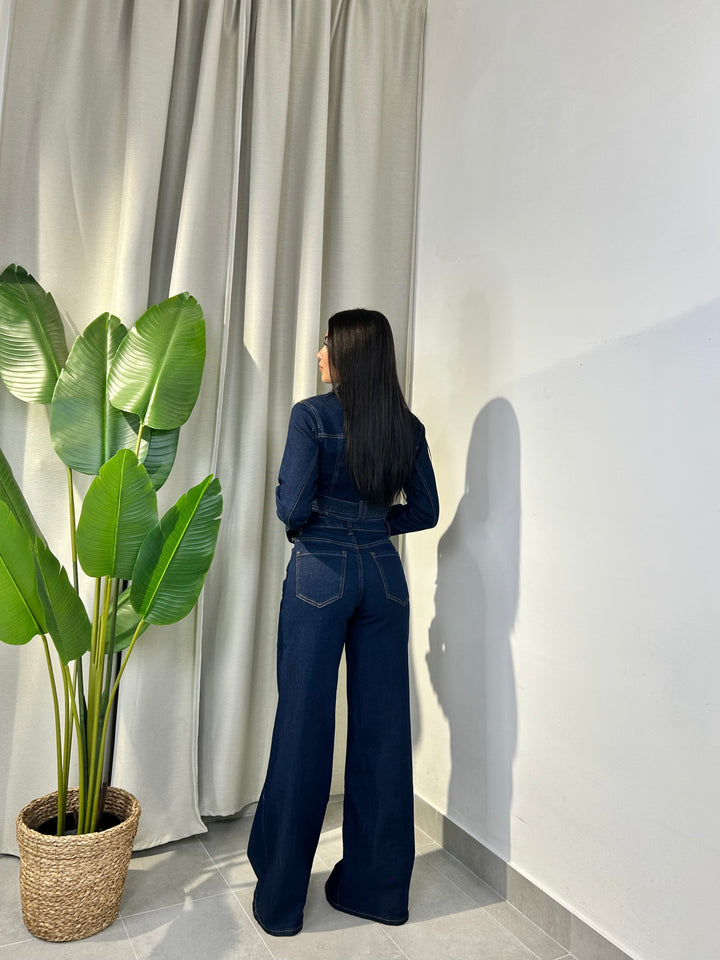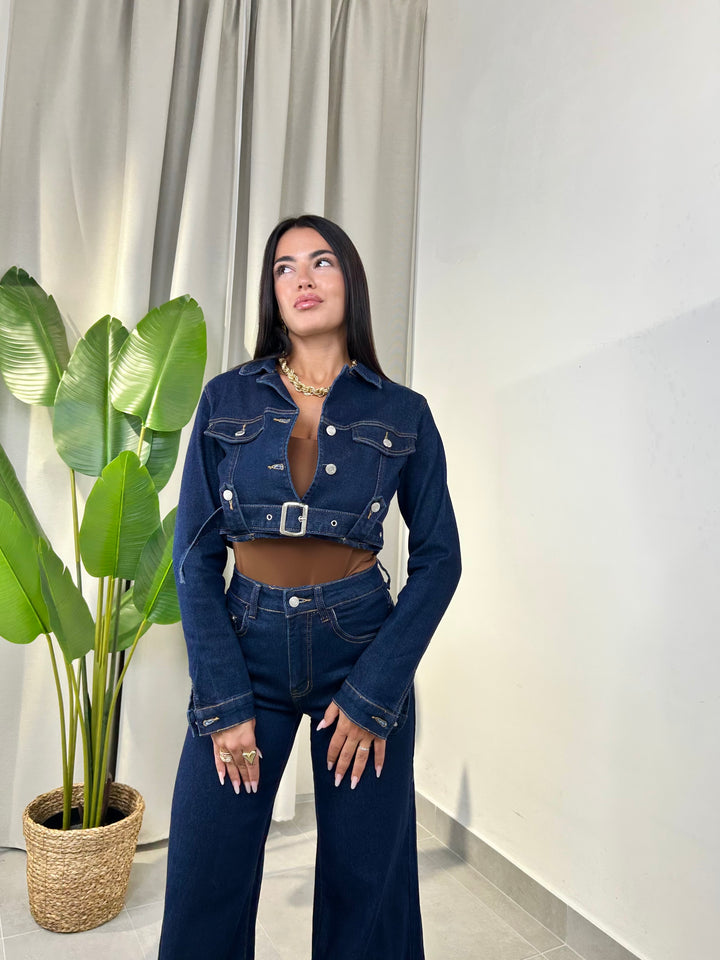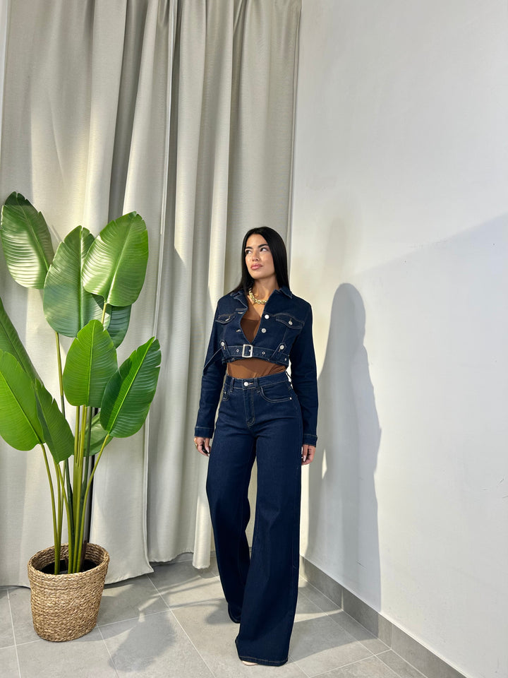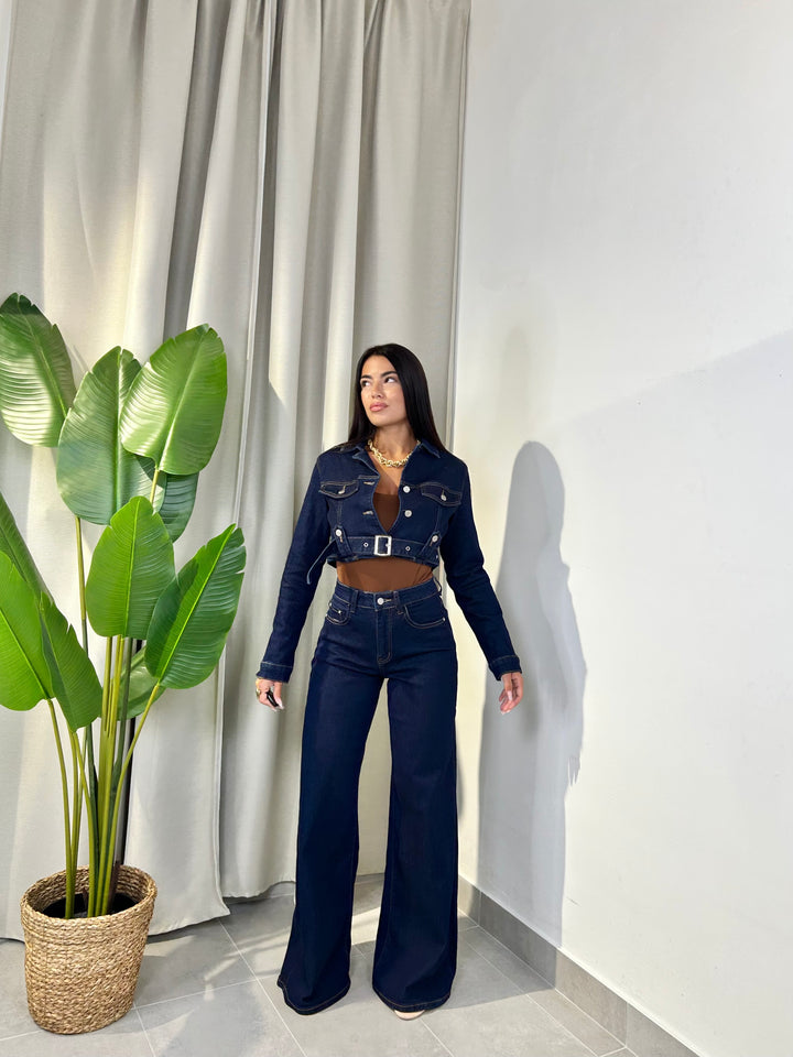 -Coordinato in denim composto da Giubbotto crop con cintura+Jeans vita alta modello palazzo;